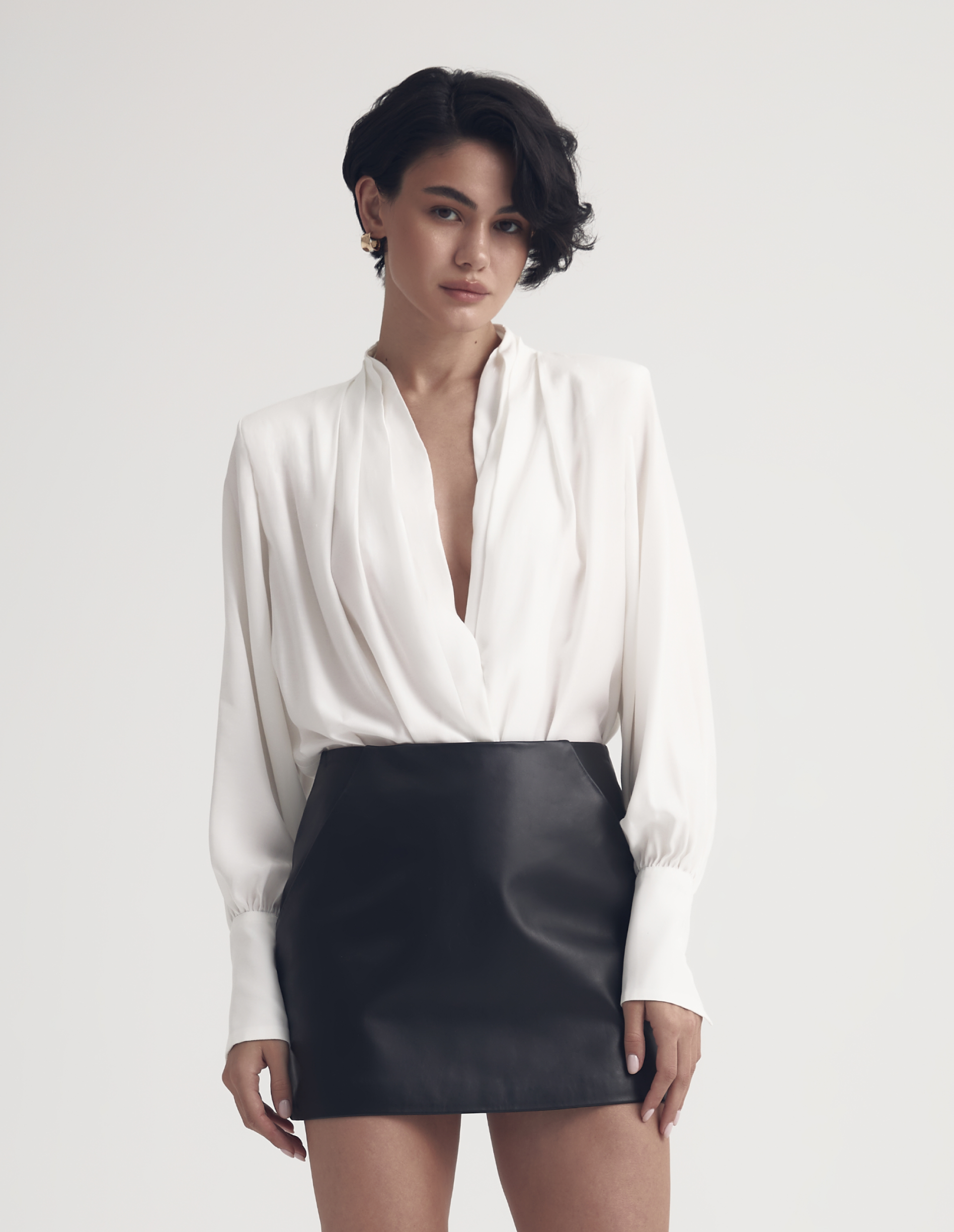 Белая блуза с глубоким декольте – безупречная деталь вечернего гардероба. Скрытые вшитые плечики образуют четкую плечевую линию, а крупные сборки от самой горловины образуют таинственный объем по всей длине изделия. Широкие узкие манжеты завершают пышные рукава. Заправленная при носке модель образует силуэт «тюльпан». Сочетайте блузу с мини-юбкой или шортами для создания романтичного коктейльного образа.