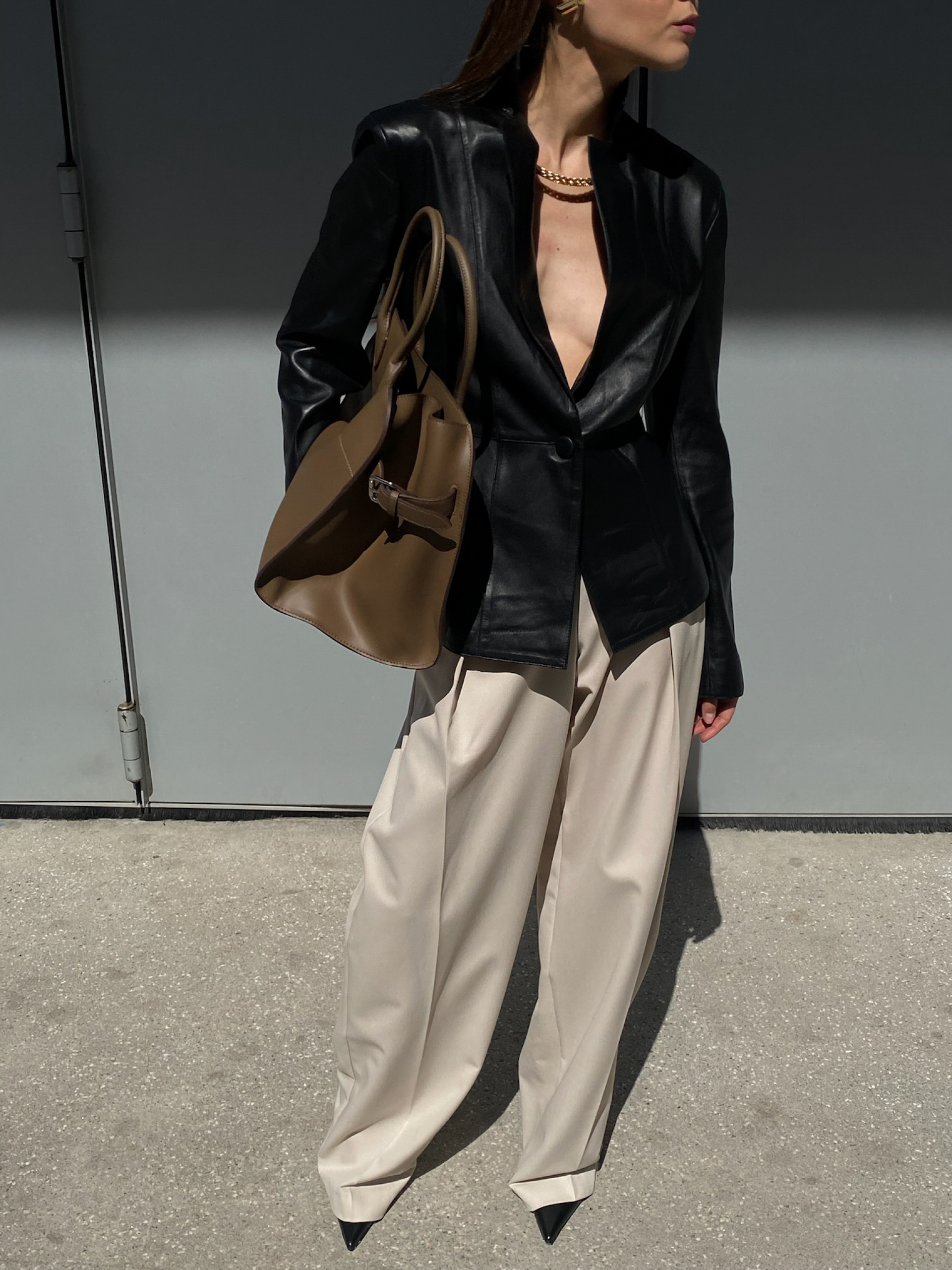 Кожаный жакет. Создайте контрастное сочетание между брюками палаццо в светлом пастельном оттенке и жакетом из натуральной кожи. Собираясь в офис, используйте в качестве нижнего слоя лаконичный топ, а для вечернего выхода можно надеть жакет на голое тело.