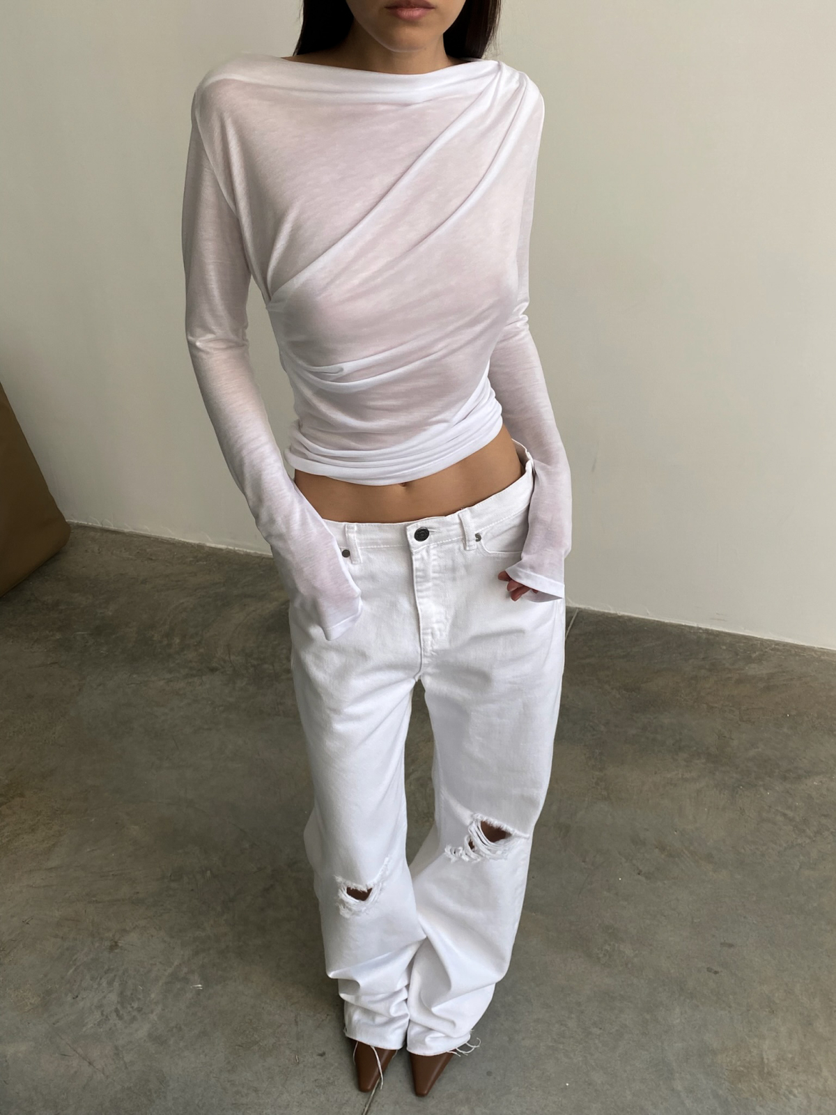 Полупрозрачный лонгслив – идеальный выбор для вечерних летних выходов. Сочетайте его с объемными белыми джинсами, юбками в пол и атрибутами делового гардероба – костюмными брюками и жакетами.