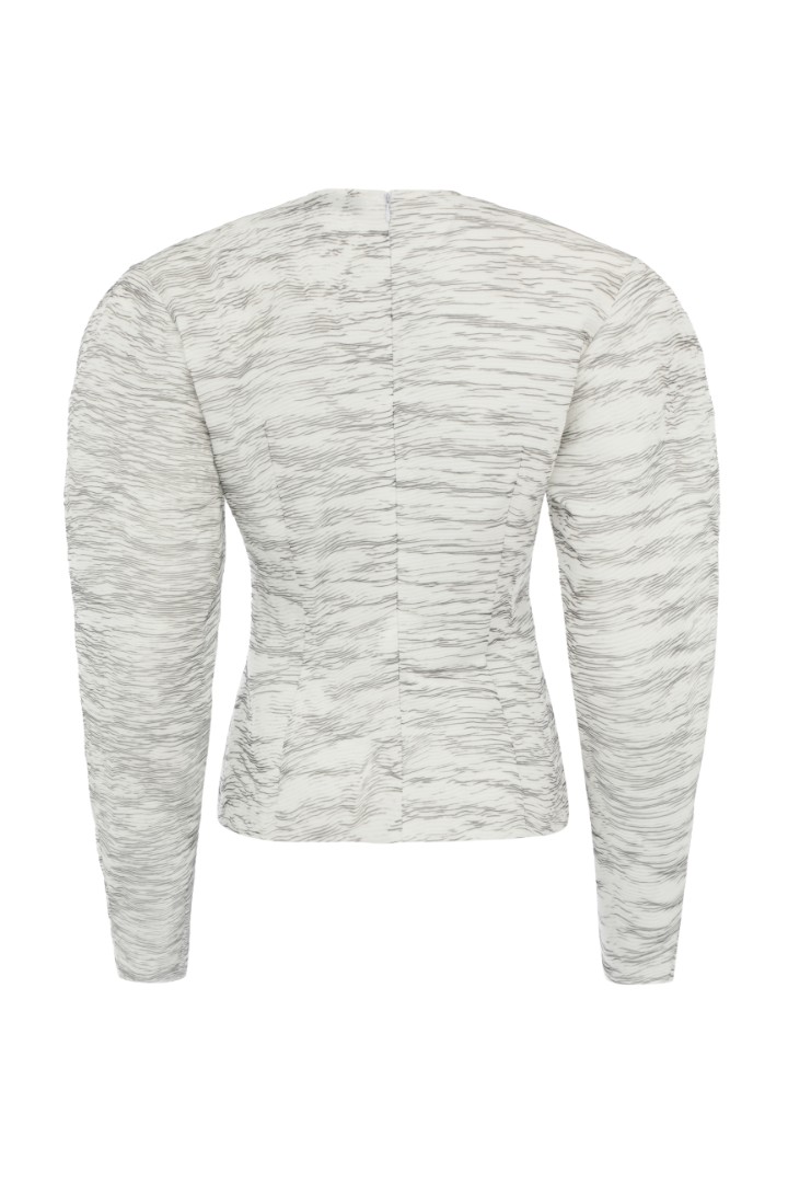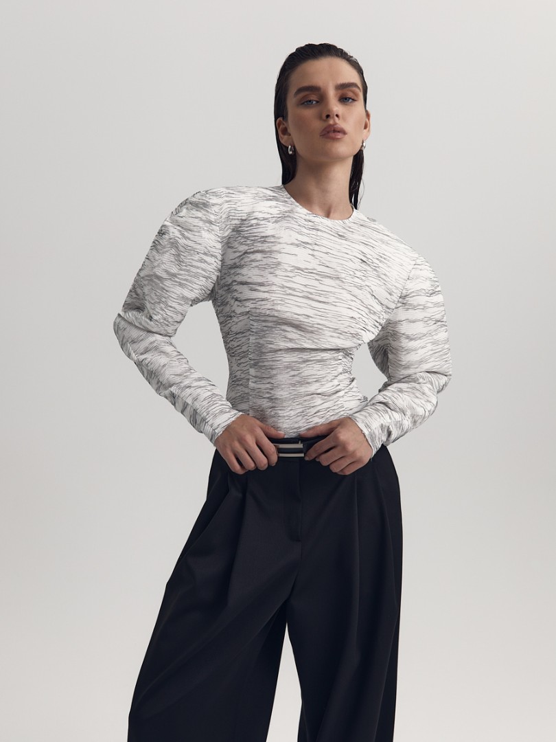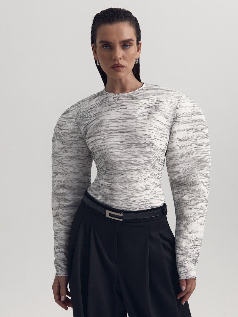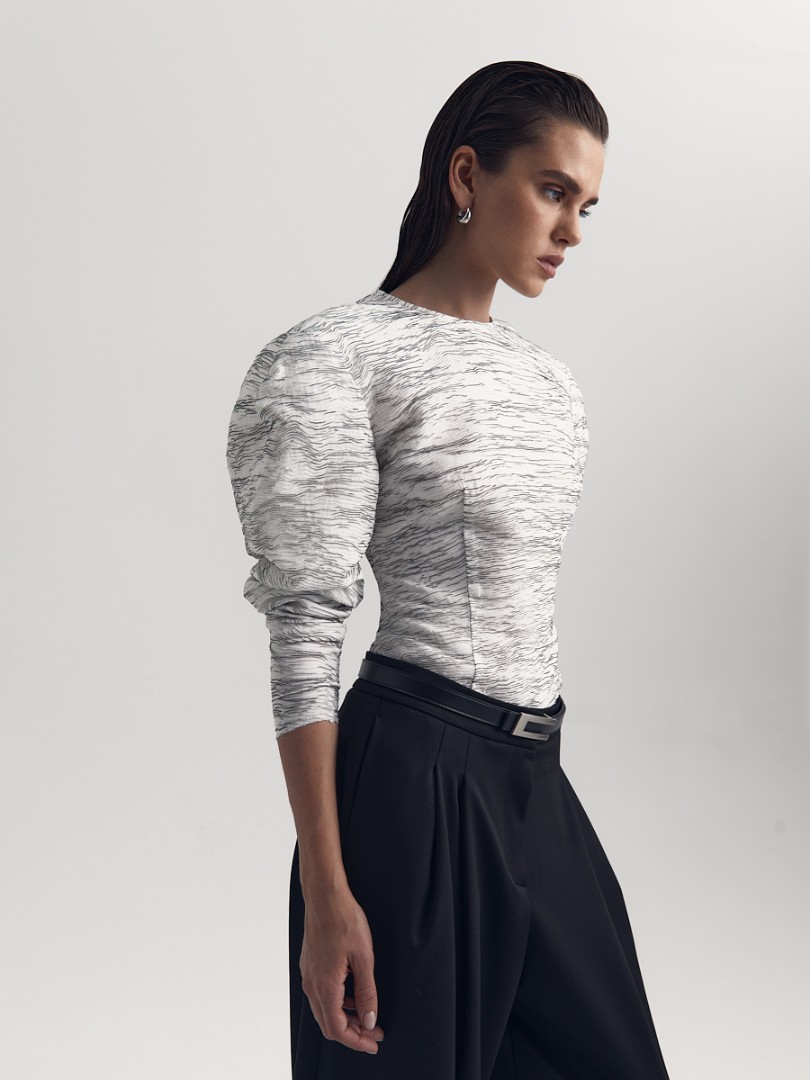 Блуза приталенного силуэта с необработанным нижним краем. Круглый вырез, объемная плечевая линия и вытачки в области талии для лучшей посадки по фигуре. Потайная застежка на молнию сзади.