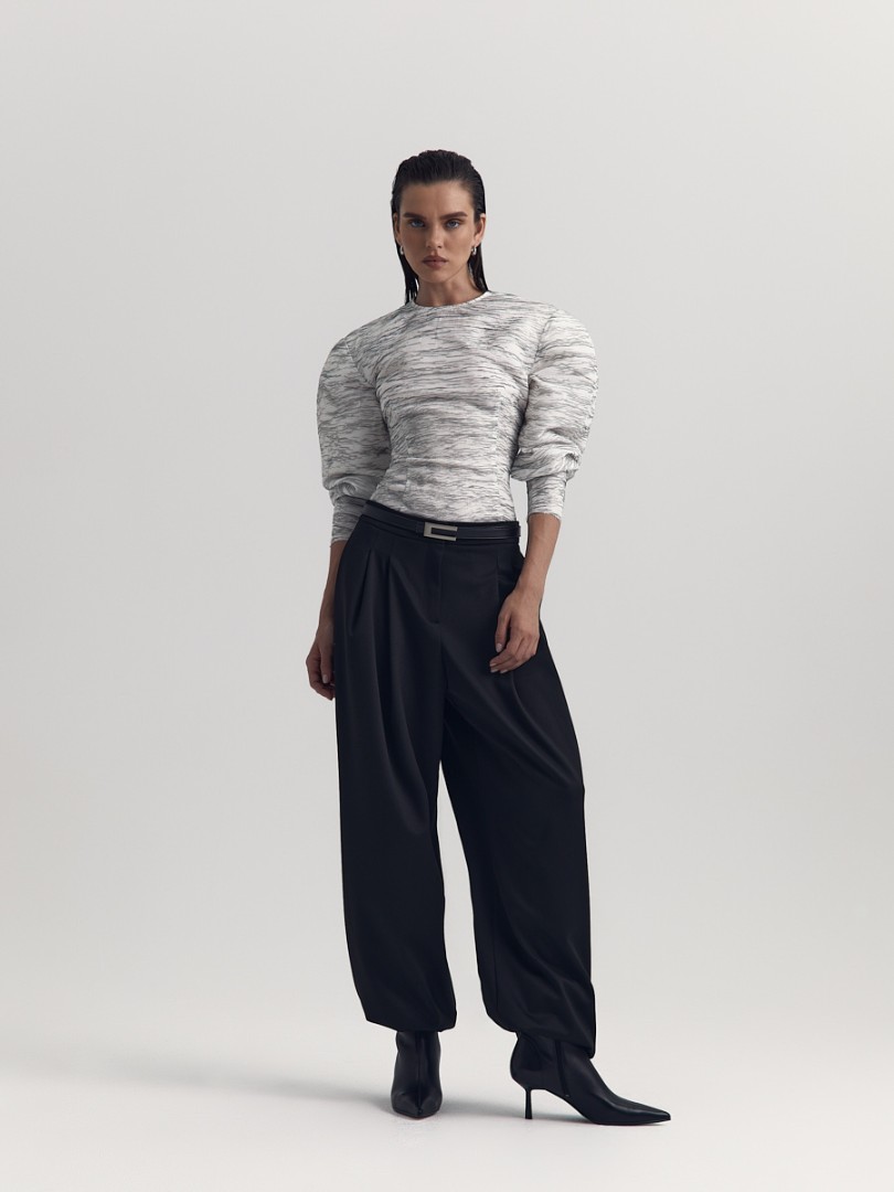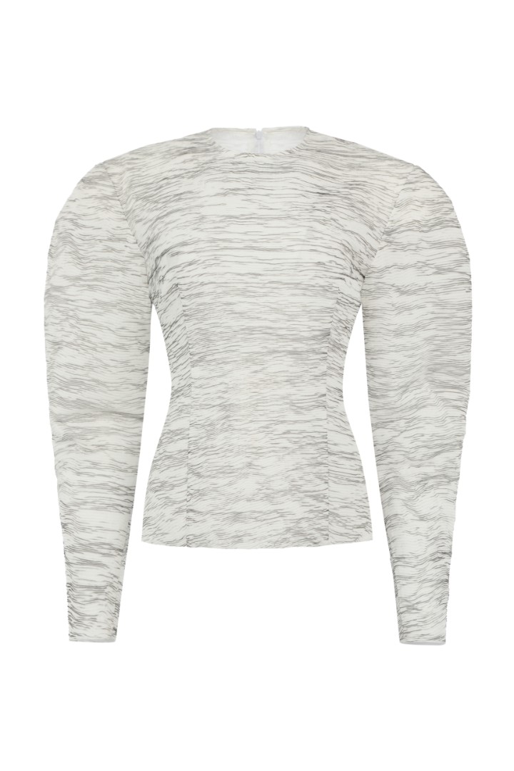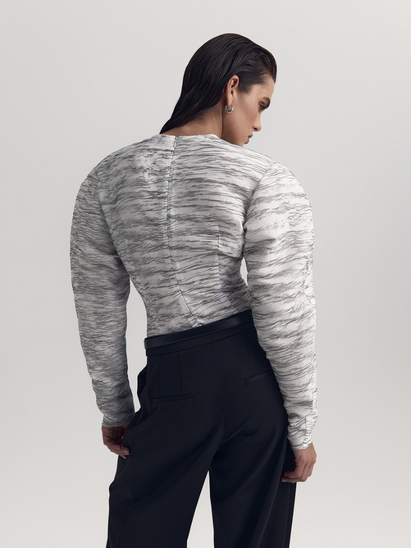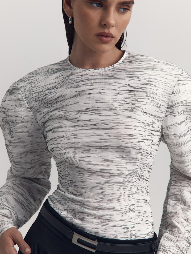 Блуза приталенного силуэта с необработанным нижним краем. Круглый вырез, объемная плечевая линия и вытачки в области талии для лучшей посадки по фигуре. Потайная застежка на молнию сзади.