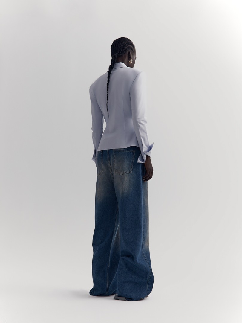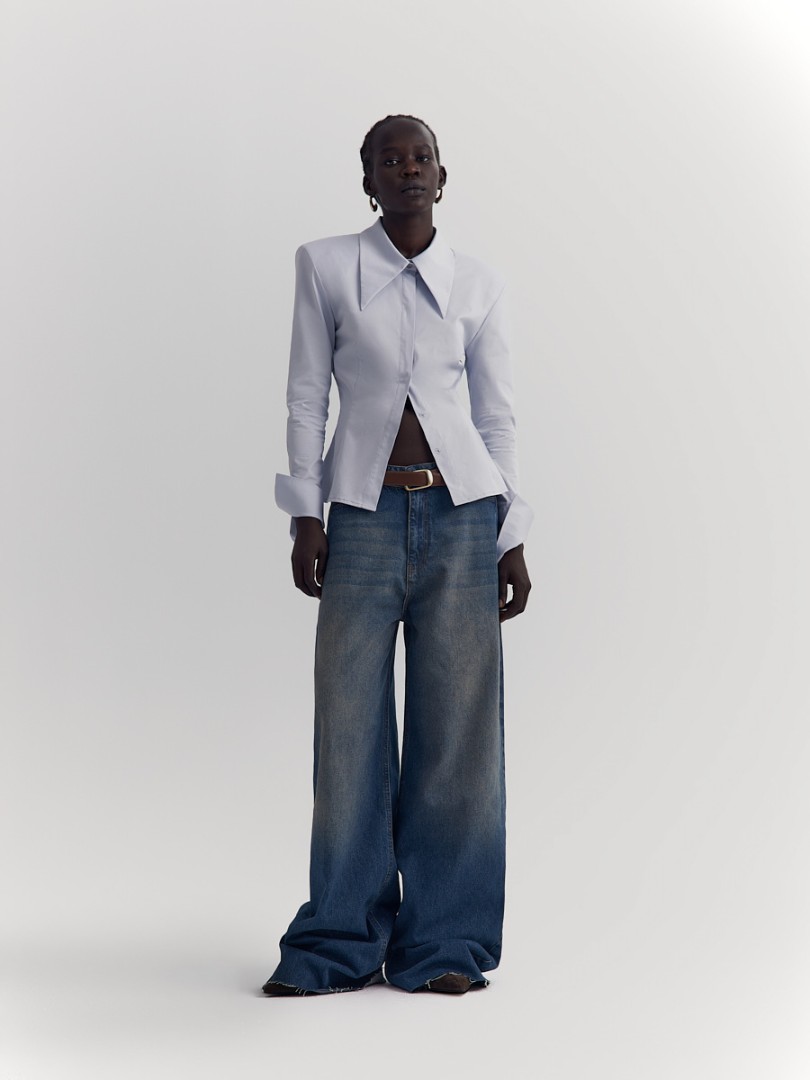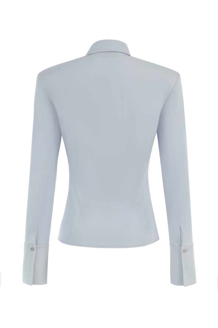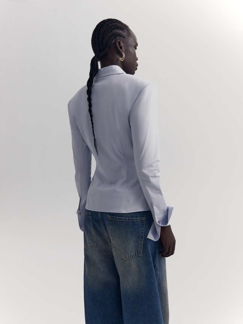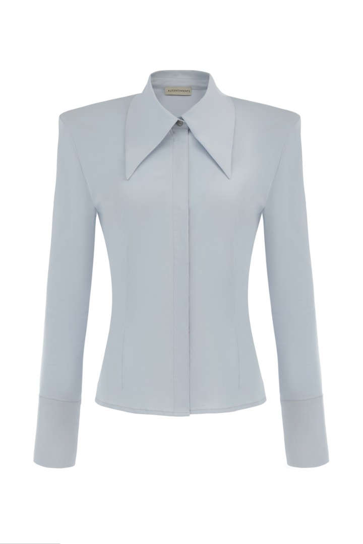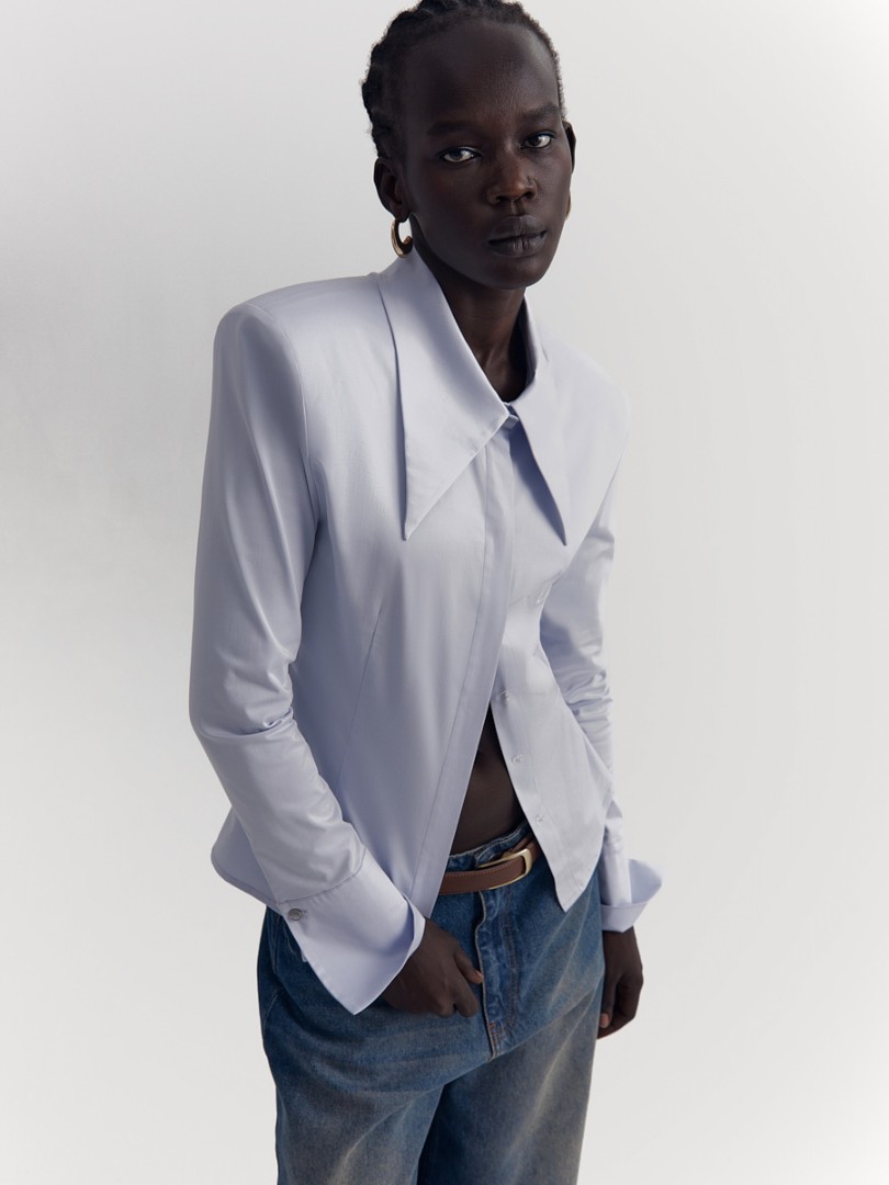 Рубашка приталенного кроя со вшитыми подплечниками. Широкие манжеты, удлиненный отложной воротник на стойке и супатная застежка на пуговицы.