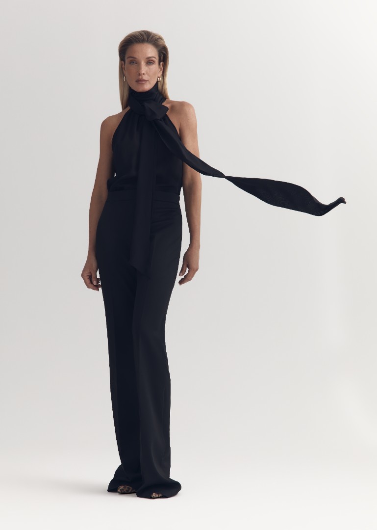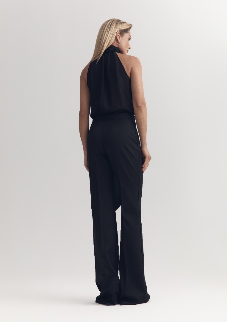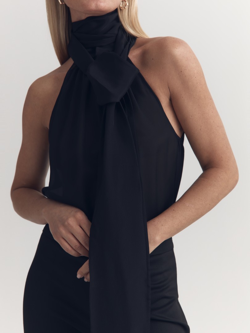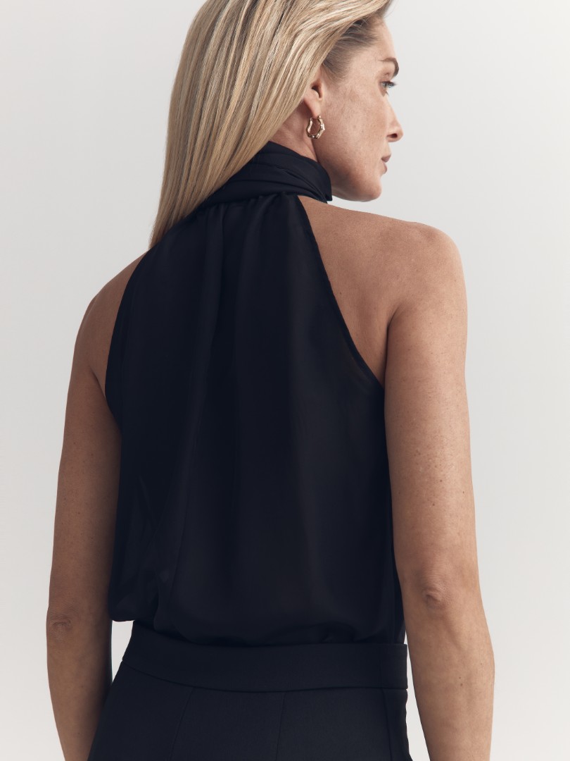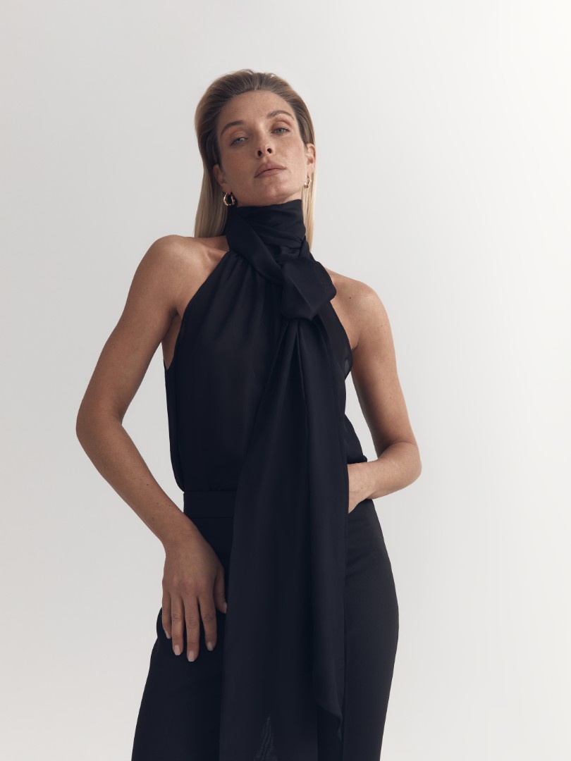 Блуза-халтер из легкого вискозного крепа. Модель с воротником-стойкой дополнена длинными широкими лентами, которые можно стилизовать, завязав в объемный бант, или оставив висеть за спиной.