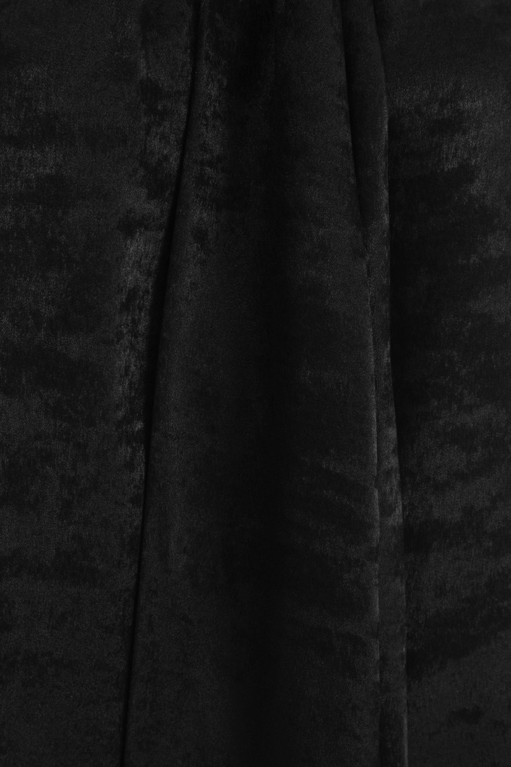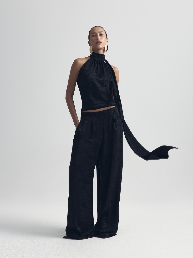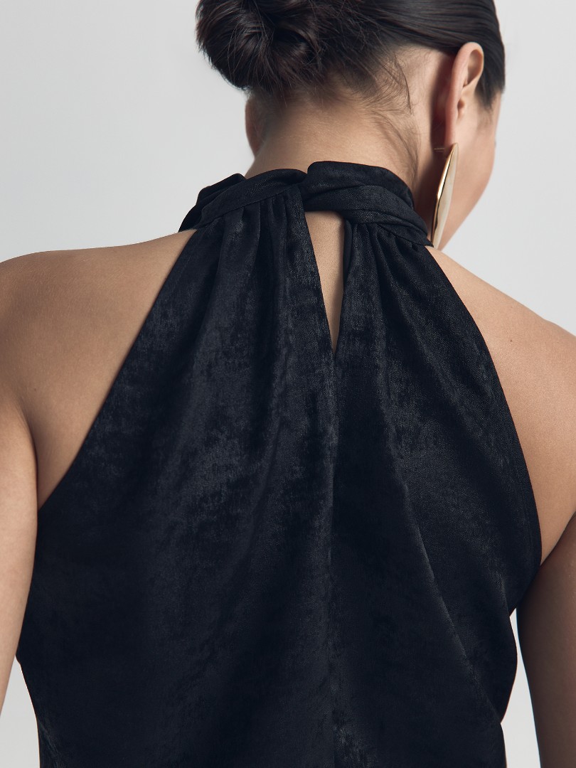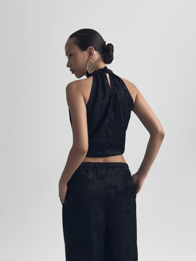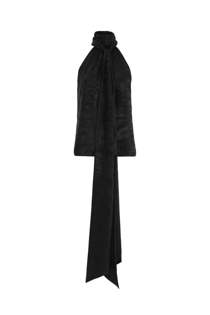 Блуза-халтер из струящейся жаккардовой ткани. Модель с воротником-стойкой дополнена длинными широкими лентами, которые можно стилизовать, завязав в объемный бант, или оставив висеть за спиной.