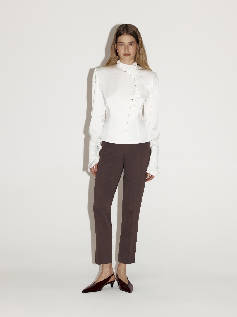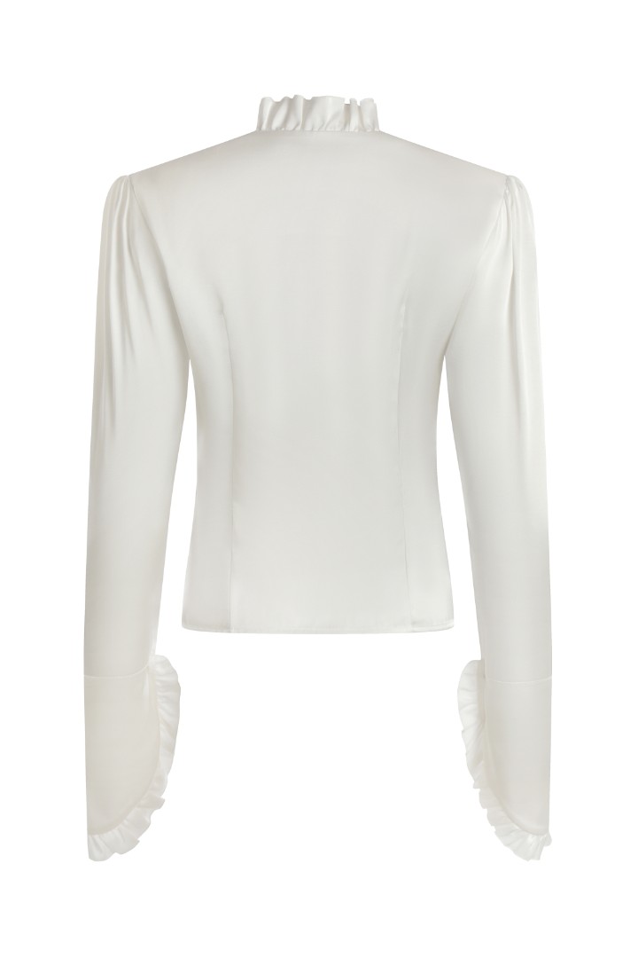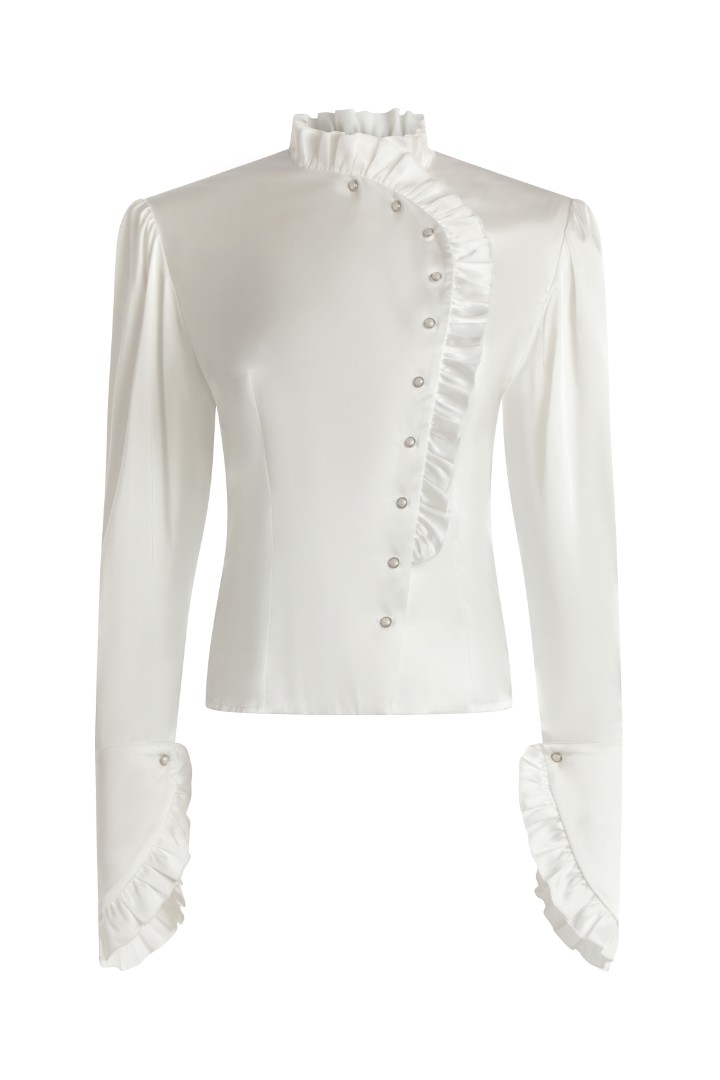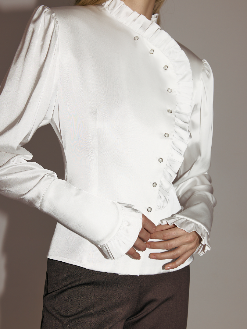 Утонченная блуза с подплечниками и удлиненными рукавами. Линия борта, воротник и широкие манжеты блузы по краям обрамлены рюшами. Модель приталенного кроя декорирована жемчужными пуговицами.