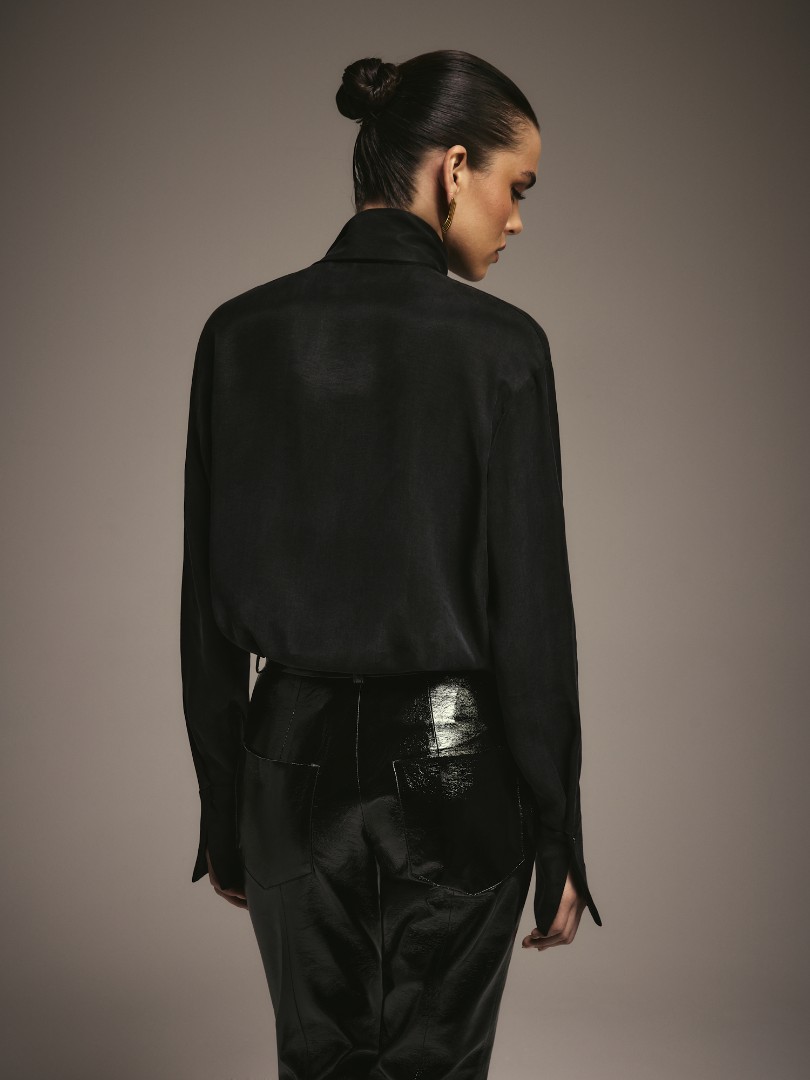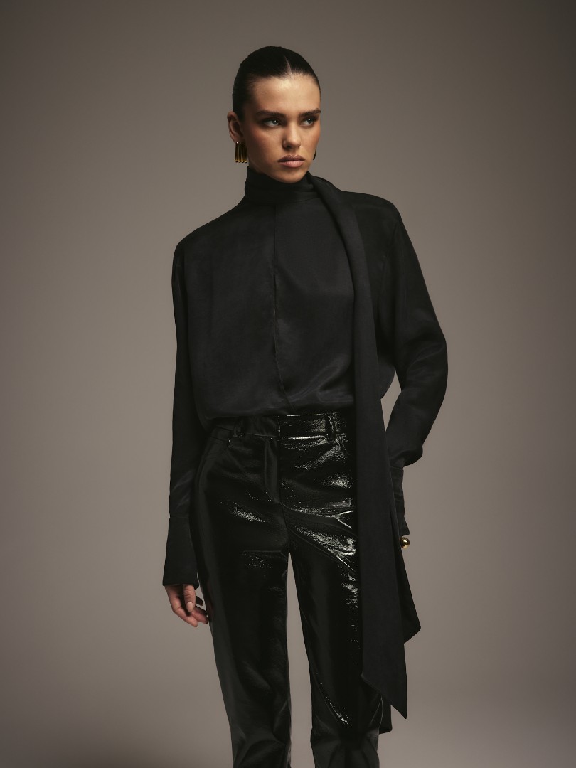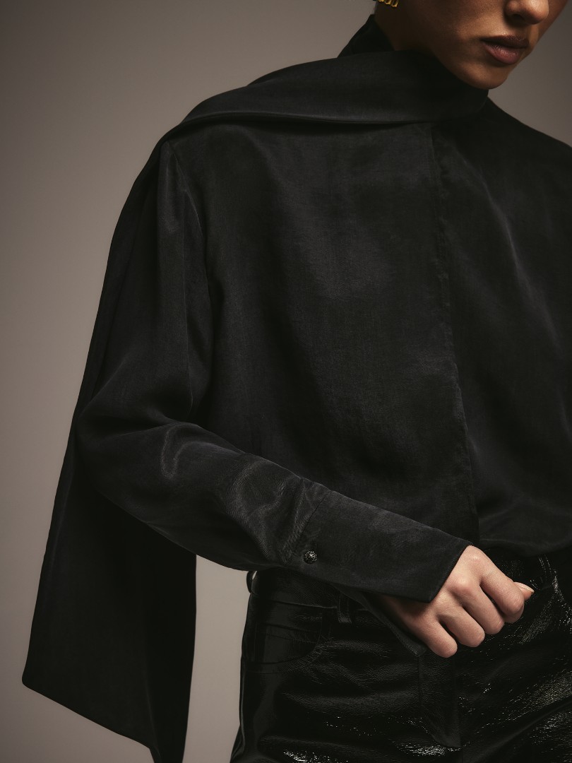 Блуза прямого кроя с воротником-стойкой, переходящим в длинные широкие ленты. Удлинённые рукава с широкими манжетами. Модель с фигурным вырезом и застёжкой на одну кнопку спереди.