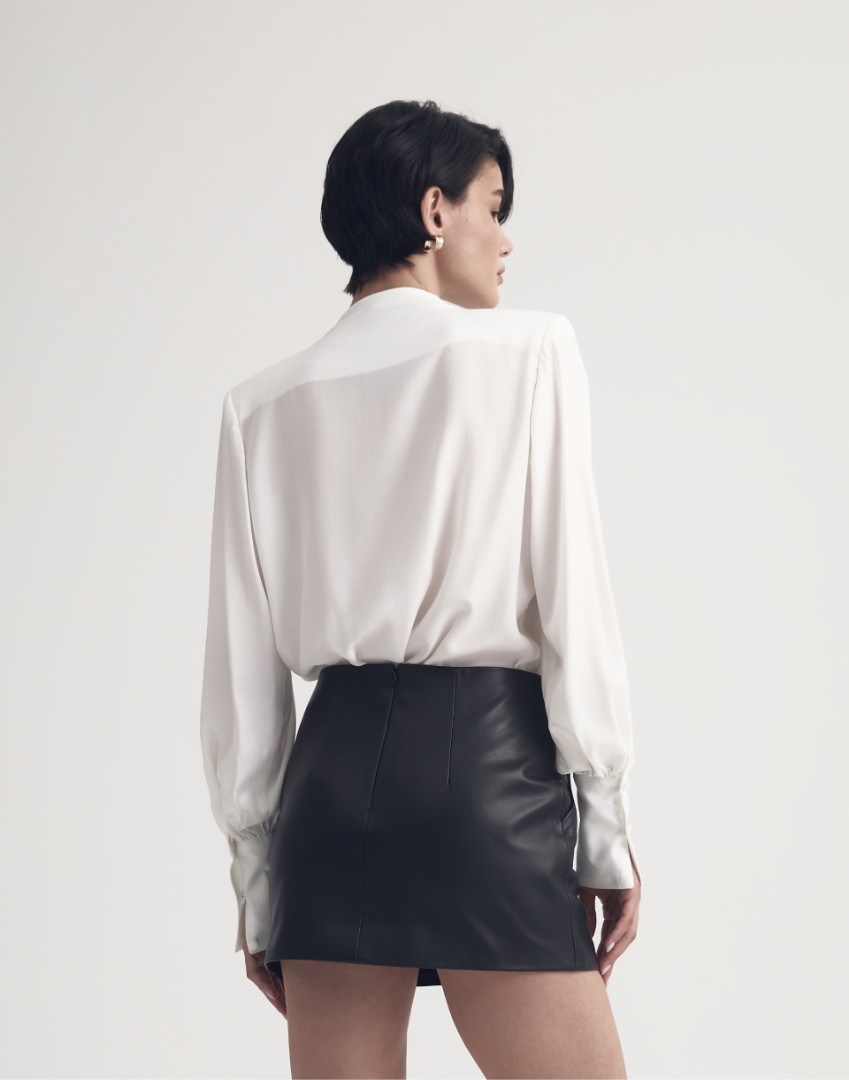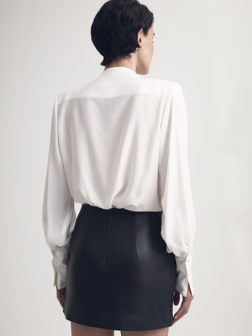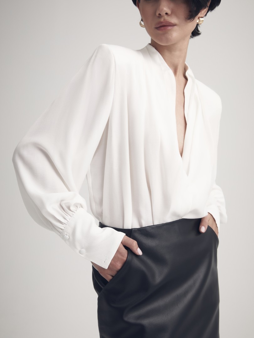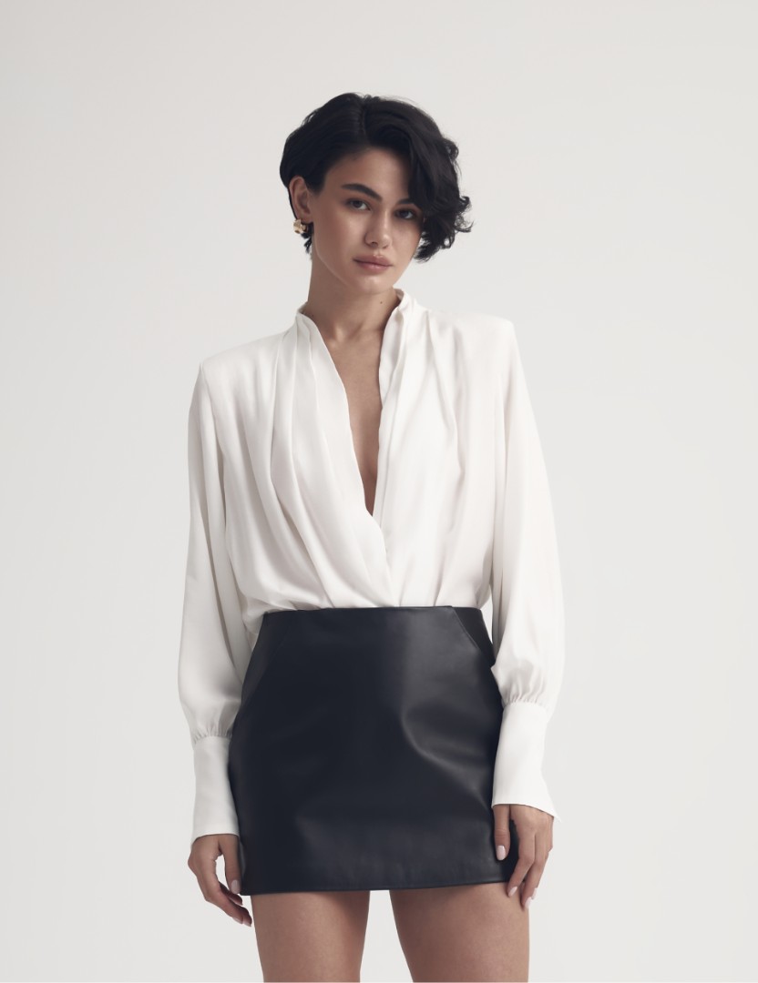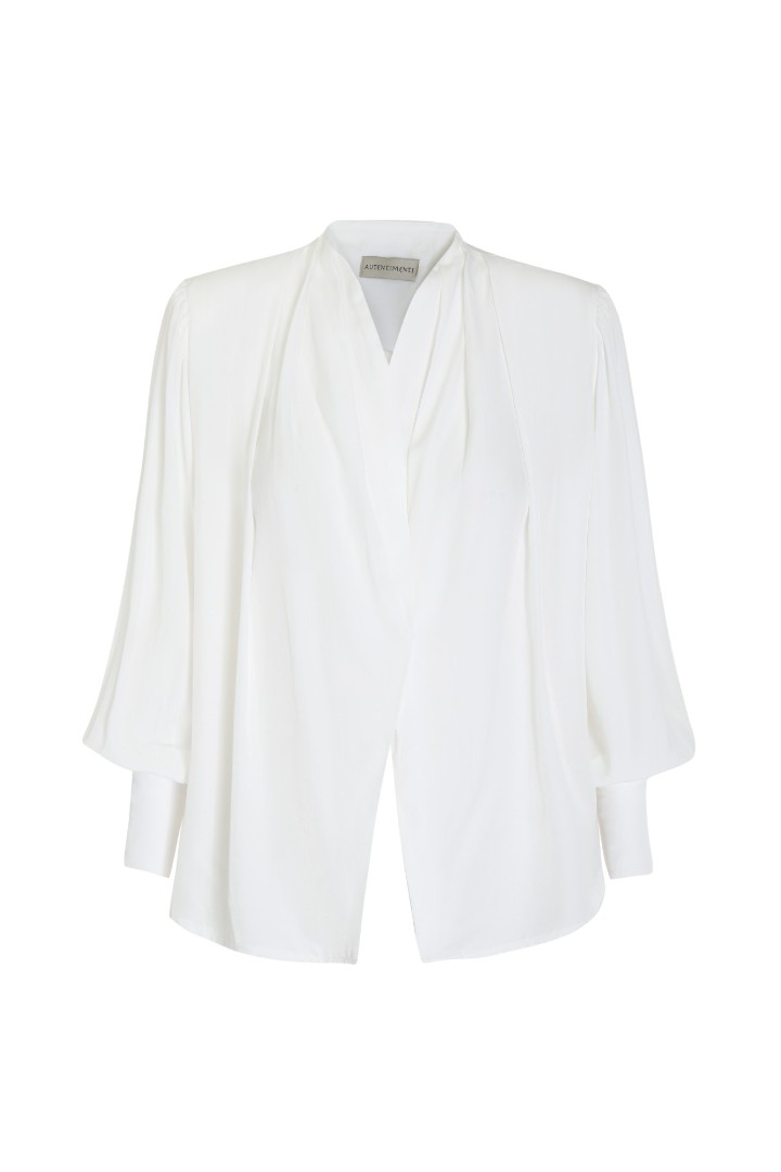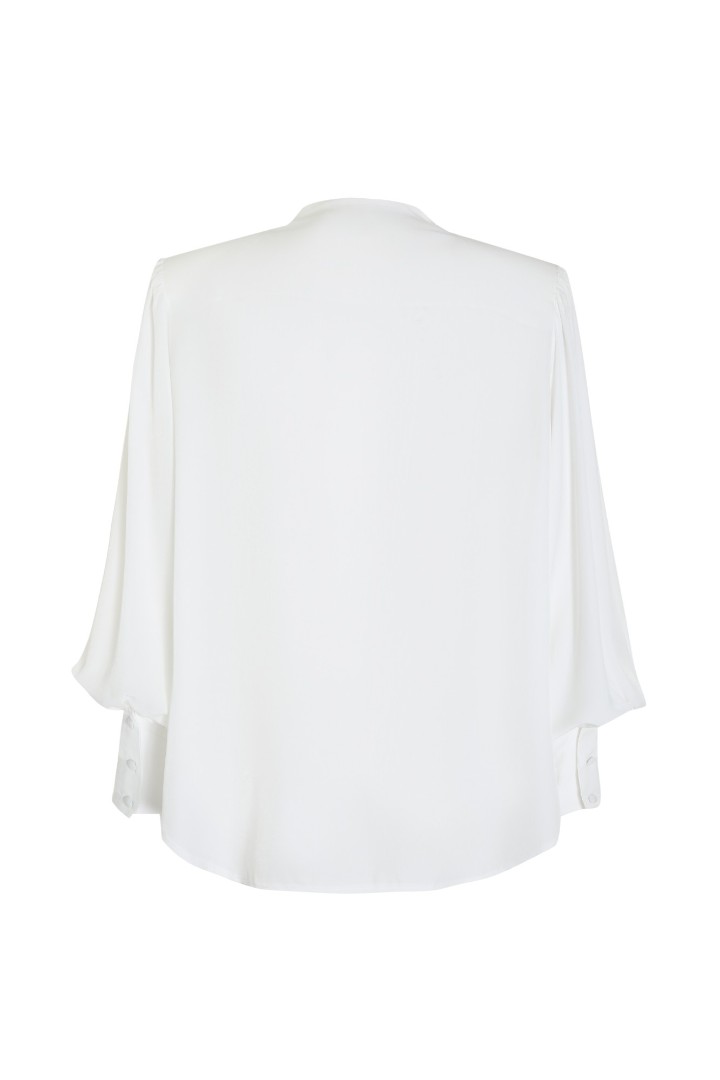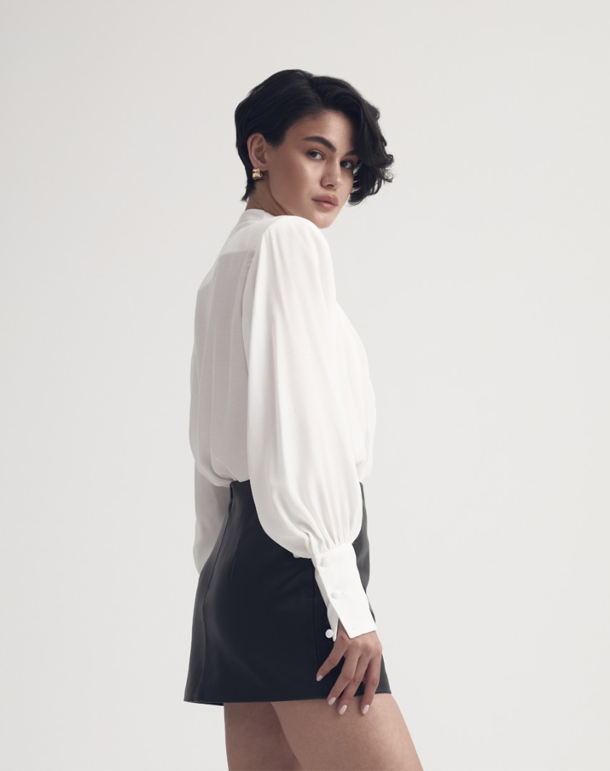 Вечерняя блуза Tulip с глубоким декольте. Скрытые вшитые плечики образуют четкую плечевую линию, а крупные сборки от самой горловины образуют таинственный объем по всей длине изделия. Широкие узкие манжеты завершают пышные рукава. Заправленная при носке модель образует силуэт «тюльпан».