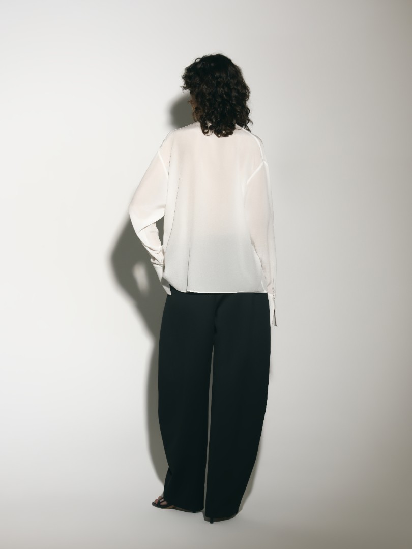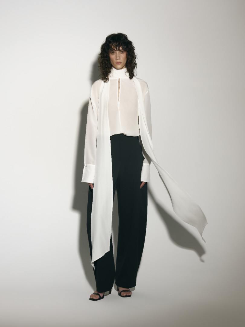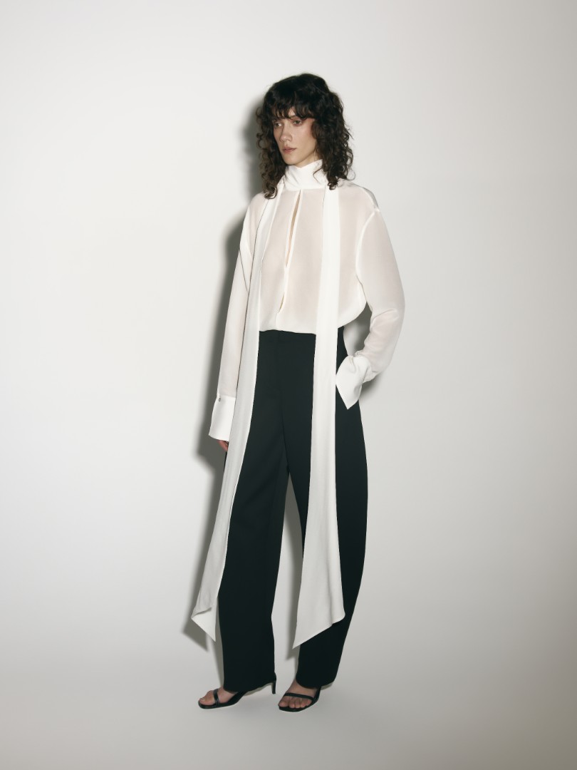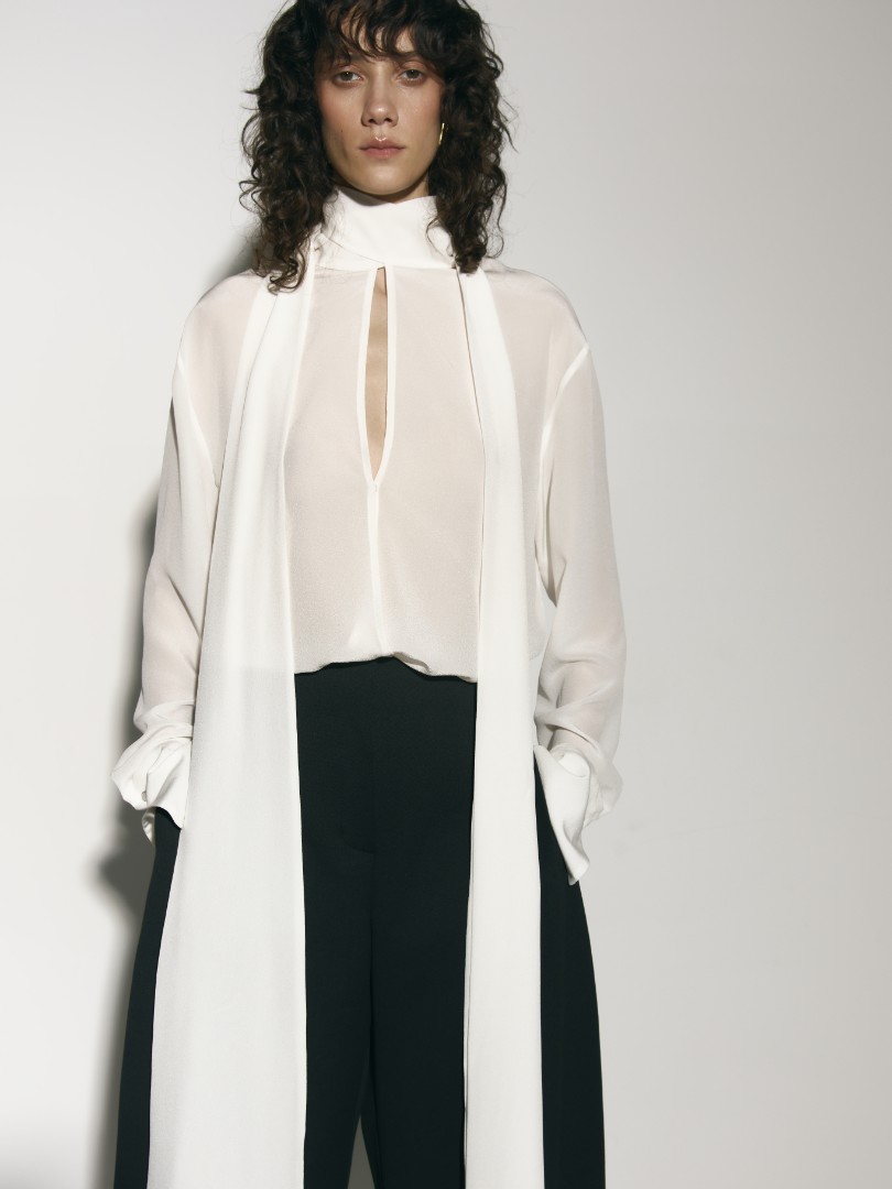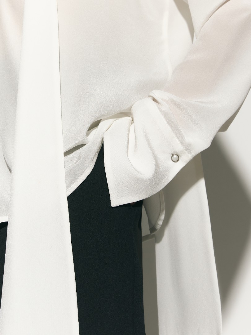 Шелковая блуза прямого кроя с воротником стойкой, переходящим в длинные широкие ленты, создающие эфирный и нежный образ. Удлиненные рукава с широкими манжетами. Модель с фигурным вырезом и застежкой на одну пуговицу спереди.