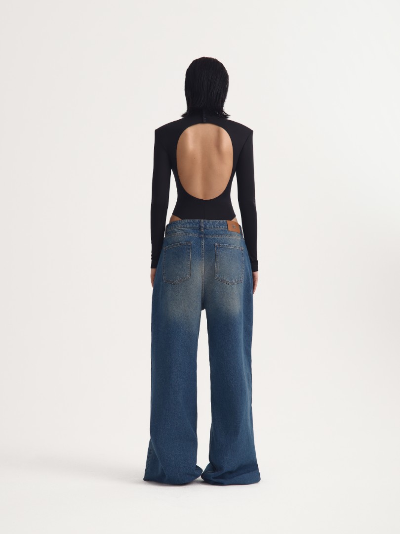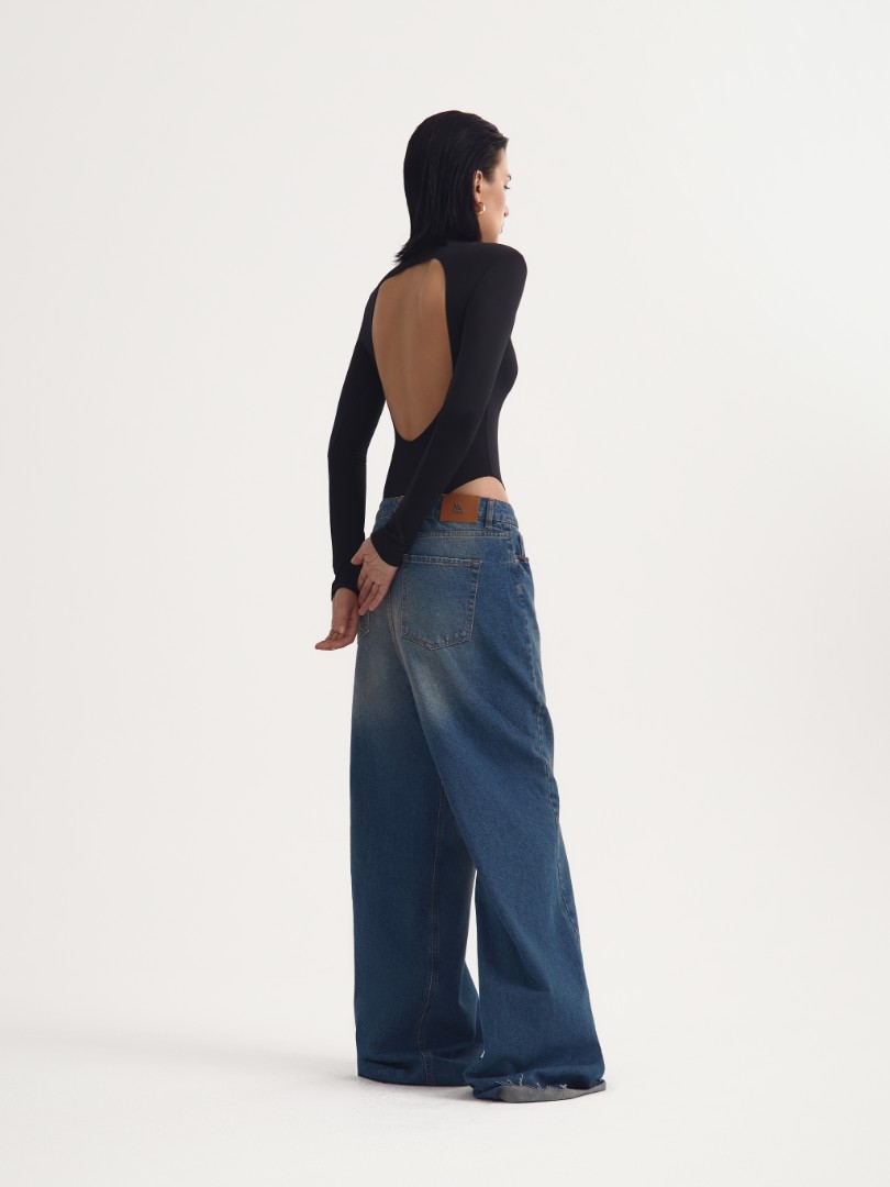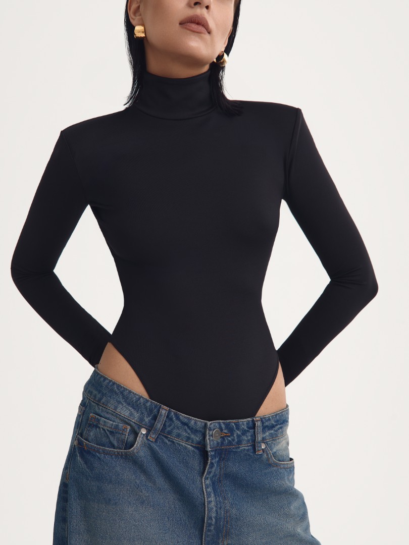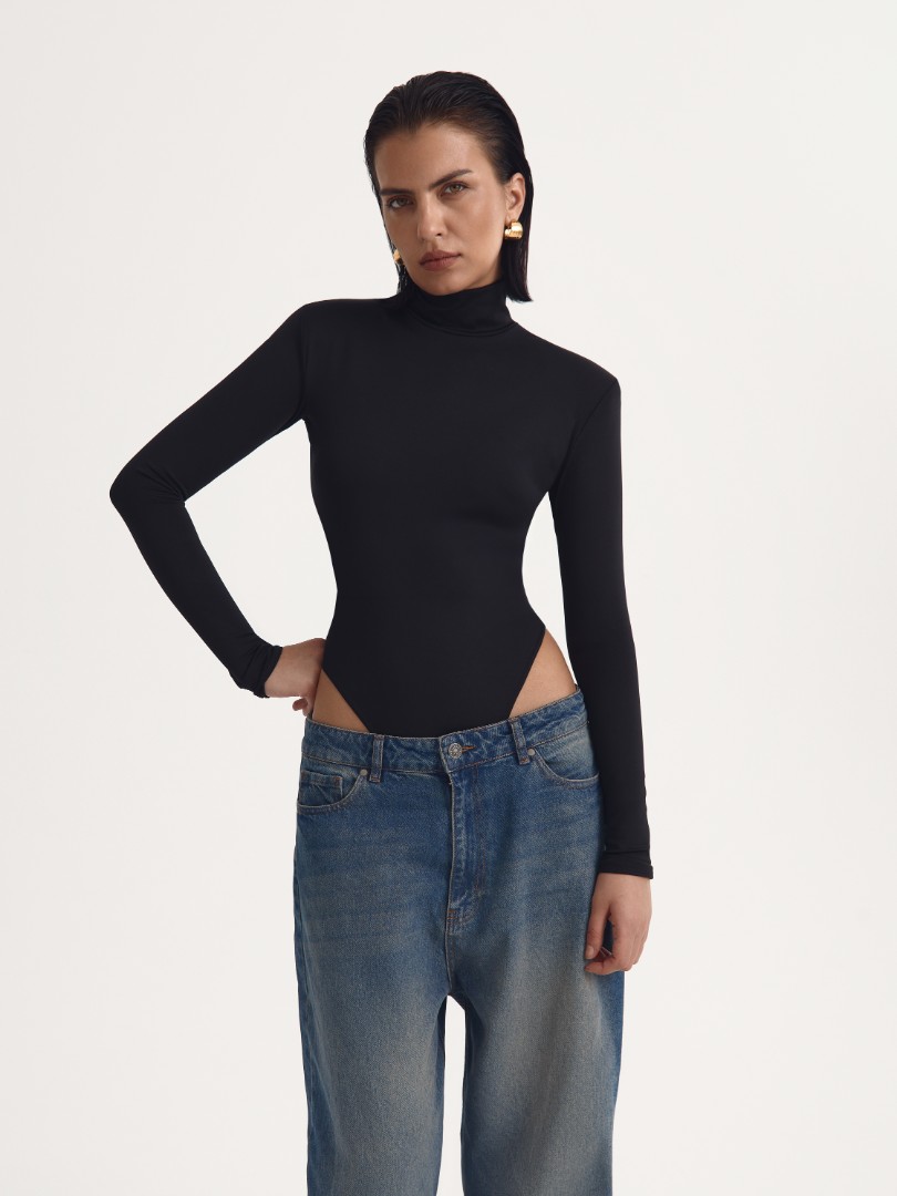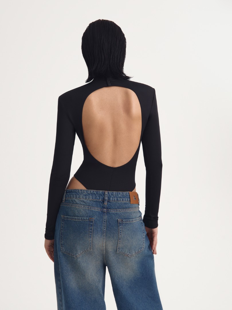 Трикотажное боди с длинным рукавом. Модель с посадкой high-leg, воротником-стойкой, глубоким вырезом на спине и вшитыми подплечниками. Застежка на черные кнопки на воротнике и ластовице. Облегающее боди станет безупречной основой как повседневных аутфитов с джинсами, так и элегантных вечерних образов.