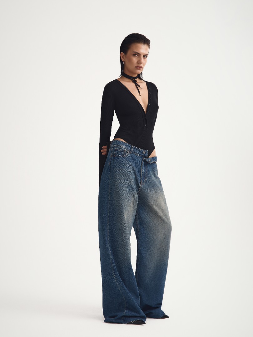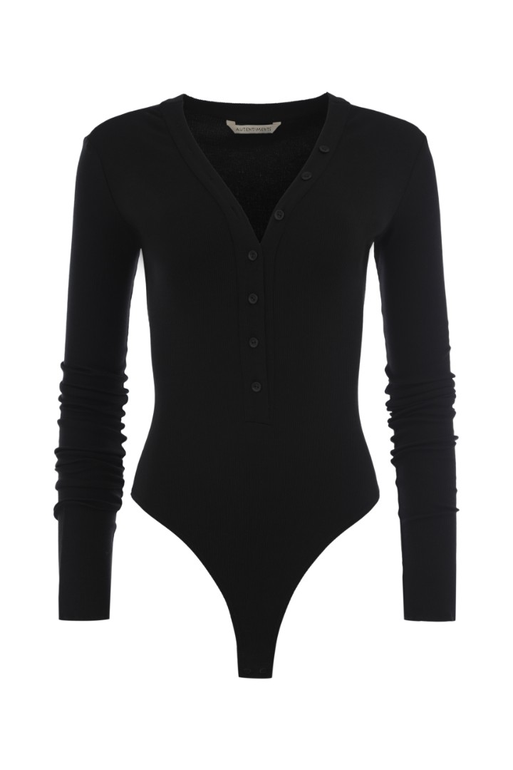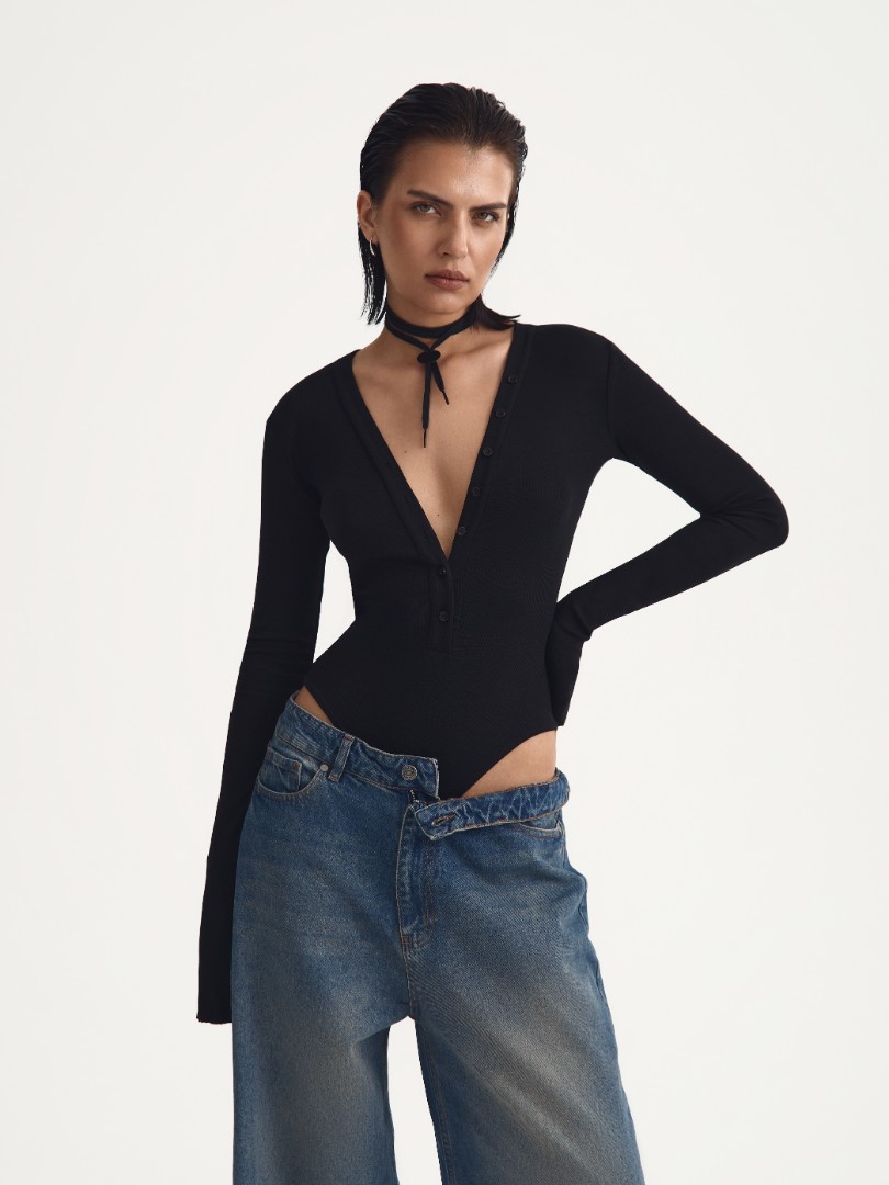 Боди на пуговицах из эластичного трикотажа в рубчик. V-образный вырез, комфортная посадка high-leg и удлиненные рукава. Застежка на кнопки на ластовице.
