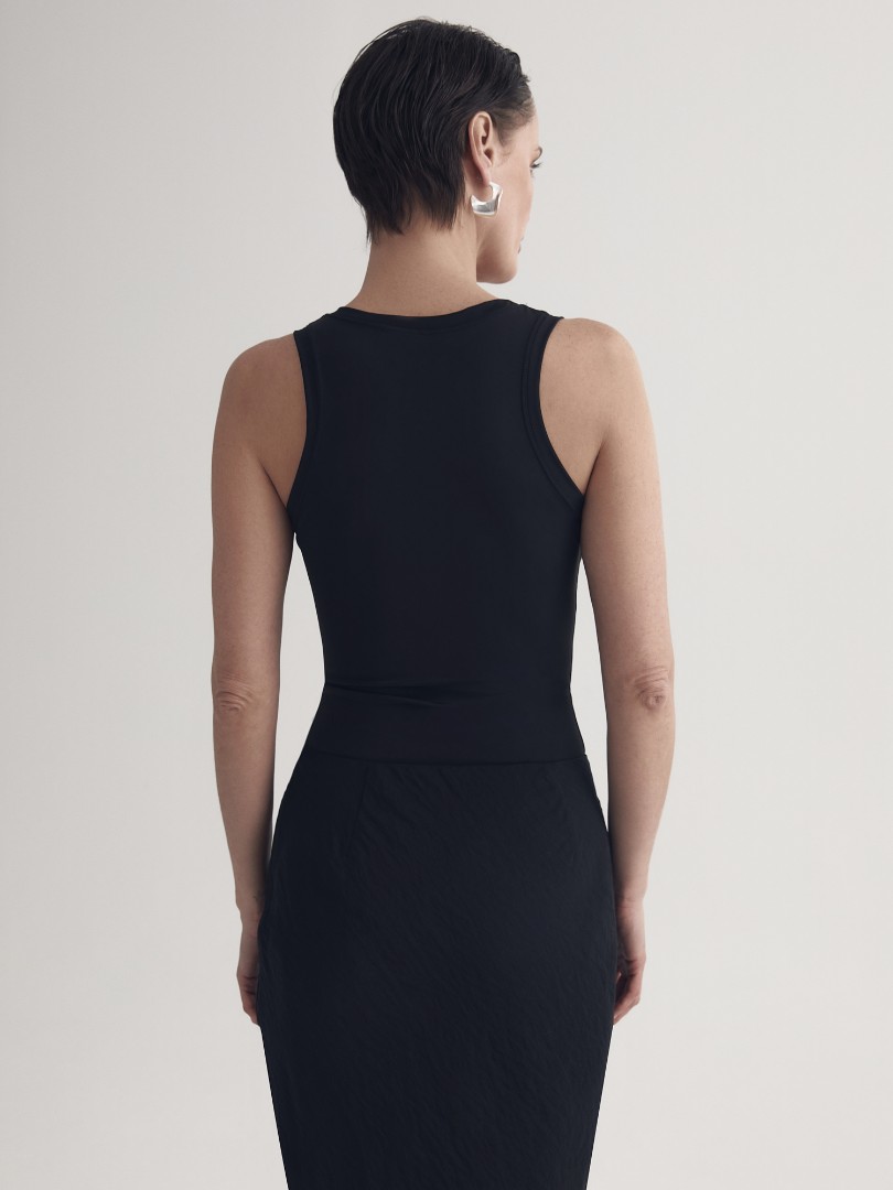 Облегающее боди из эластичной ткани с глубоким U-образным вырезом и широкими бретелями. Застегивается на кнопки снизу. Базовая модель безупречно сочетается с джинсами и юбками из нашей коллекции.