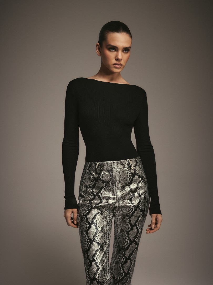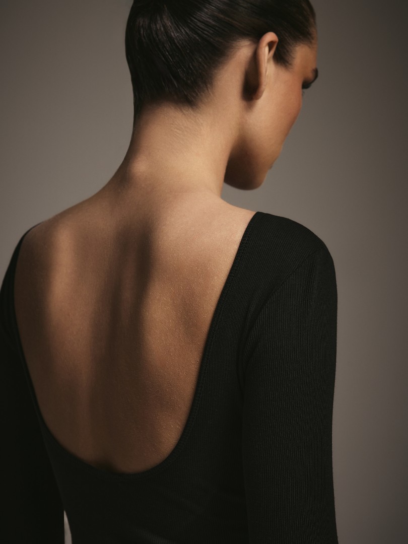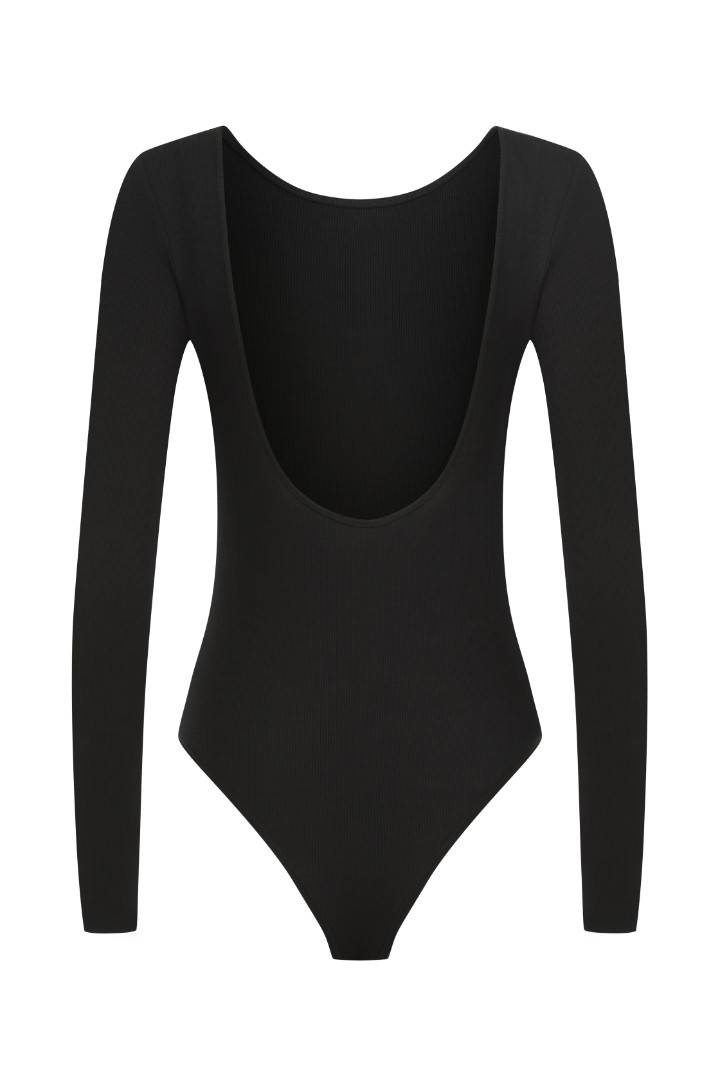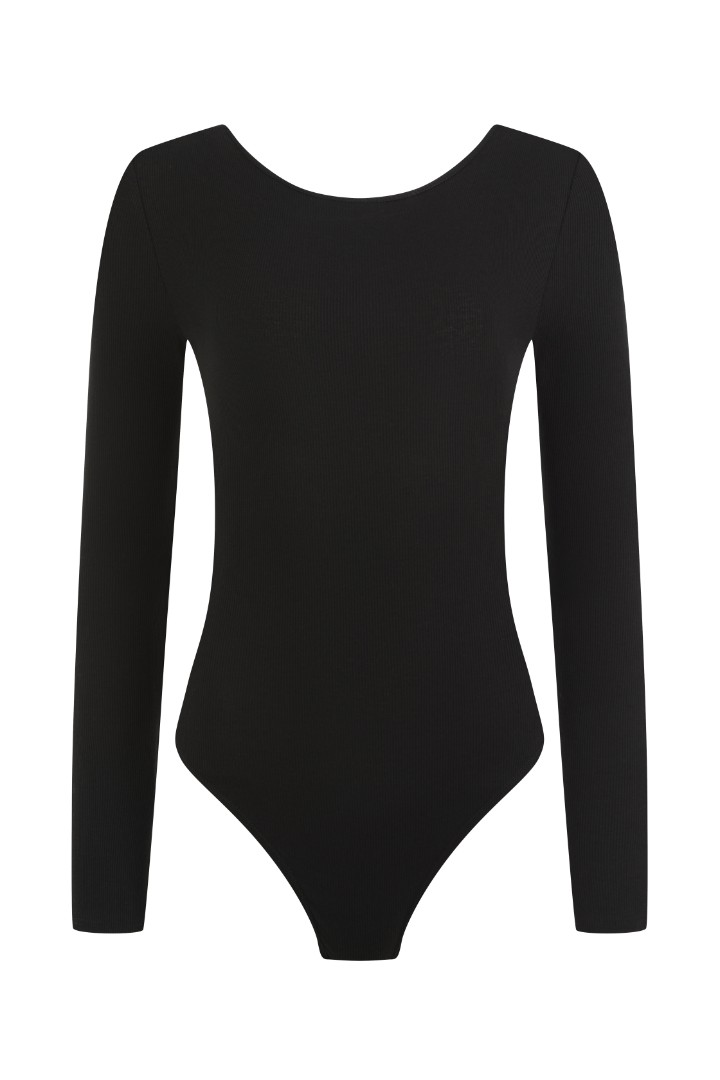 Боди из плотного эластичного трикотажа в рубчик. Модель с открытой спиной, удлинёнными рукавами и вырезом-лодочкой. Застёжка на кнопки на ластовице.