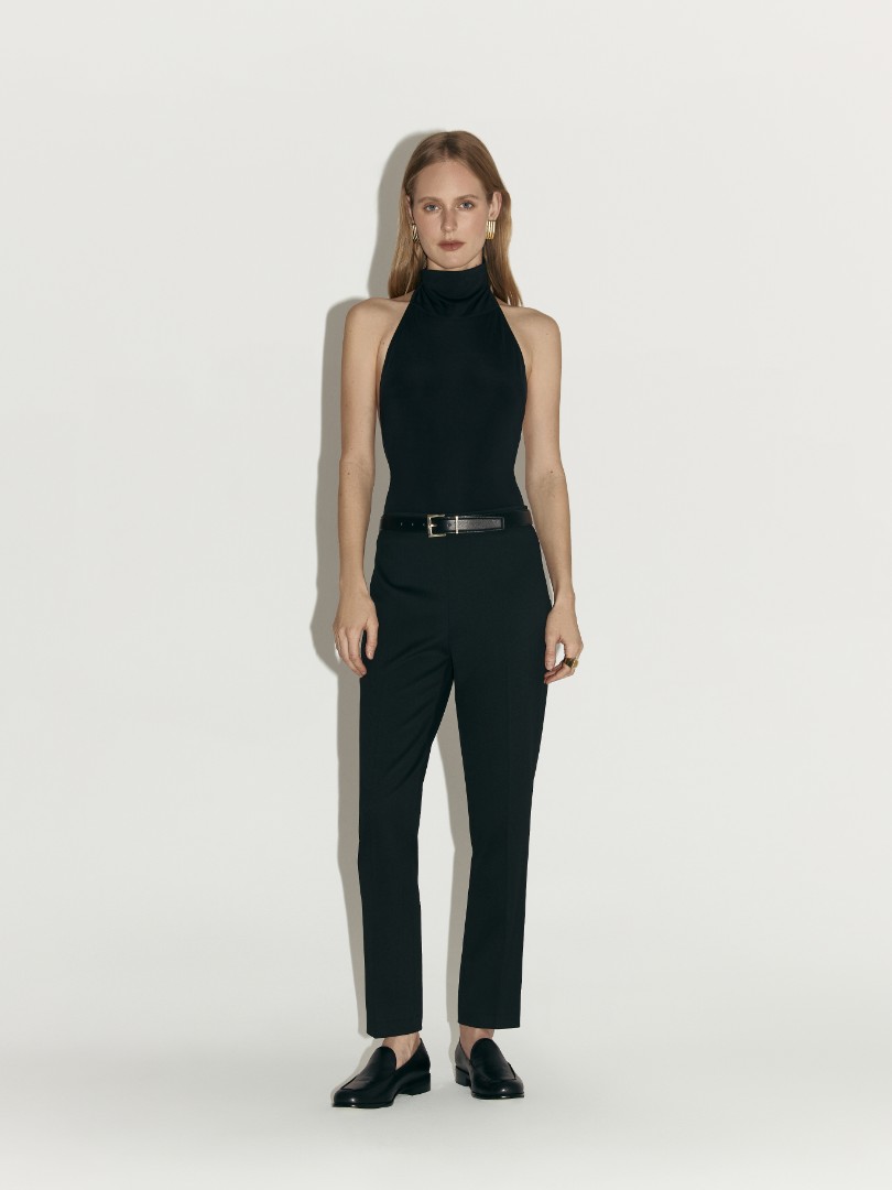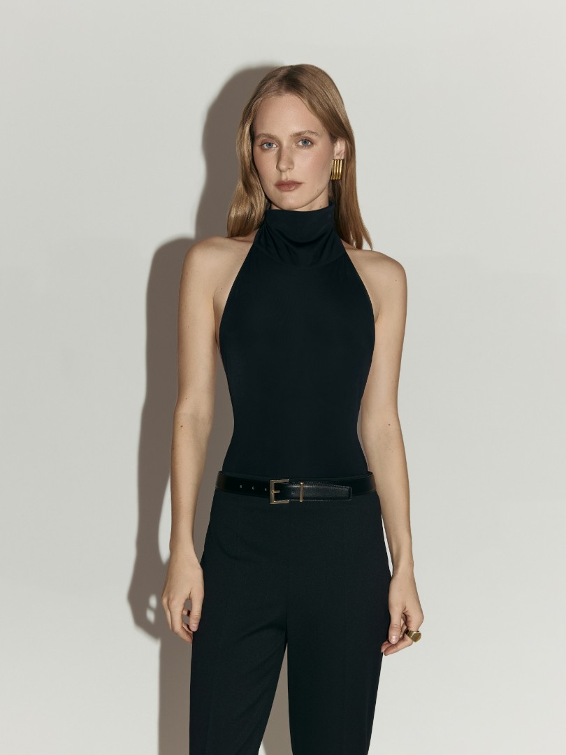 Боди из бифлекса с американской проймой и высоким воротником-стойкой. Глубокий вырез на спине, комфортная посадка high-leg и застежка на кнопки на ластовице с регулировкой длины.