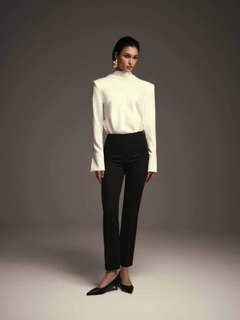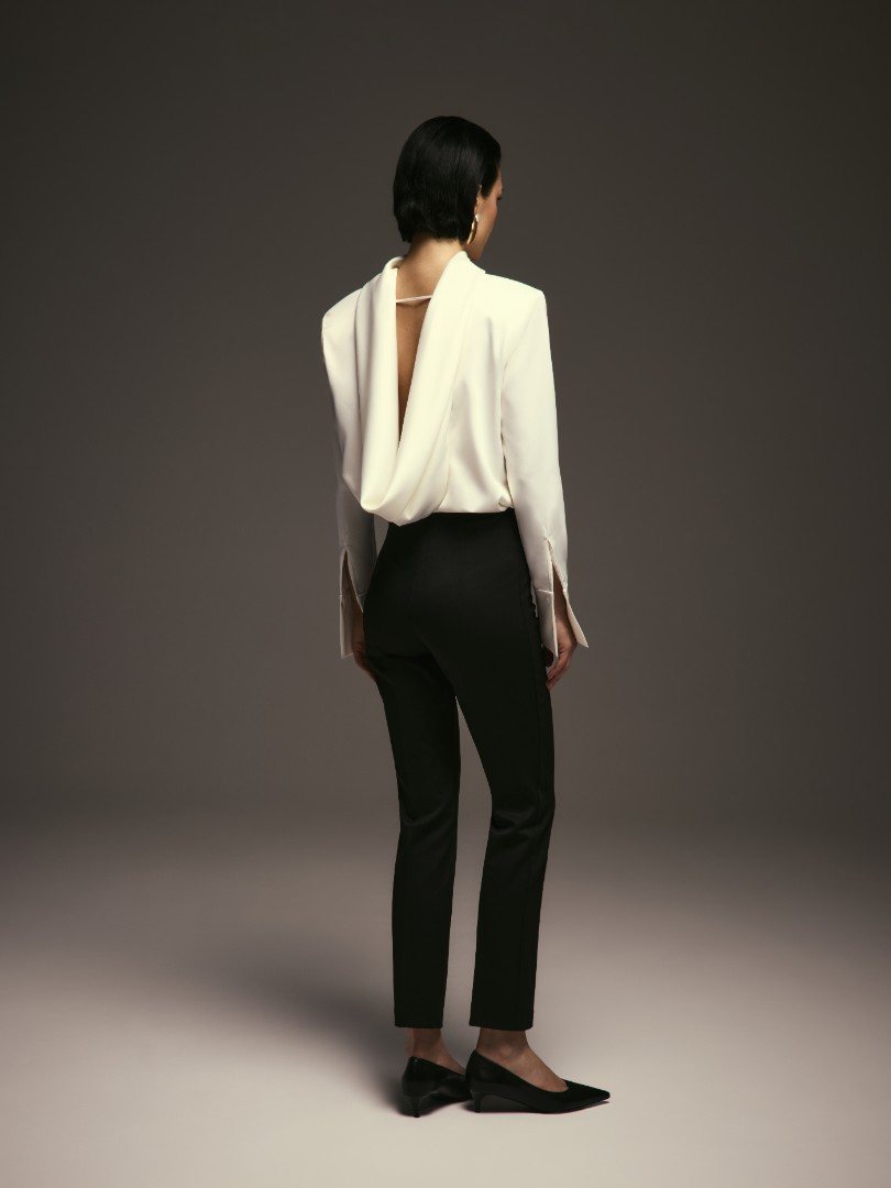 Боди с сигнатурной для коллаборации деталью – качелью на спине – является символом баланса между праздником и спокойствием. Боди отлично впишется в женственный гардероб, а также составит законченный сет с брюками AV. MONTAIGNE из коллаборации брендов.
