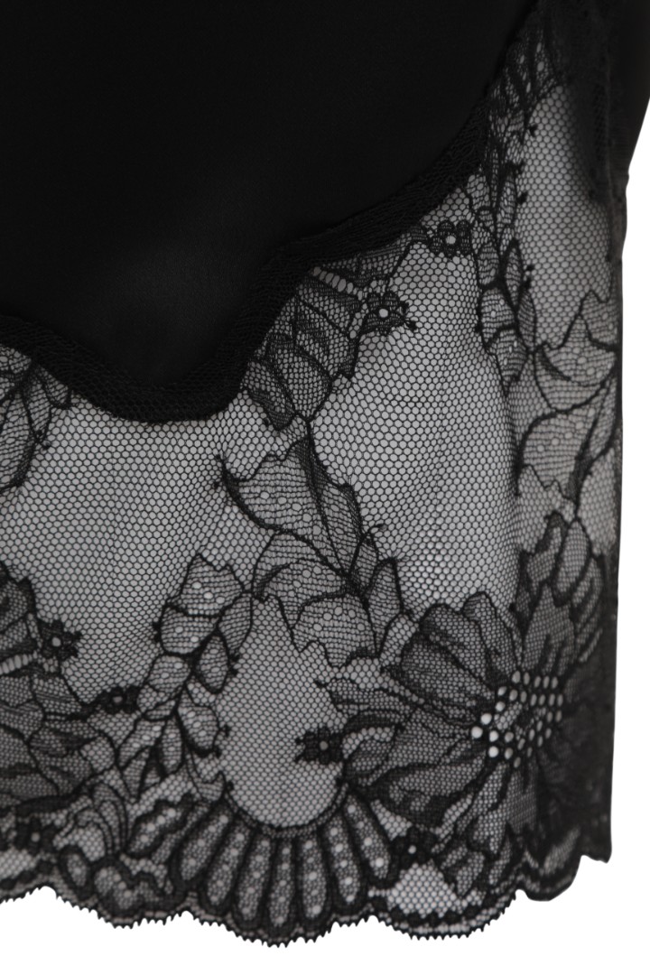 96% полиэстер, 4% эластан; кружево 100% нейлон – только сухая чистка, химчистка – стирка запрещена – отбеливание запрещено – max t нагрева утюга - 110°C, без пара – не использовать барабанную сушку