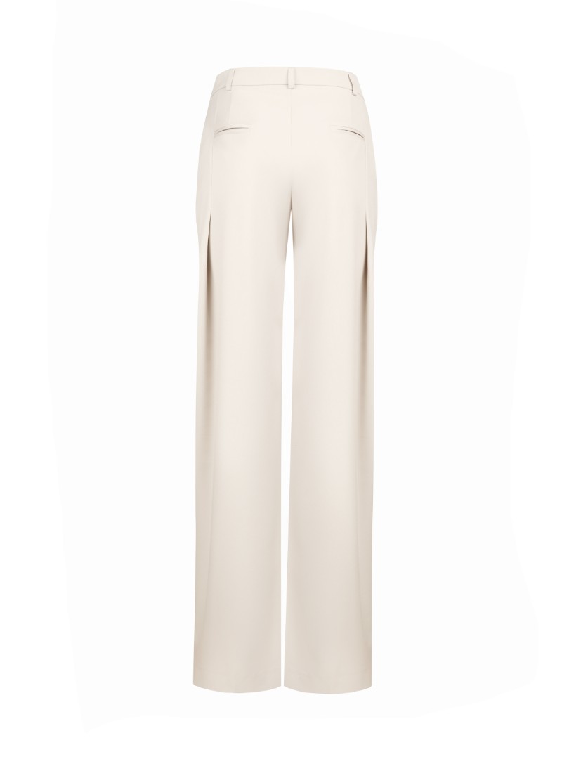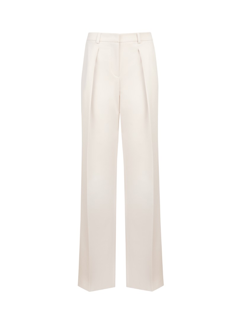 Классические брюки с высокой посадкой – must-have весенне-летнего гардероба. Модель расслабленного прямого кроя дополнена защипами на талии, переходящими в четкие стрелки по всей длине брючин.