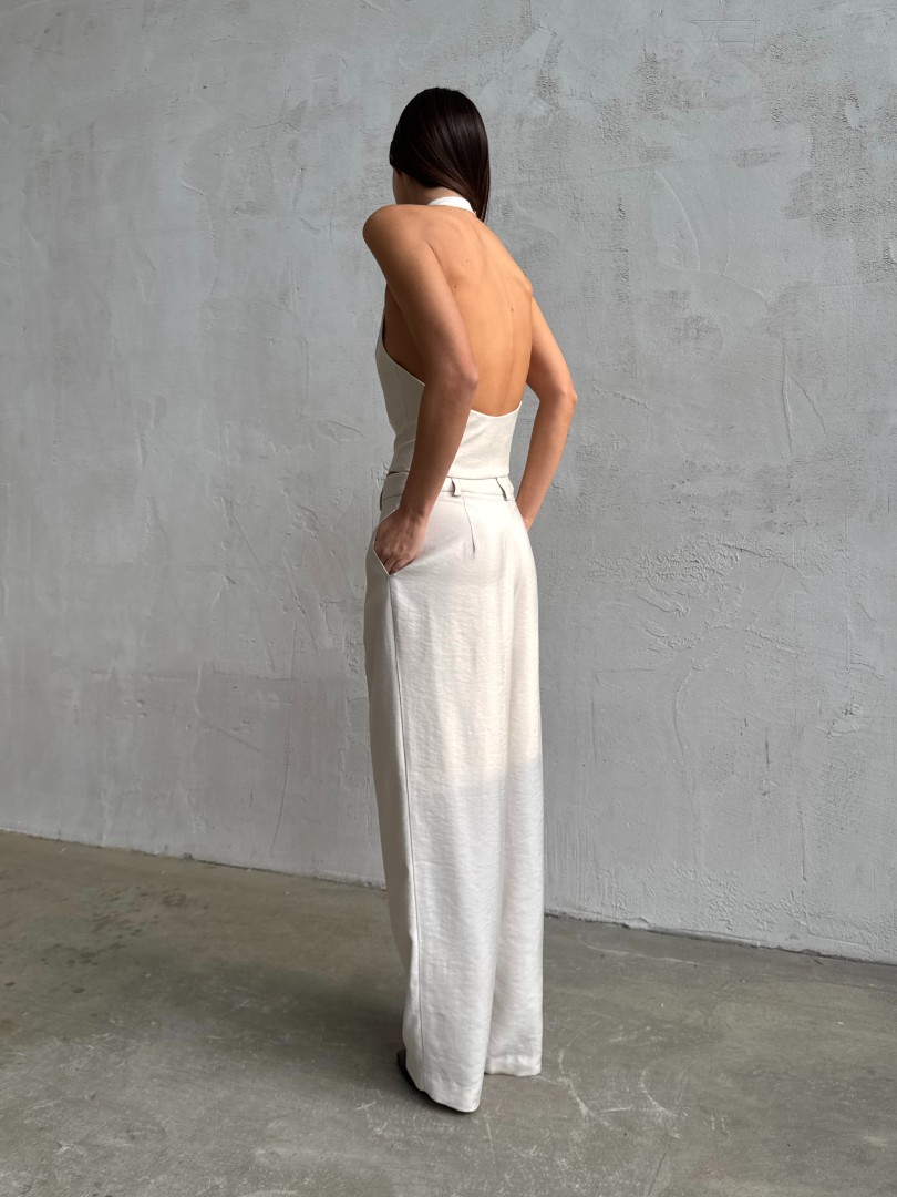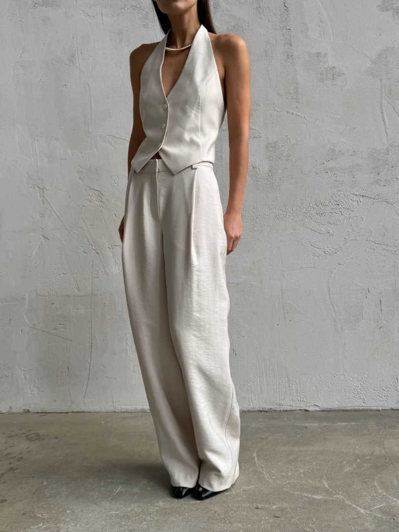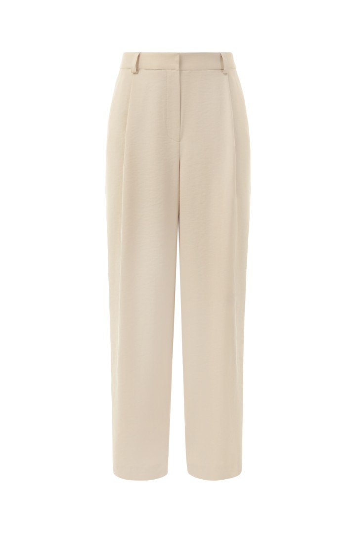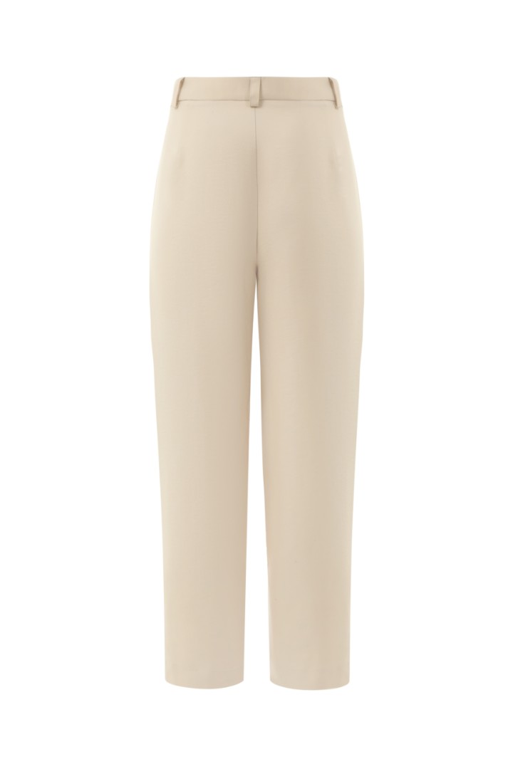 Брюки свободного силуэта, зауженные к низу, с защипами из легкой костюмной ткани. Модель с боковыми карманами, шлевками для ремня и застежкой на молнию спереди.
