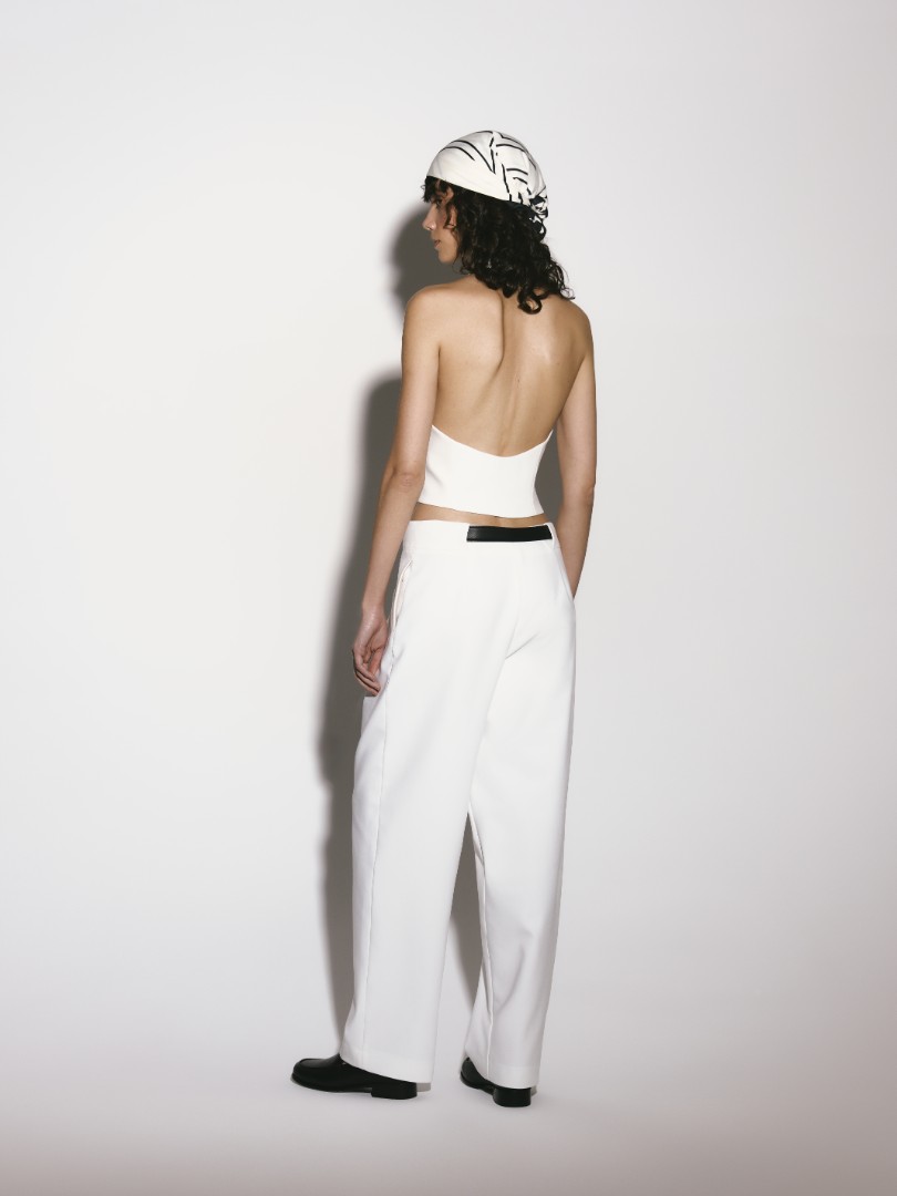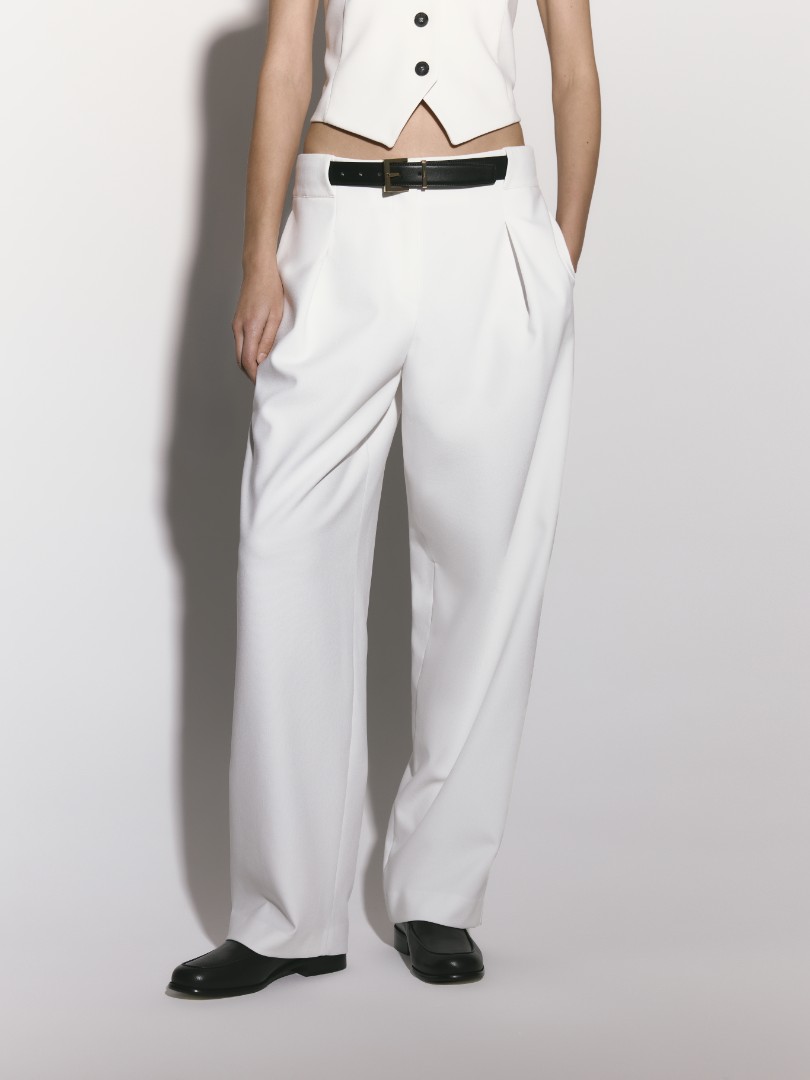 Брюки прямого силуэта с защипами из костюмной ткани. Модель с боковыми карманами, застежкой на молнию спереди и цельнокроеным поясом, переходящим в шлевки.