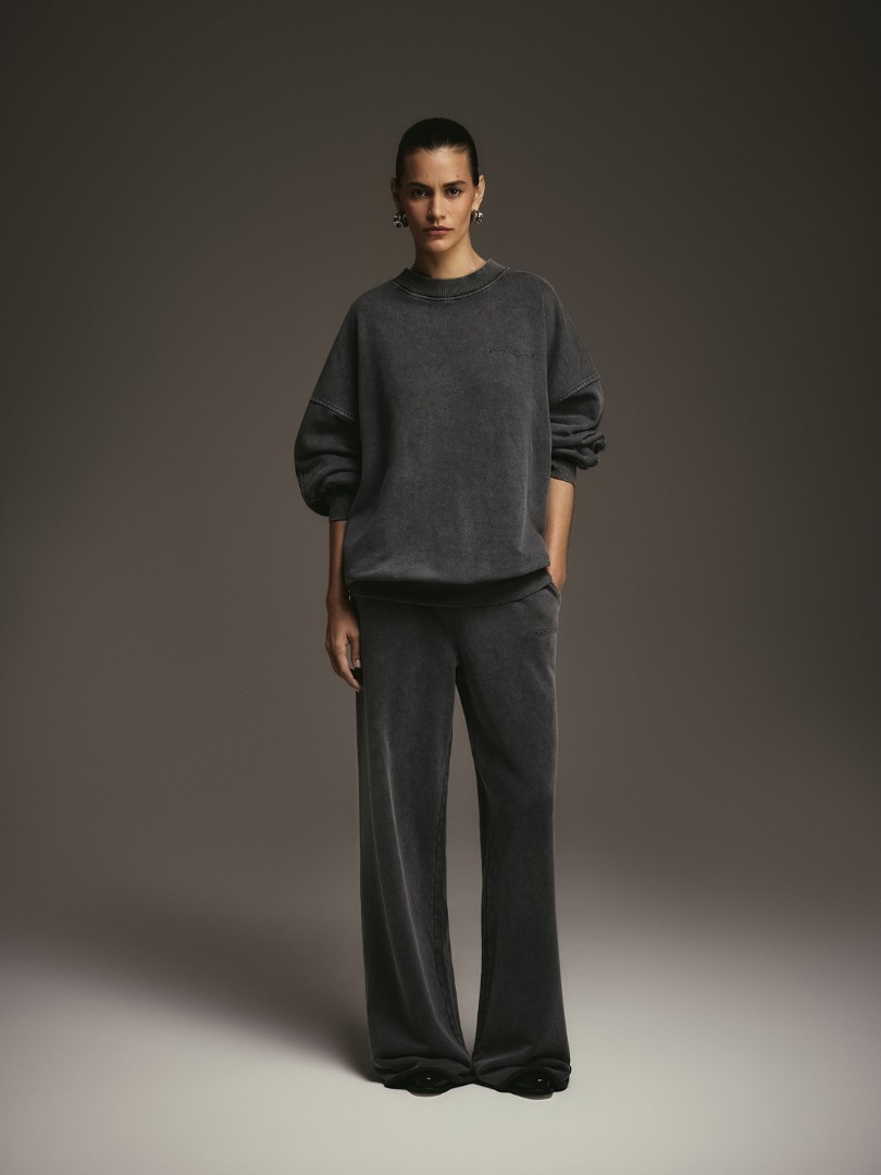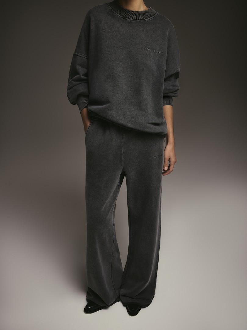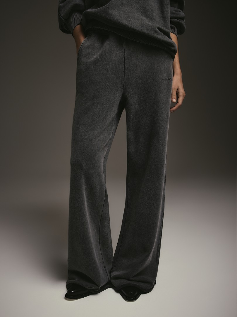 Оверсайз брюки силуэта Wide Leg из плотного футера. Модель со средней посадкой дополнена прорезными боковыми карманами и лаконичным логотипом Autentiments. Эластичный пояс на талии затягивается шнурком.