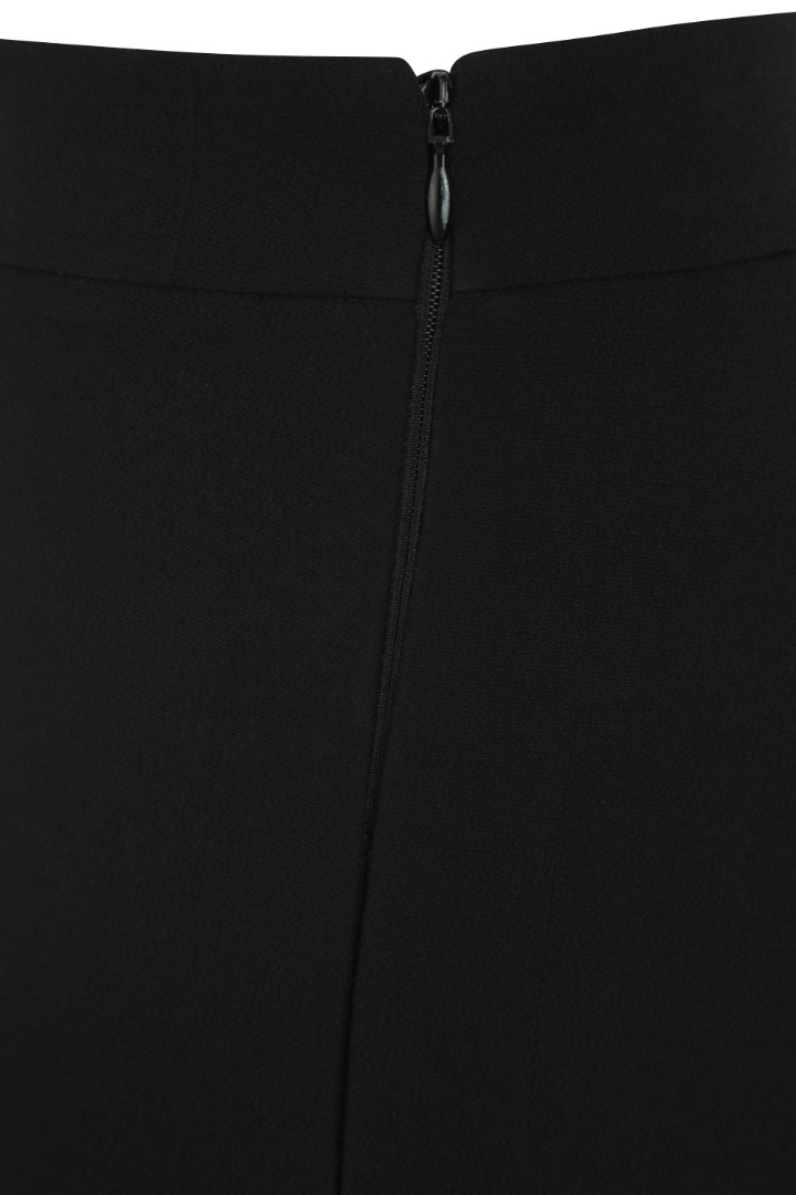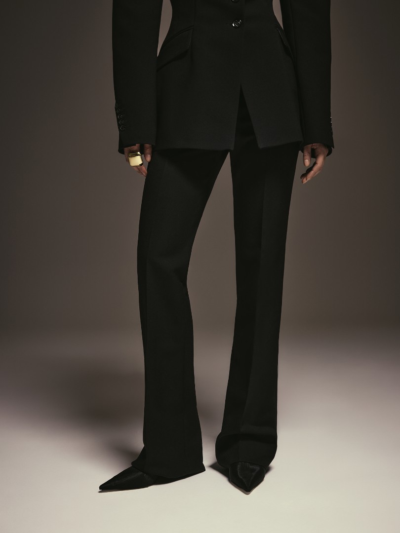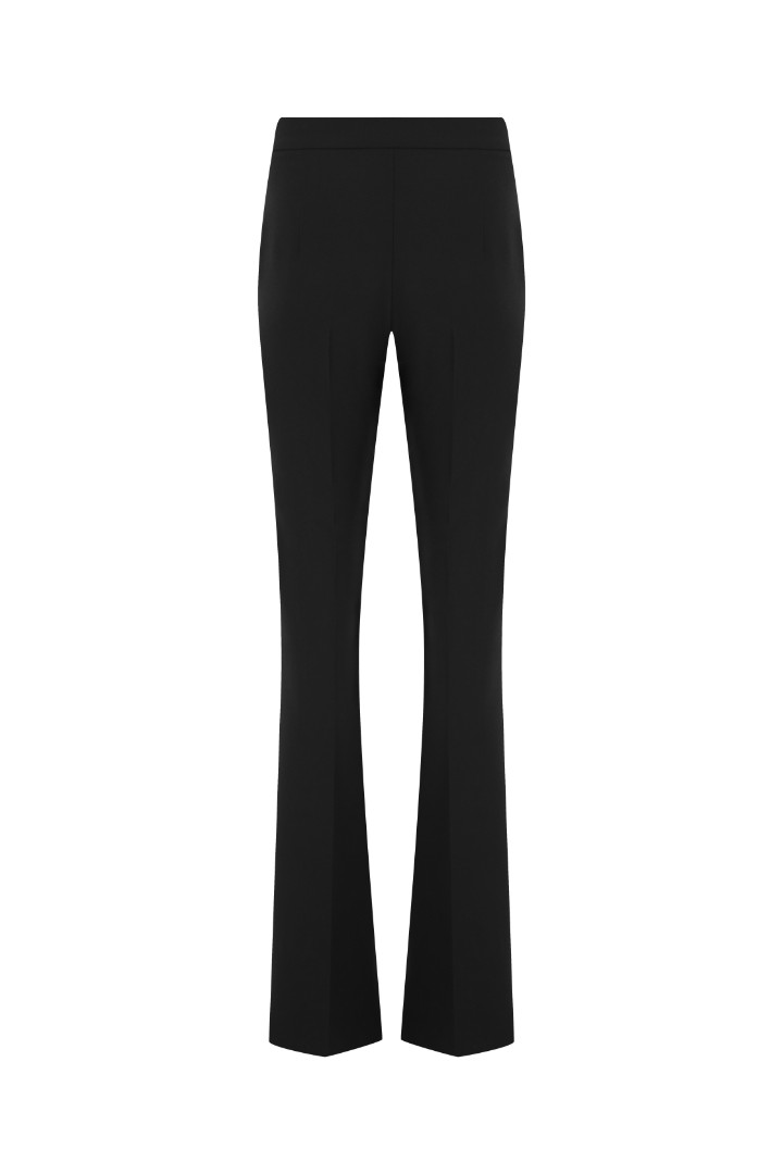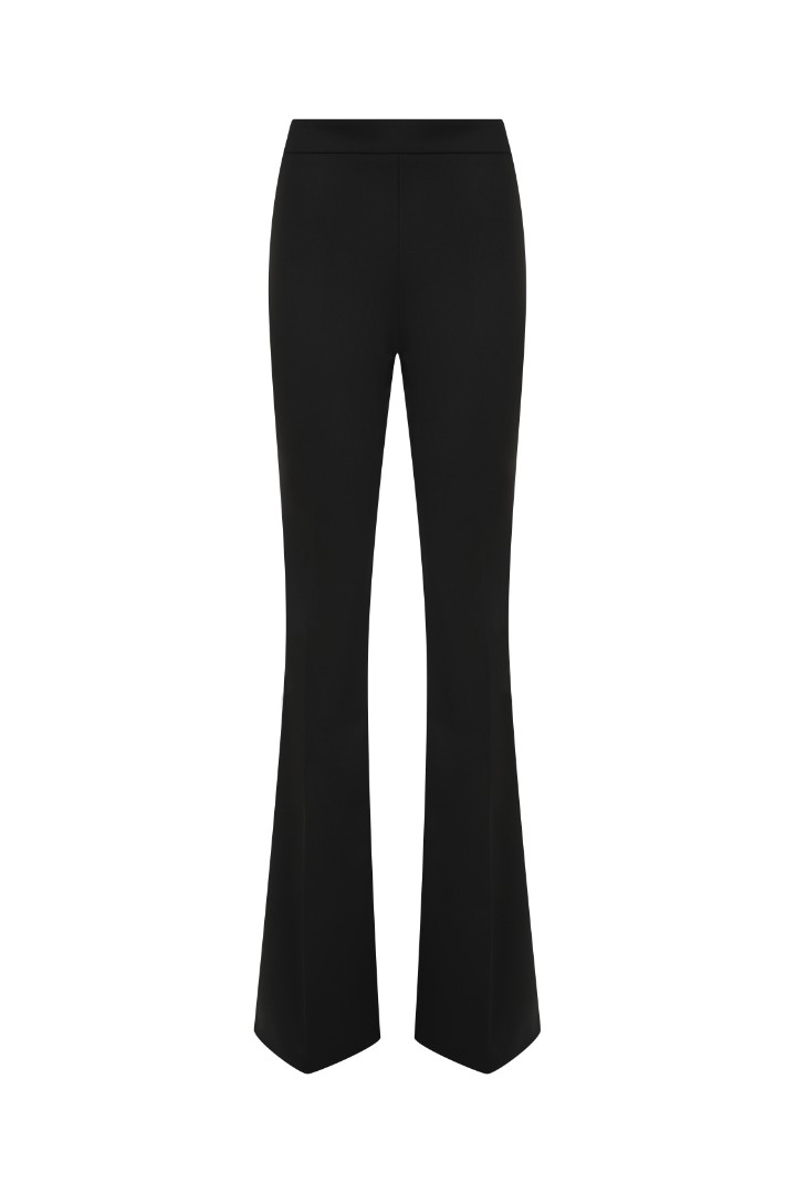 Брюки клёш со стрелками из костюмной ткани. Полная длина, посадка на талии и потайная застёжка-молния сбоку.