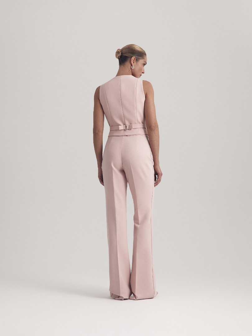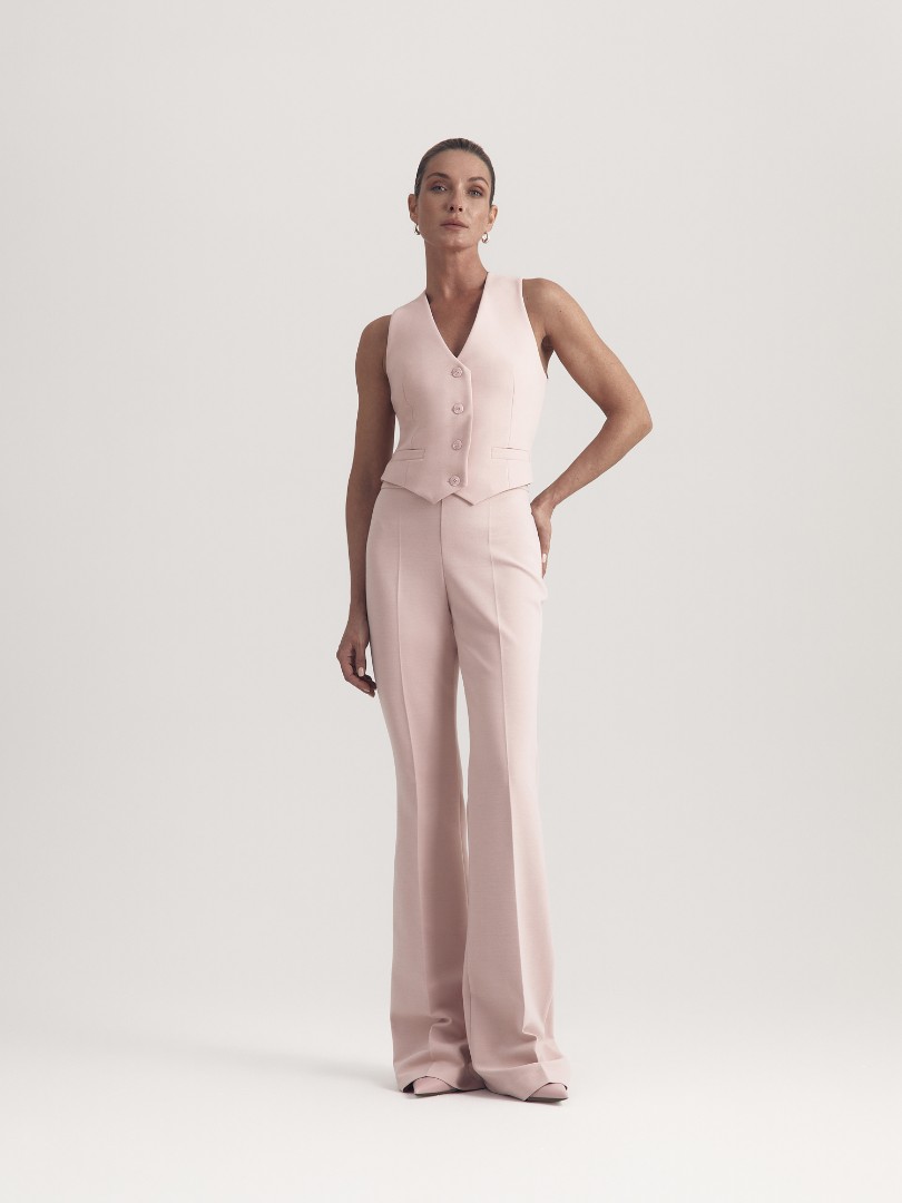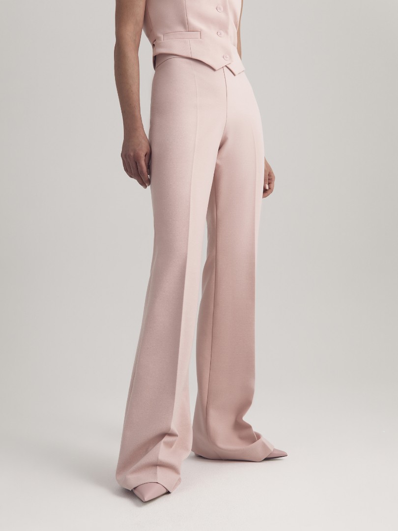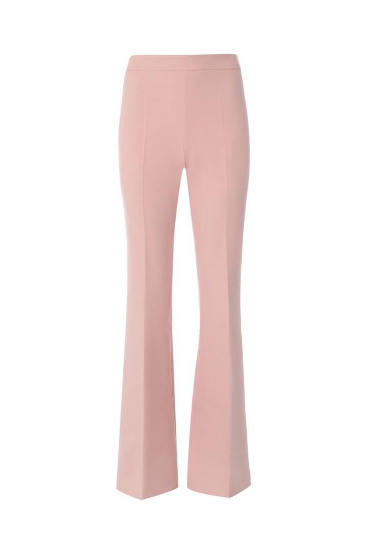 Брюки клеш со стрелками из костюмной ткани. Полная длина, посадка на талии и потайная застежка-молния.