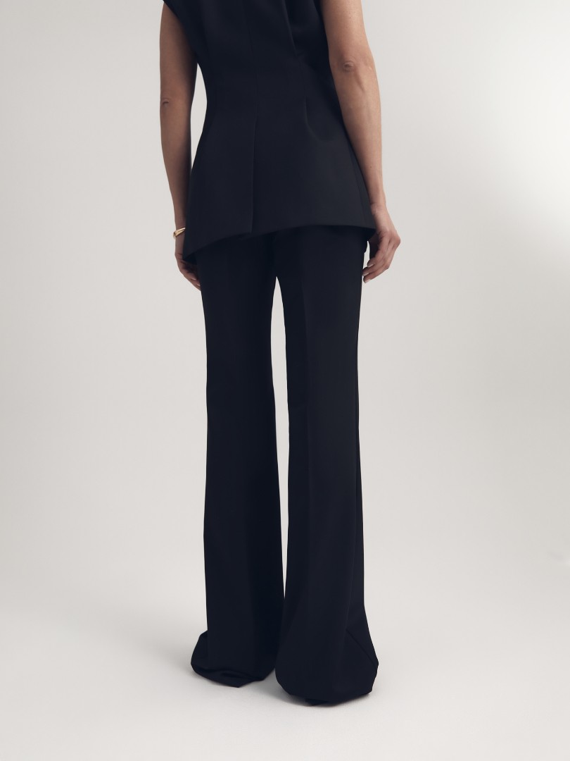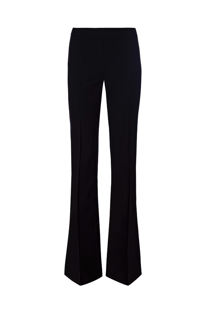 Брюки клеш со стрелками из облегченной костюмной ткани с добавлением вискозы. Полная длина, посадка на талии и потайная застежка-молния сбоку.