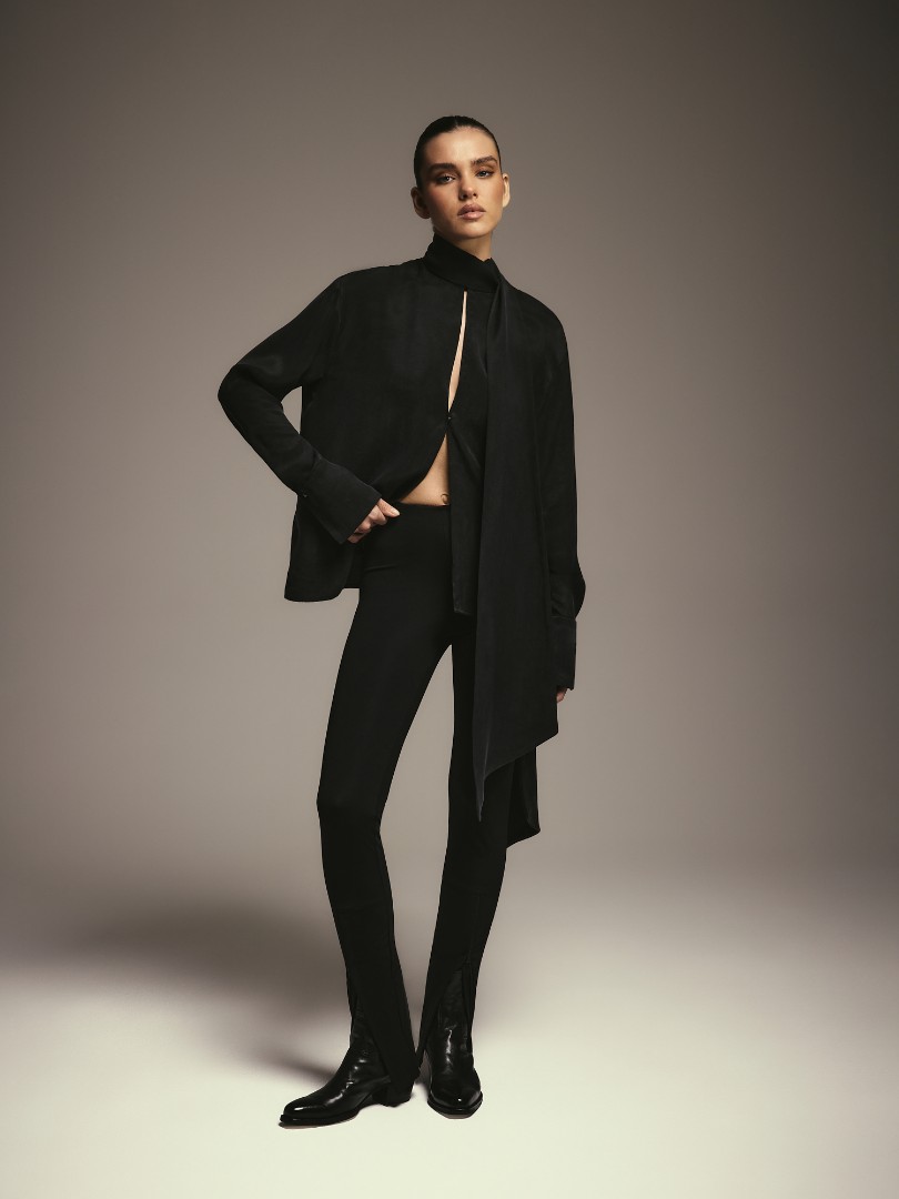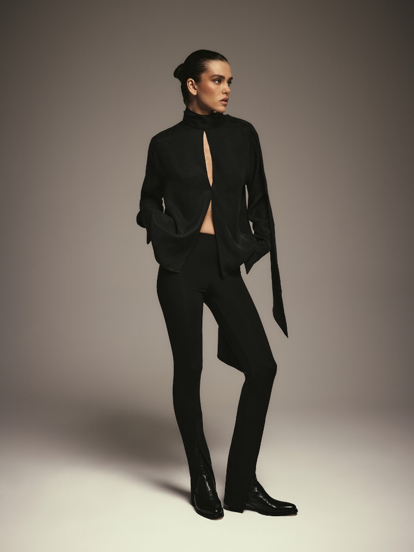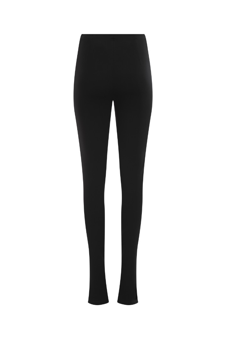 Брюки-леггинсы облегающего кроя с высокой посадкой и цельнокроеным поясом. Брючины полной длины с разрезами на молниях снизу.