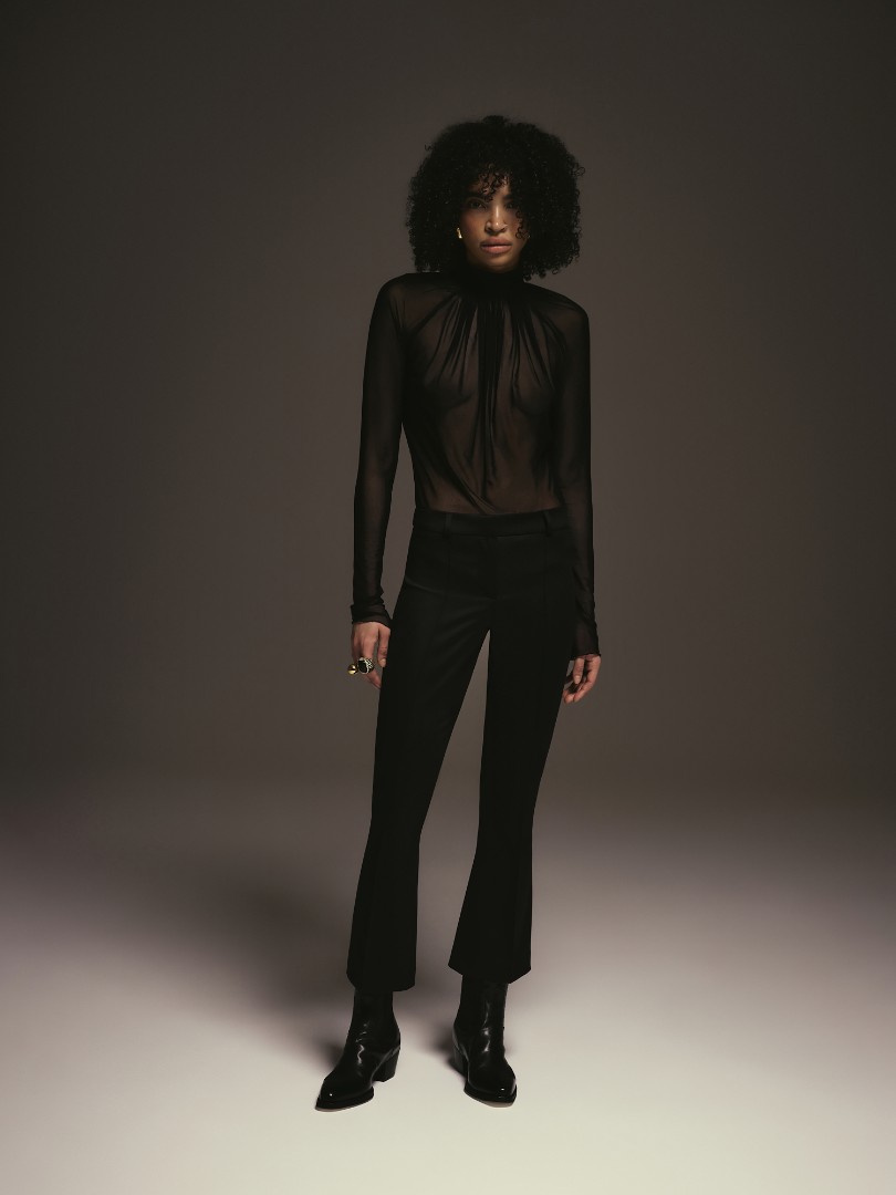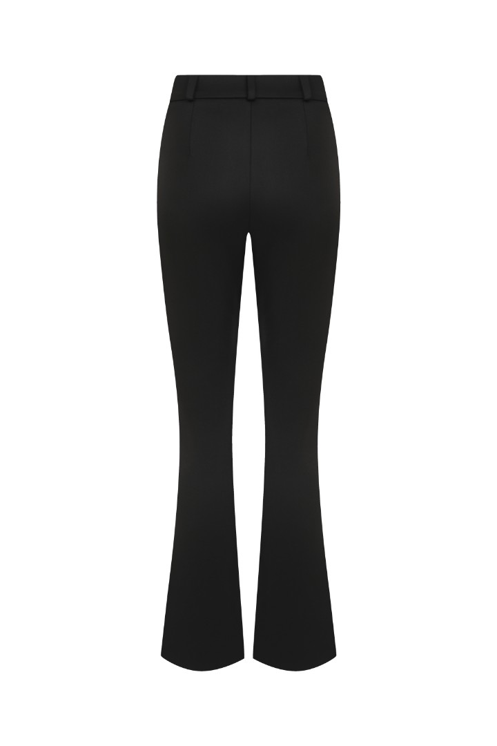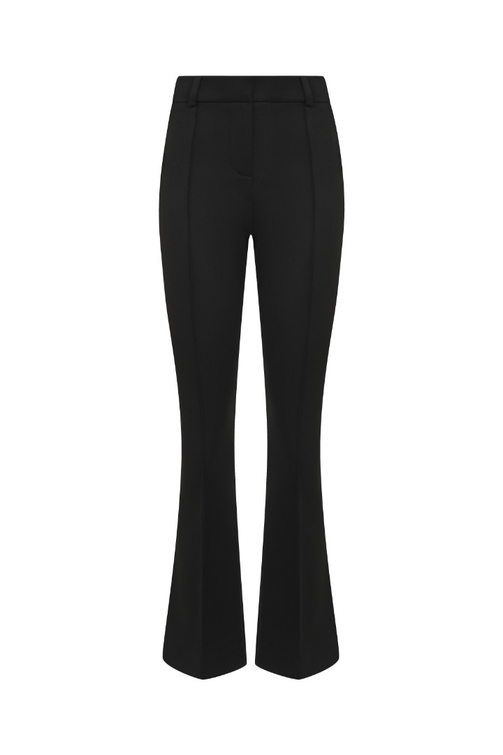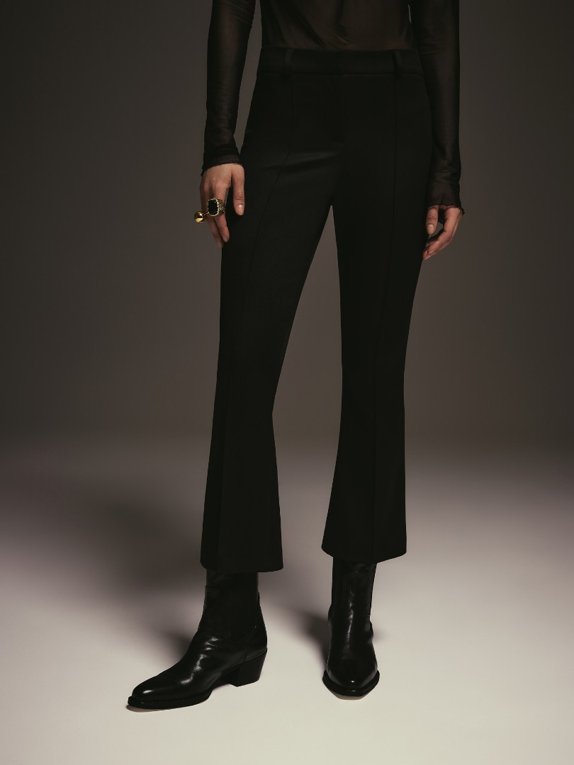 Укороченные костюмные брюки со стрелками. Облегающая модель bootcut, расклёшенная к низу, дополнена шлевками для ремня и застёжкой на молнию и крючок.