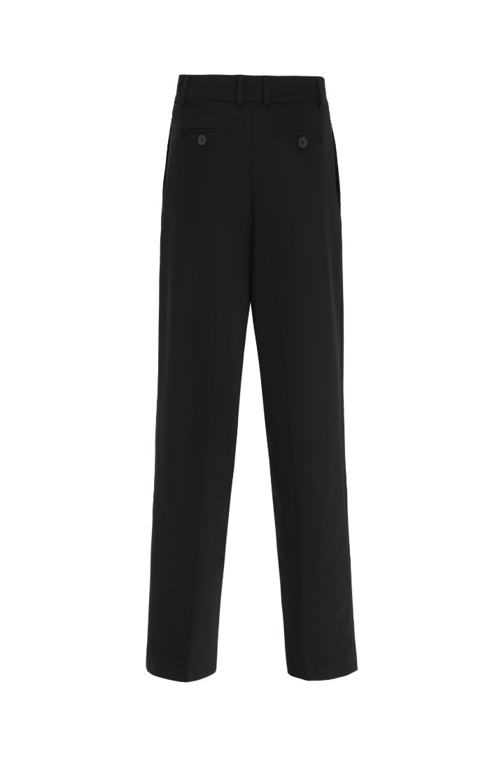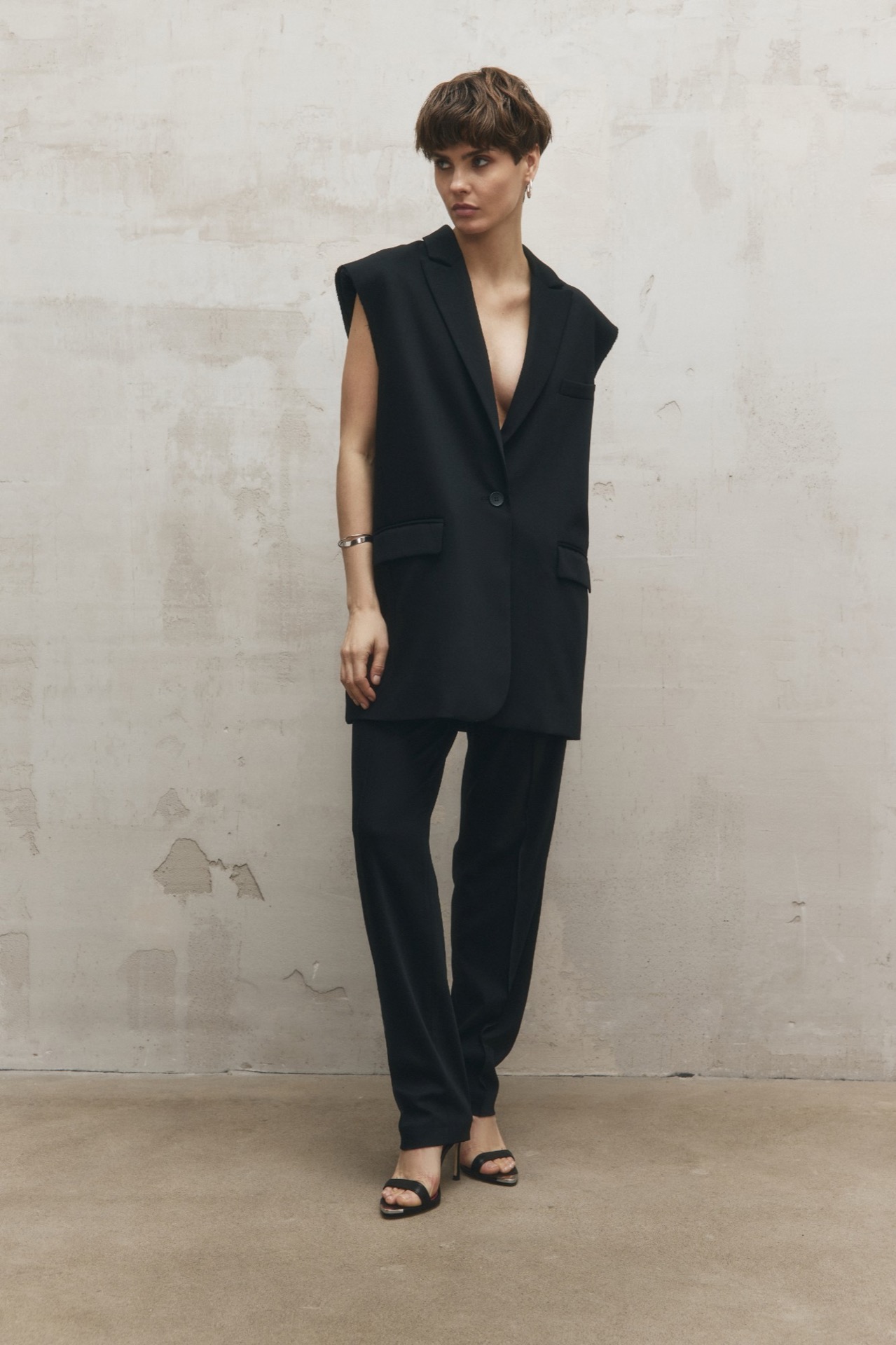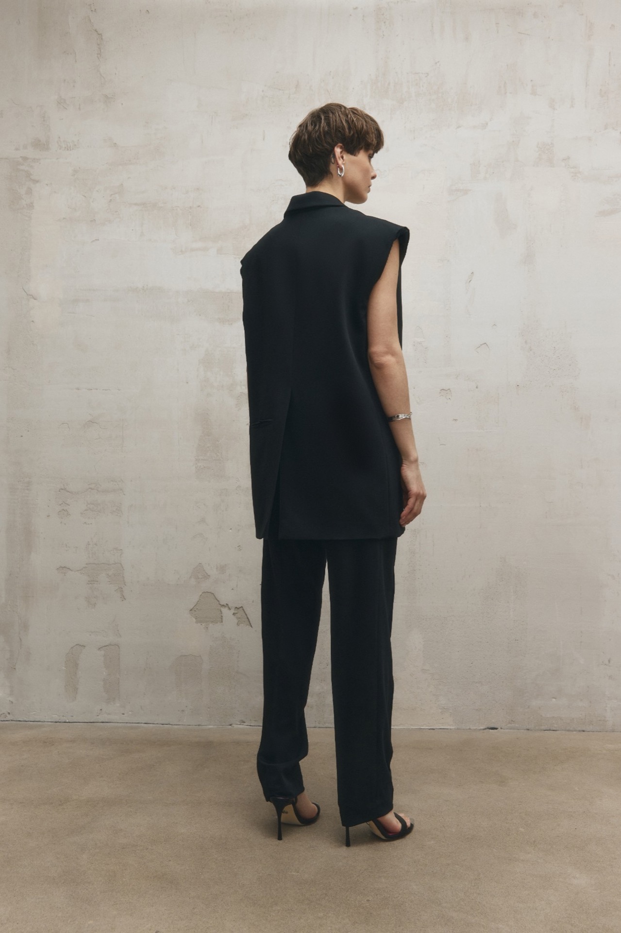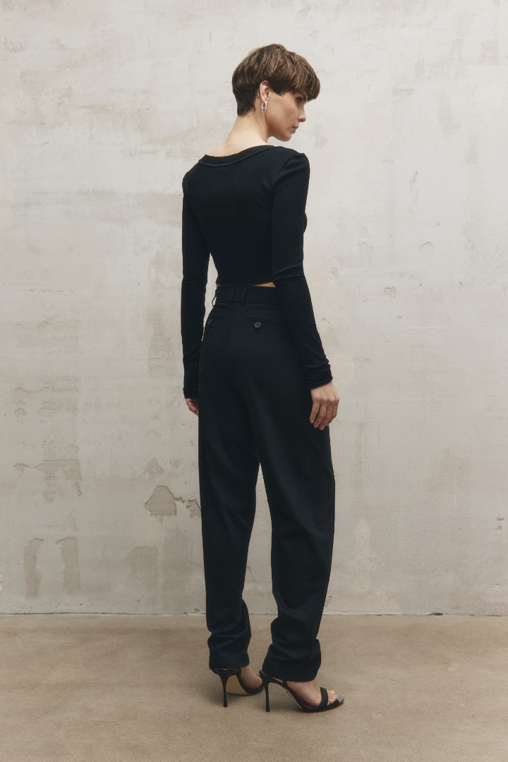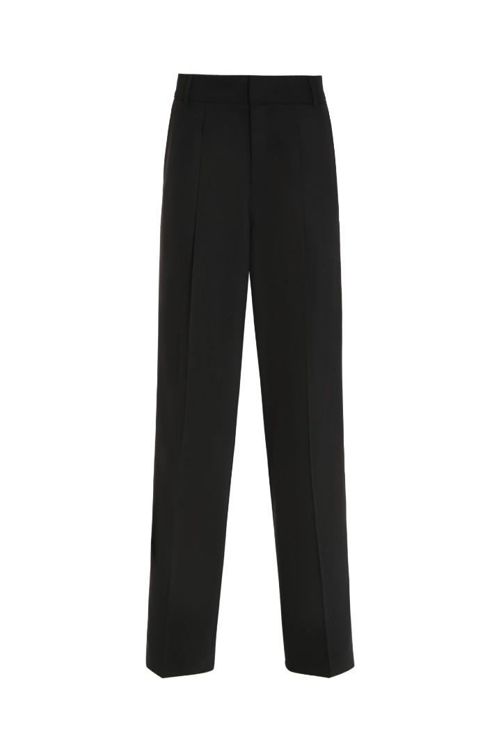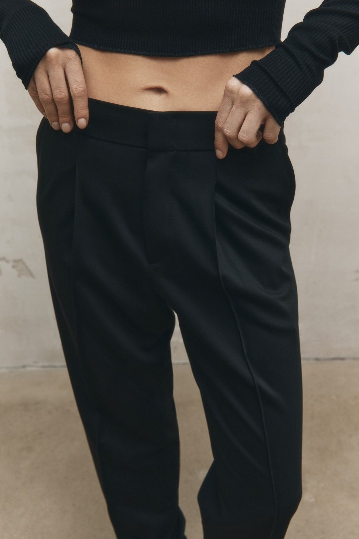 Классические брюки со стрелками из костюмной ткани зауженного силуэта. Модель с функциональными врезными карманами и застежкой на молнию.