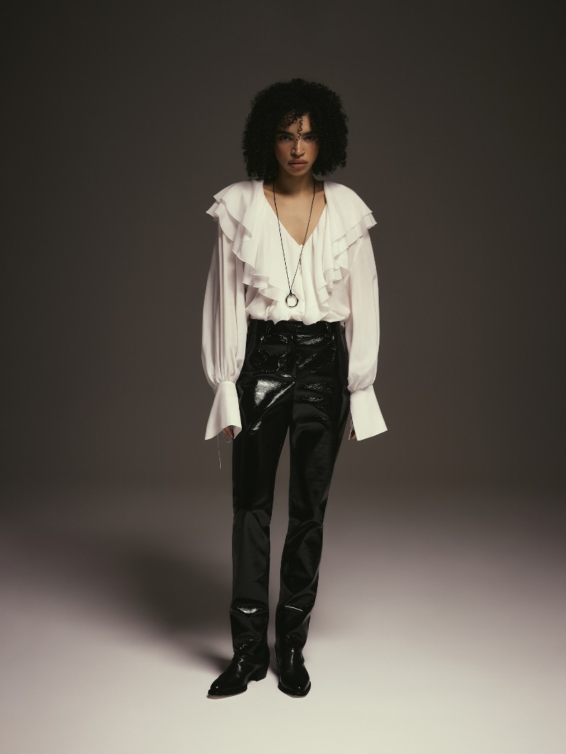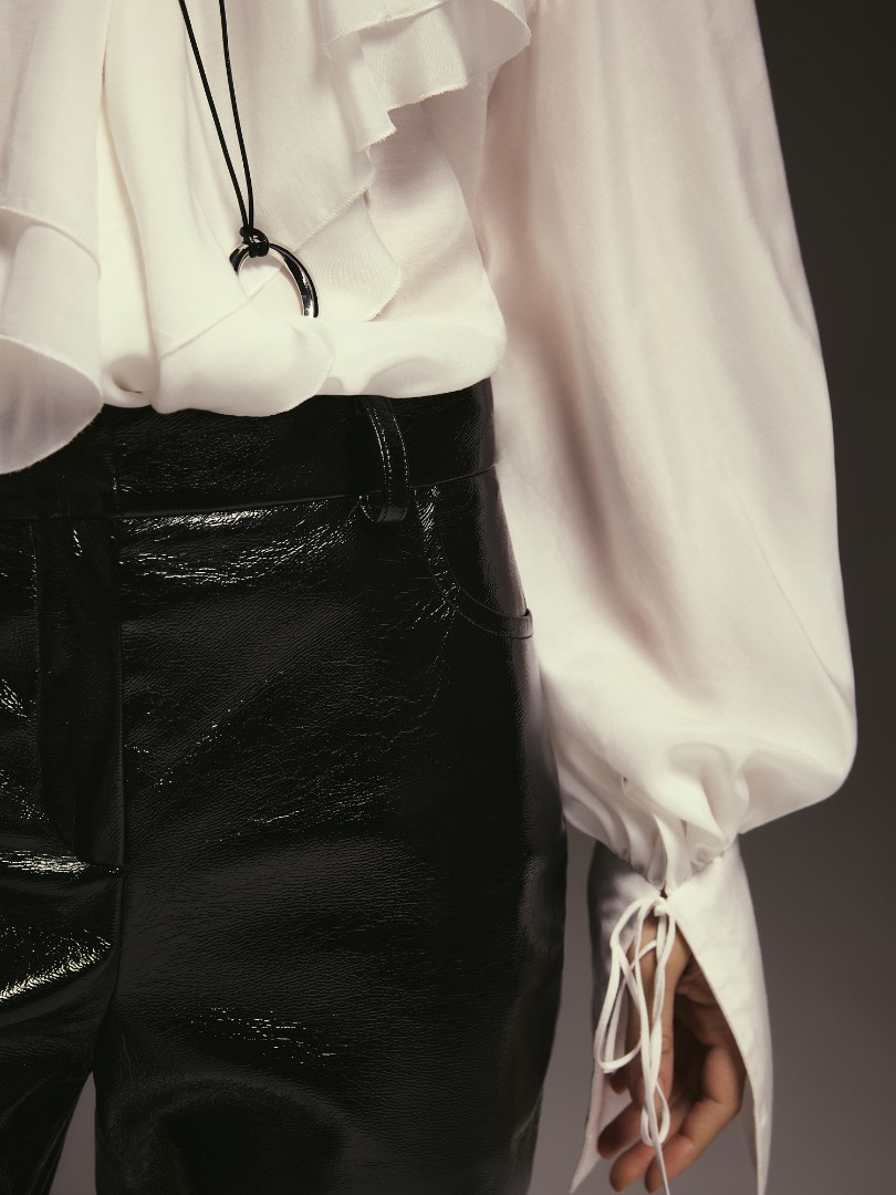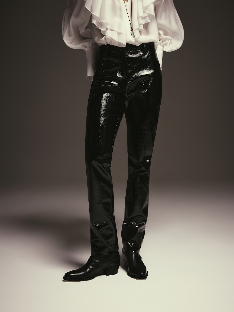Лаковые брюки прямого кроя. Модель со средней посадкой и полной длиной дополнена карманами в боковых швах и шлевками для ремня.