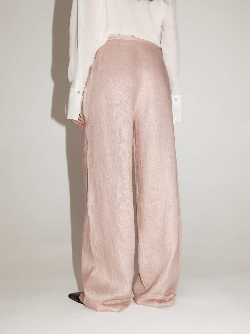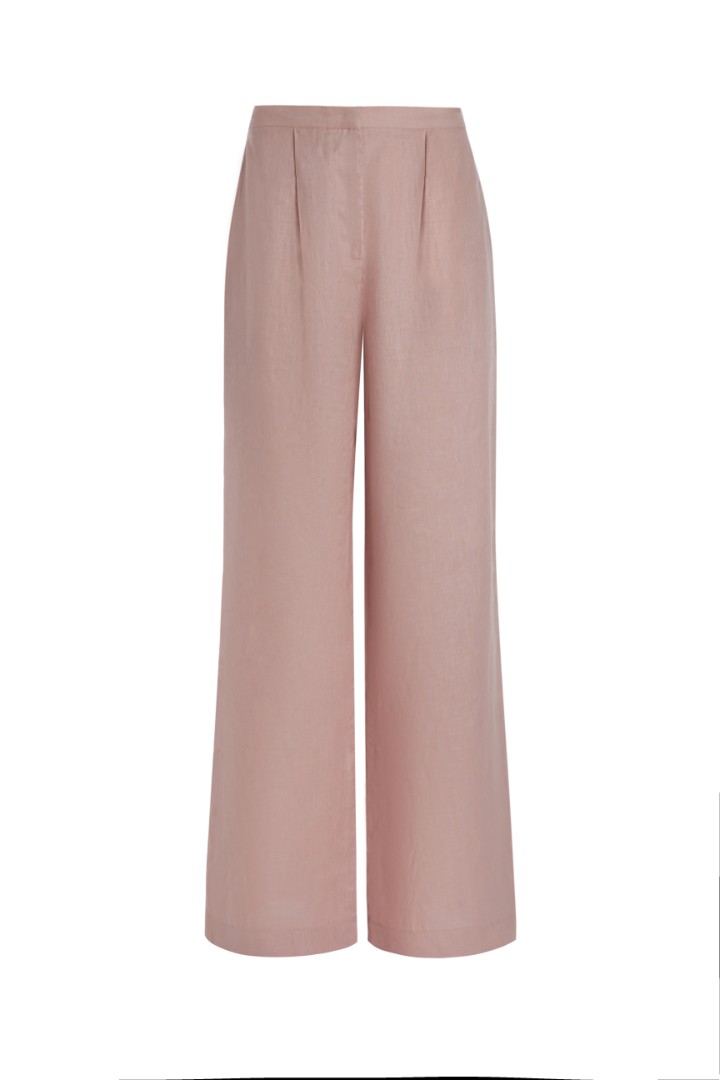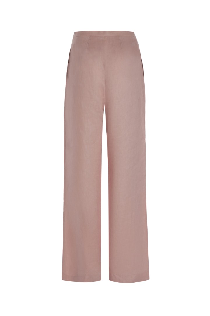 Брюки свободного силуэта из натурального льна. Модель со средней посадкой и декоративными защипами на талии.