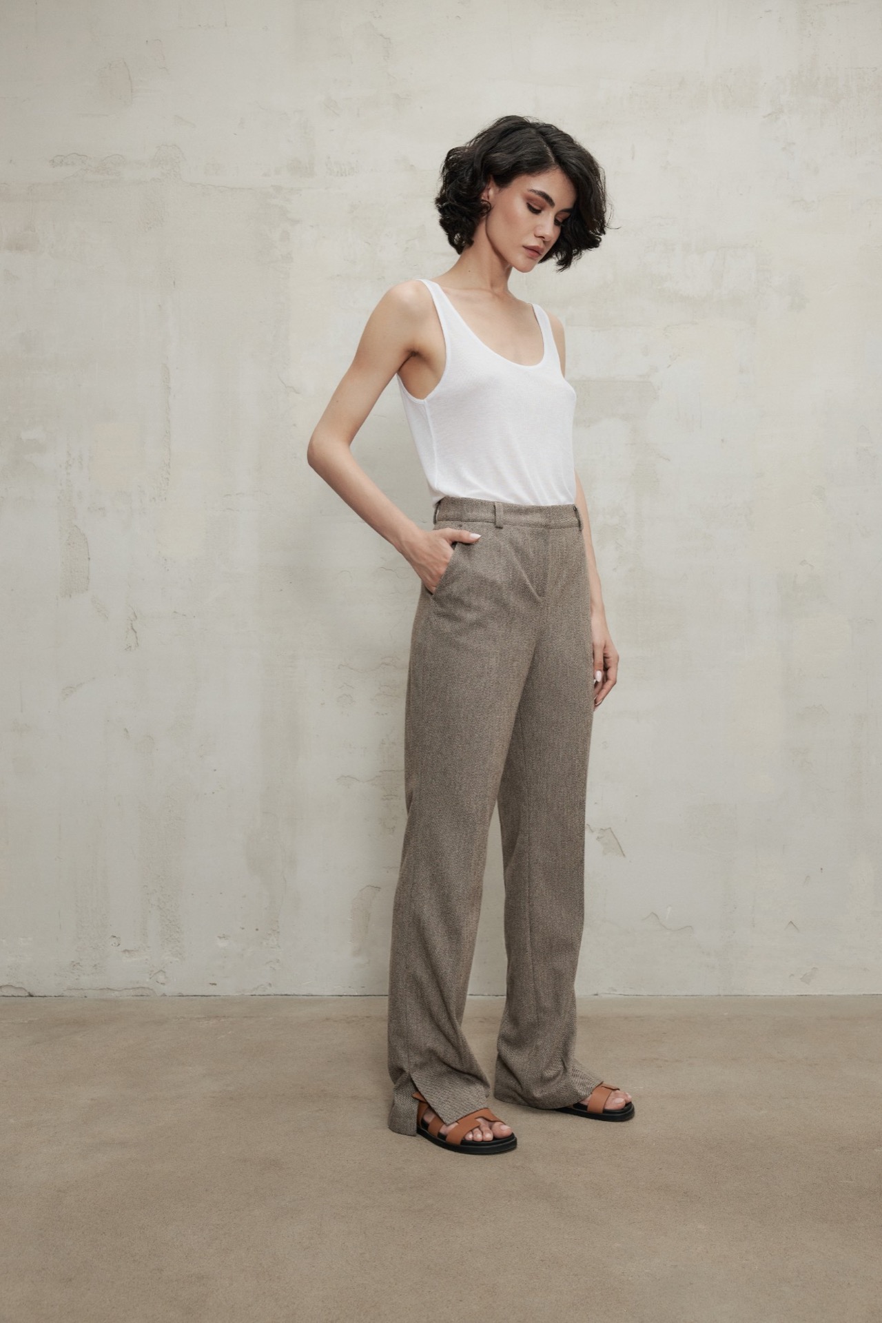 Классический брюки прямого кроя со стрелками из плотной фактурной ткани. Модель дополнена подкладкой до колена – она не сковывает движений и позволяет брюкам долгое время сохранять форму и первоначальный вид. Для создания безупречной костюмной пары сочетайте брюки с жакетом Teddy из той же ткани.