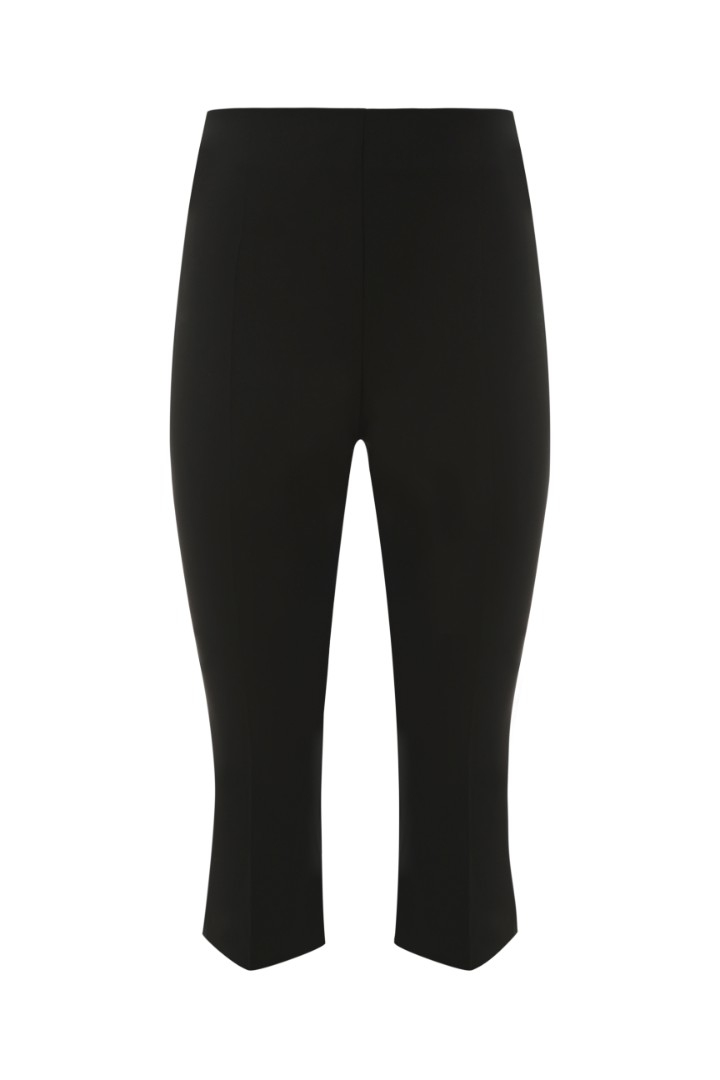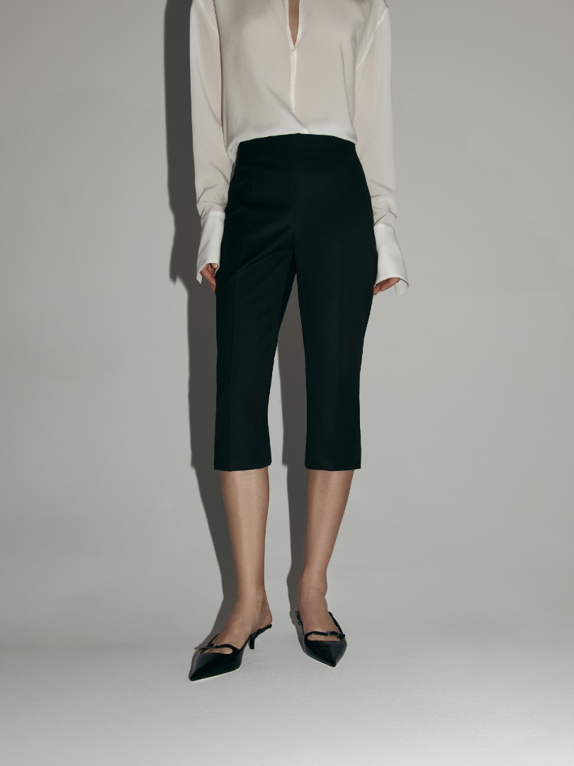 Капри прямого кроя с высокой посадкой. Брючины с длиной ниже колена дополнены деликатными боковыми разрезами и застежкой на молнию в боковом шве. Идеальный вариант как для повседневного, так и для формального утонченного образа в теплое время года.