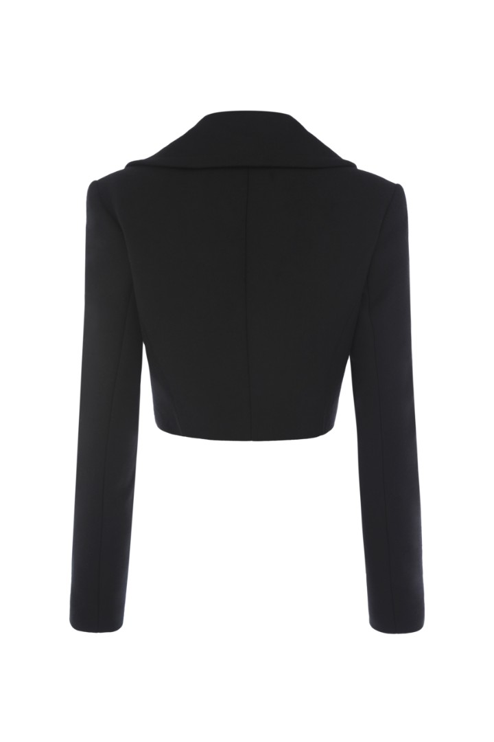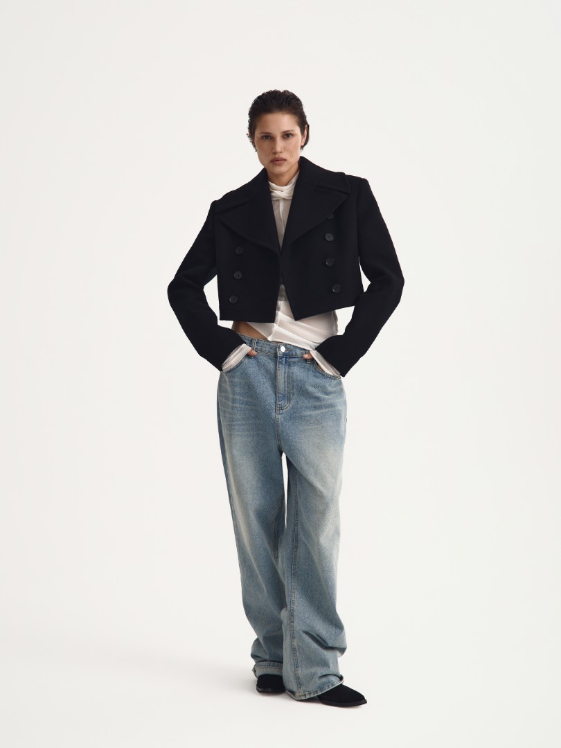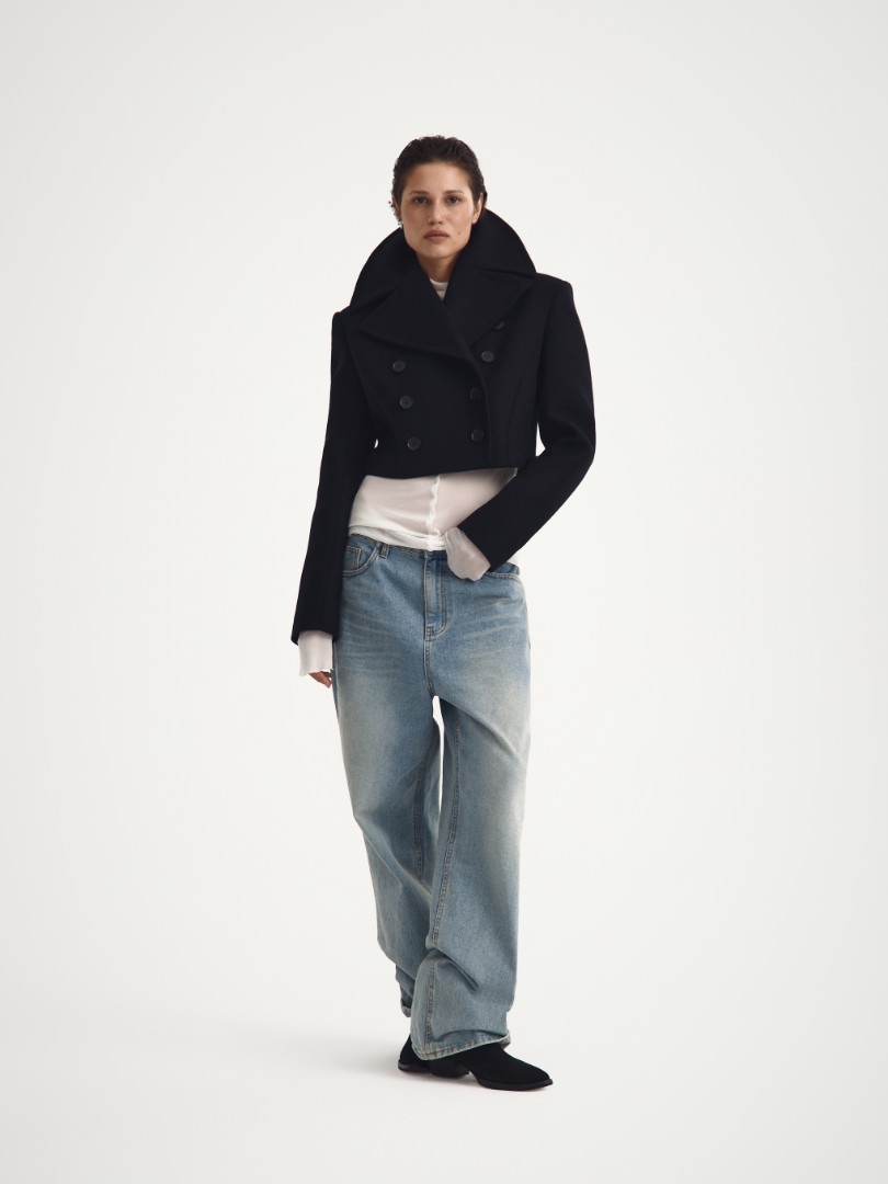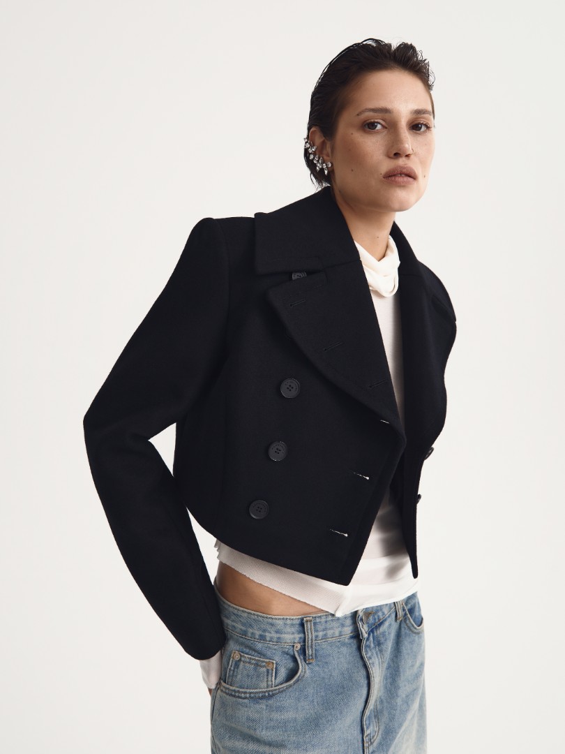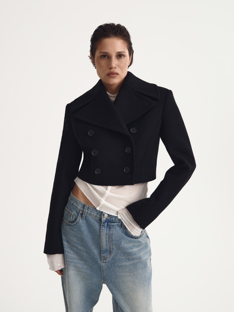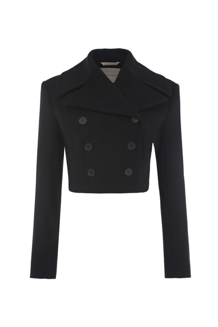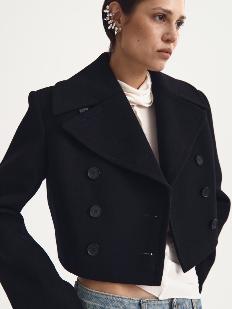 Укороченное пальто полуприталенного кроя. Двубортная модель из шерсти и кашемира с широким воротником и подплечниками идеально дополнит как строгие, так и расслабленные повседневные аутфиты.
