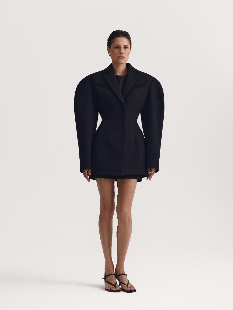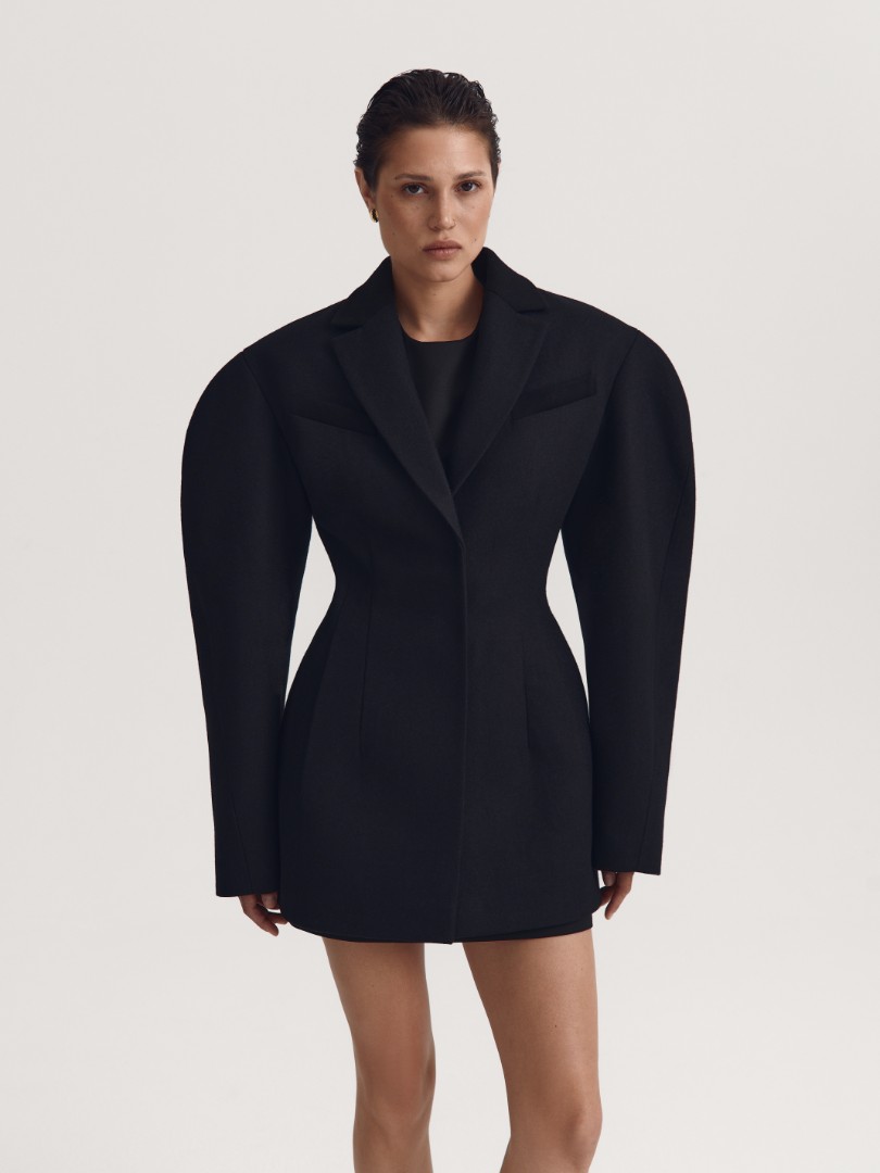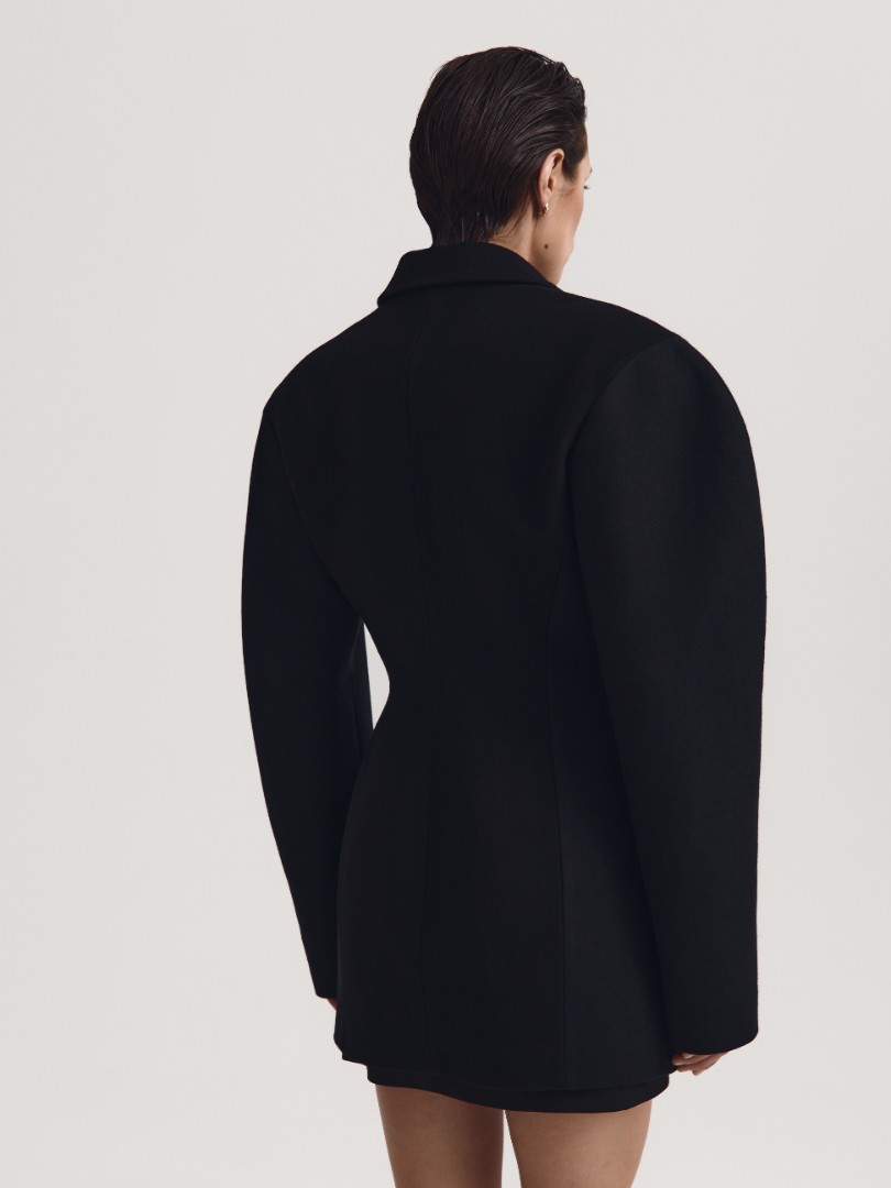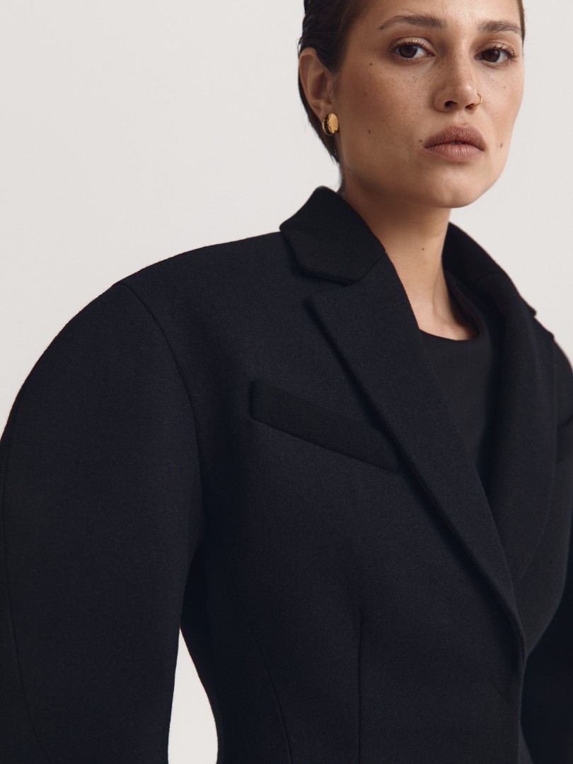 Удлиненное пальто-бушлат приталенного кроя с объемными плечами. Классический отложной воротник, 2 врезных кармана с листочкой и акцентные вытачки, подчеркивающие талию.