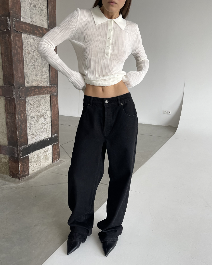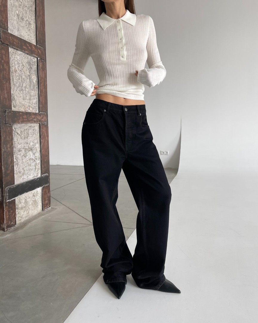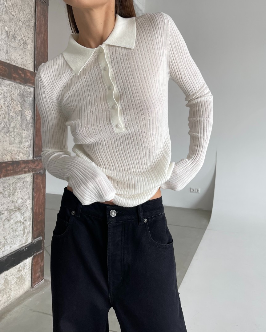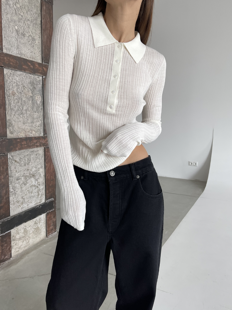 Джемпер из плотной эластичной вискозы в рубчик. Удлинённые рукава и воротник-поло с застёжкой на пуговицы.