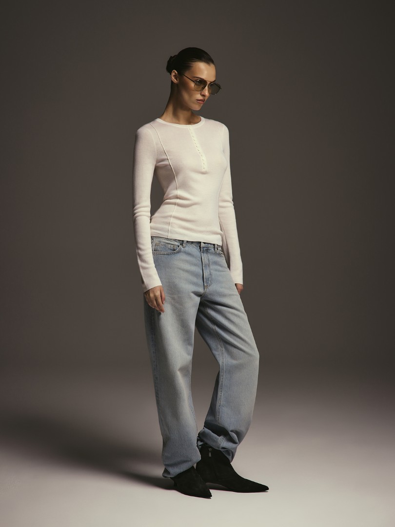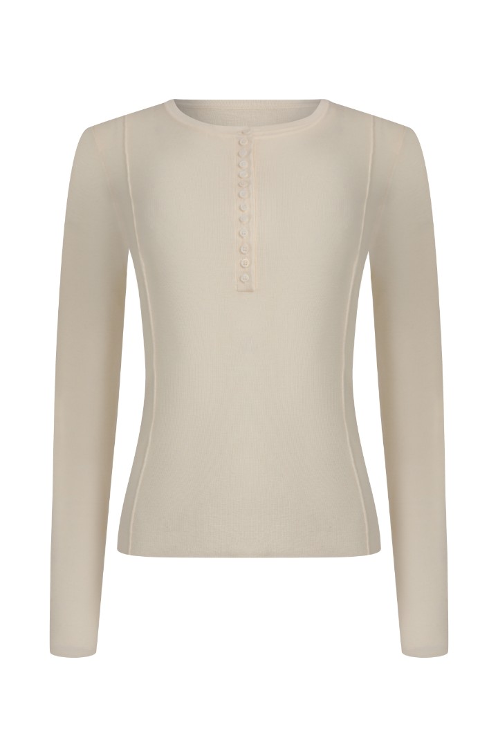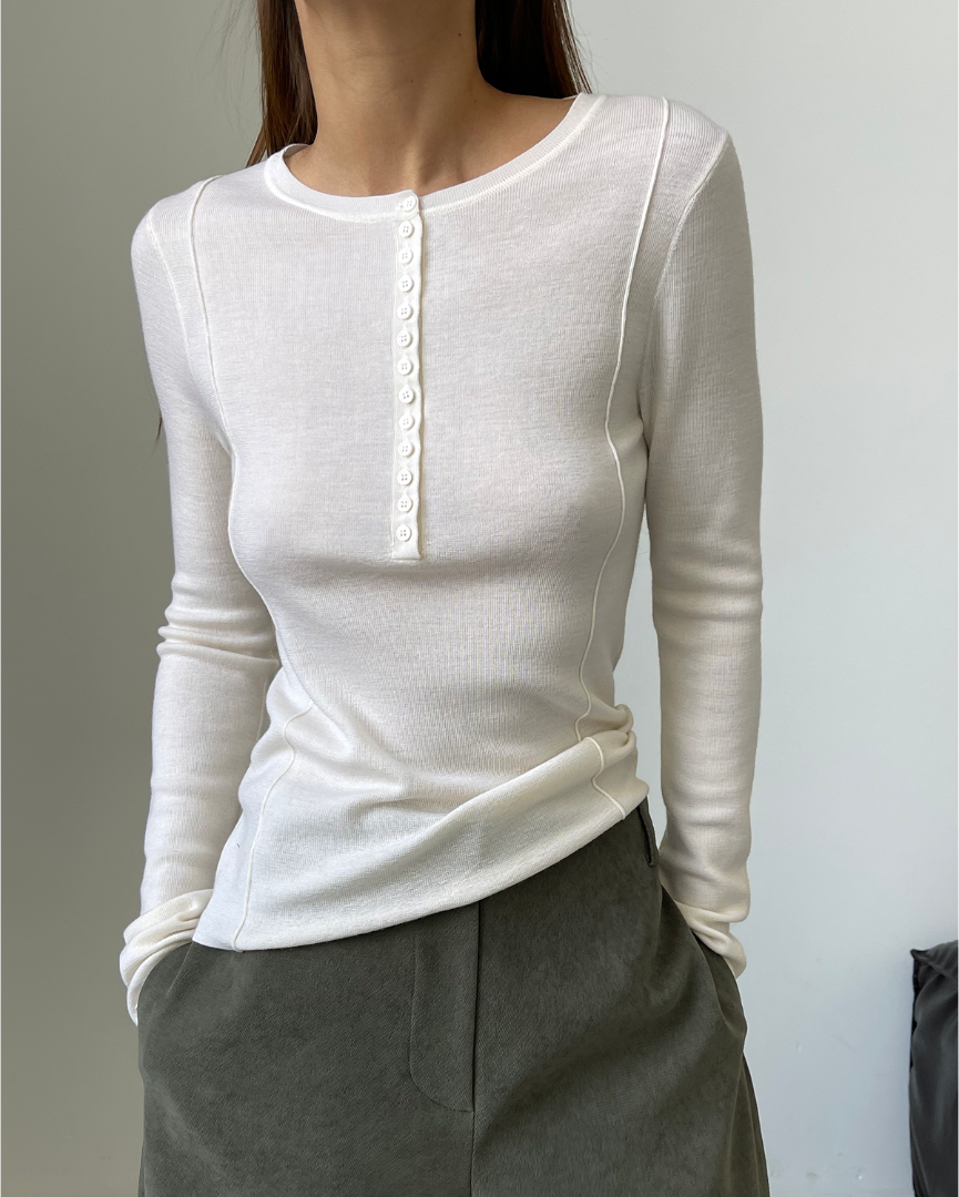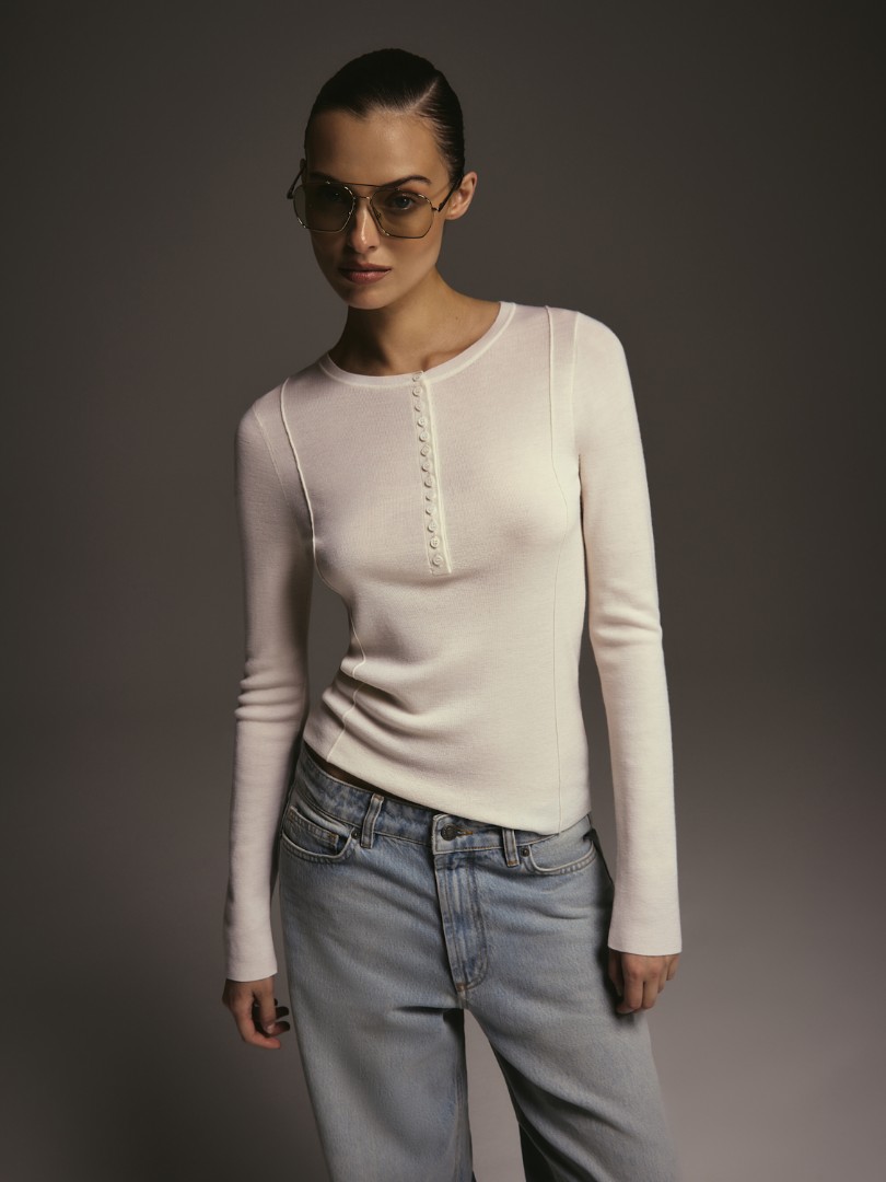 Джемпер облегающего кроя из тонкого трикотажа. Круглый вырез, планка с пуговицами и декоративные швы спереди.