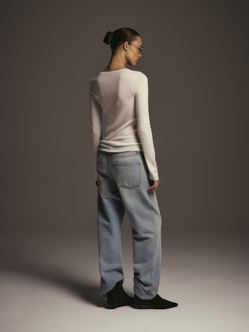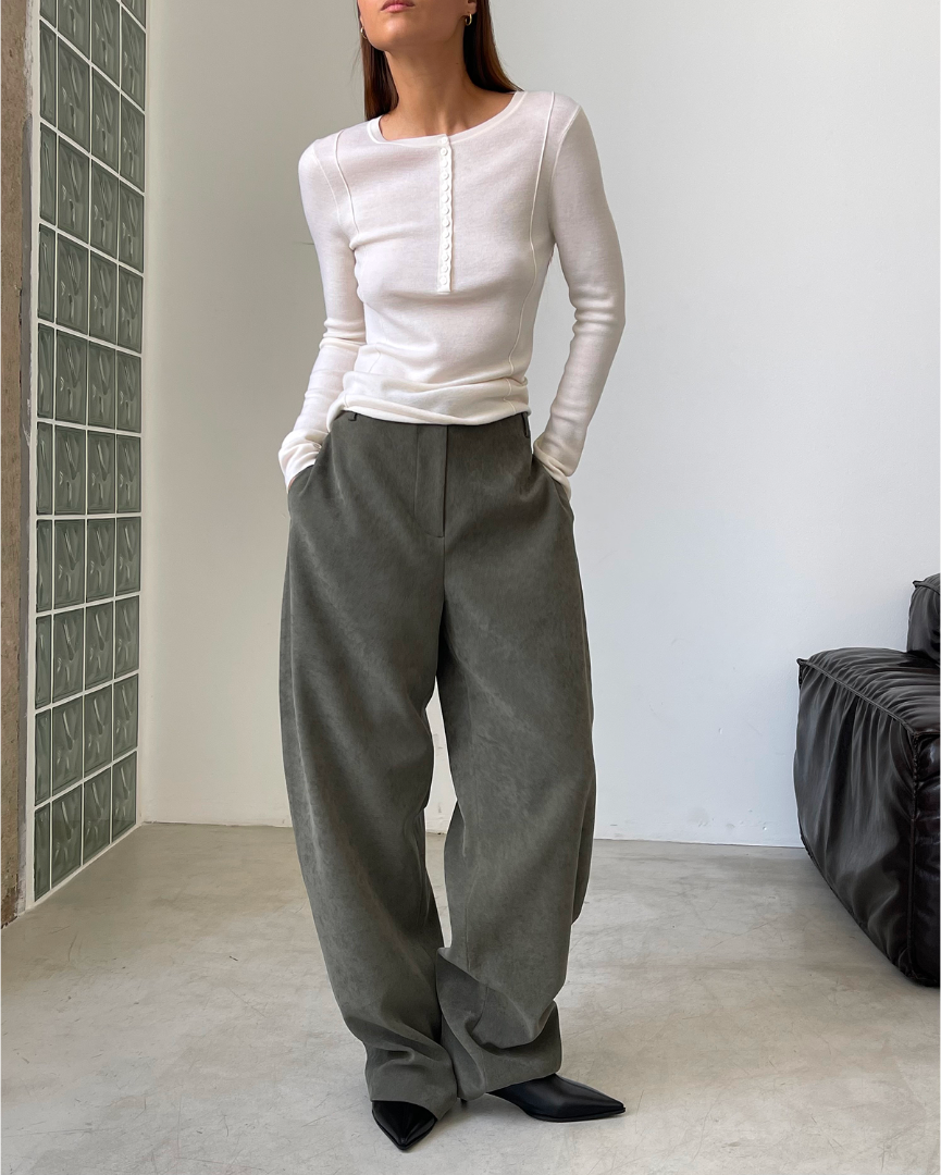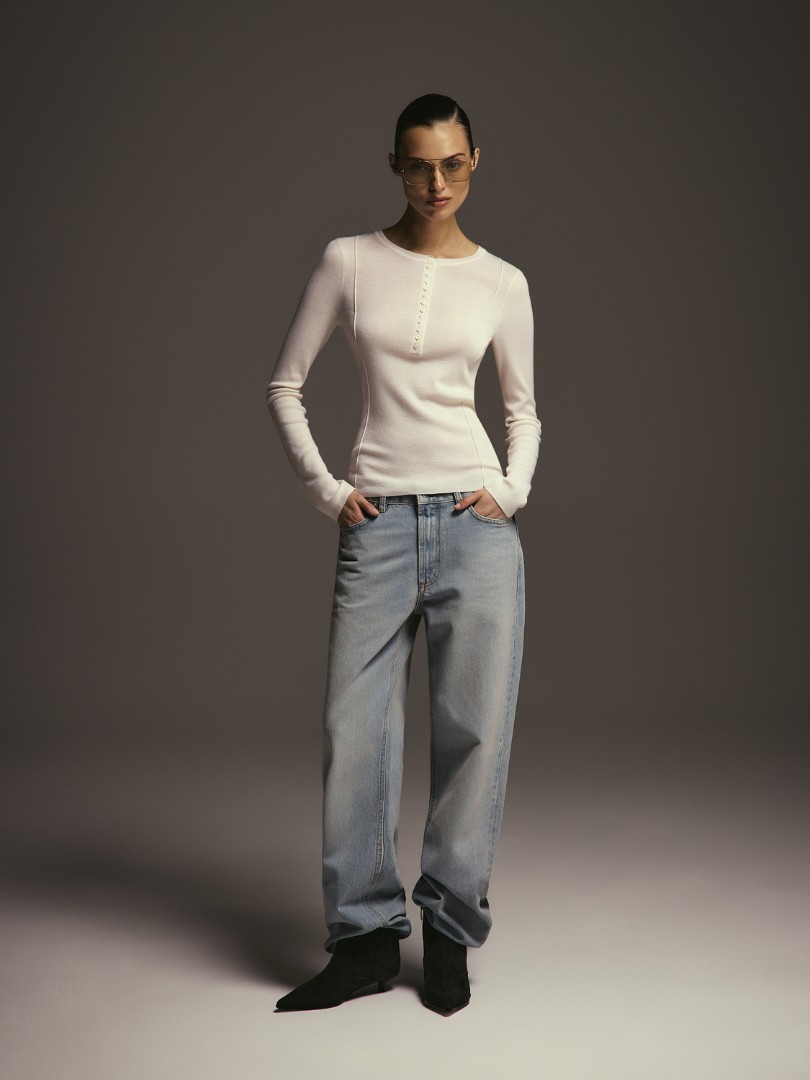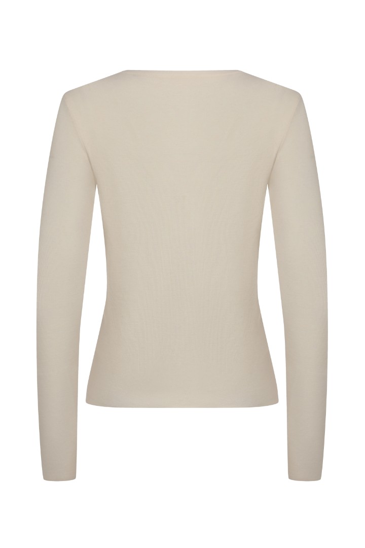 Джемпер облегающего кроя из тонкого трикотажа. Круглый вырез, планка с пуговицами и декоративные швы спереди.