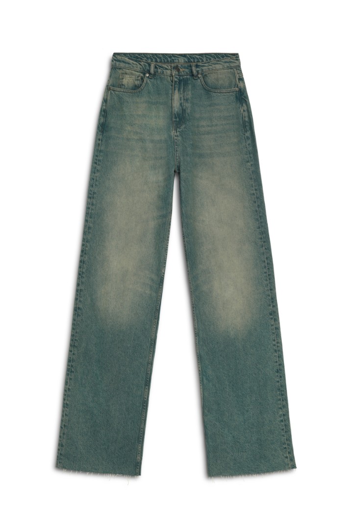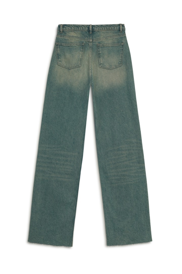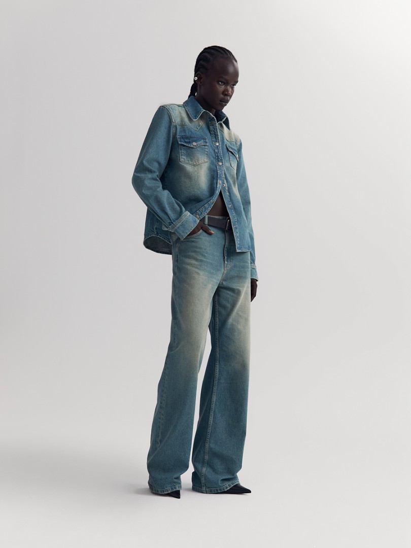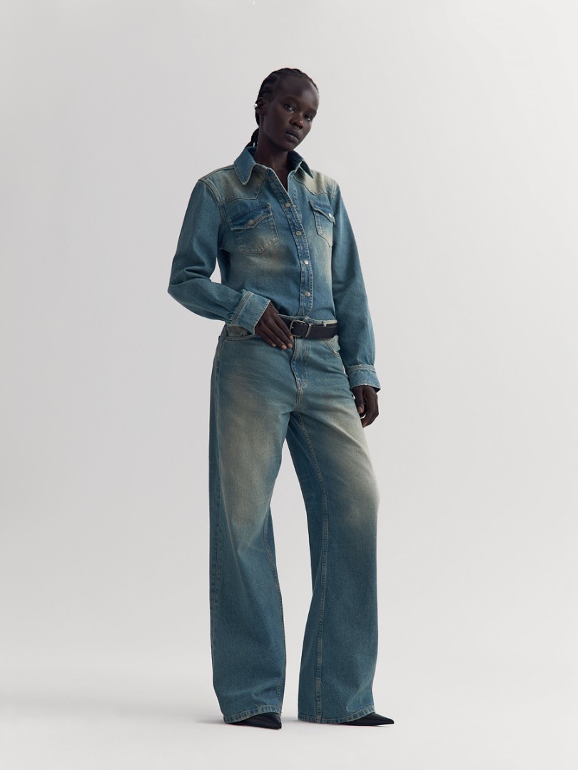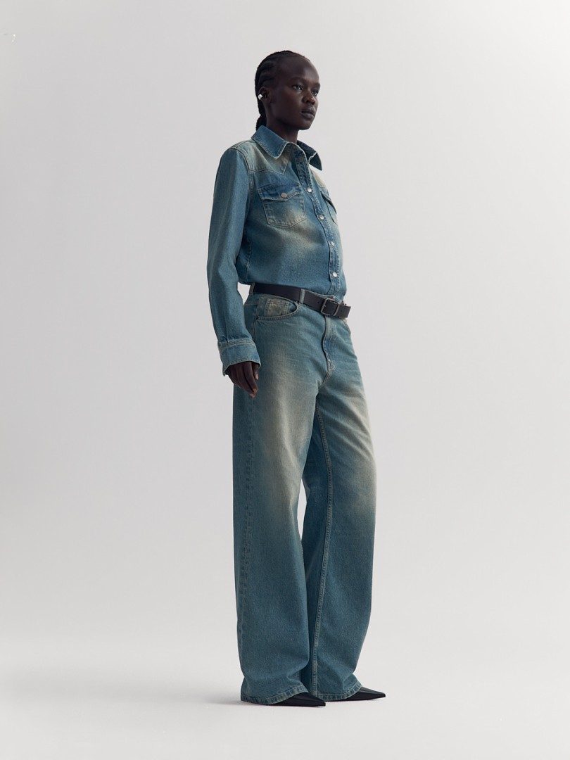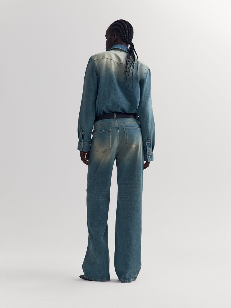 Прямые джинсы со средней посадкой из плотного денима с эффектом делаве. Застежка на молнию и пуговицу спереди.
