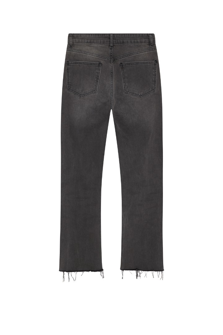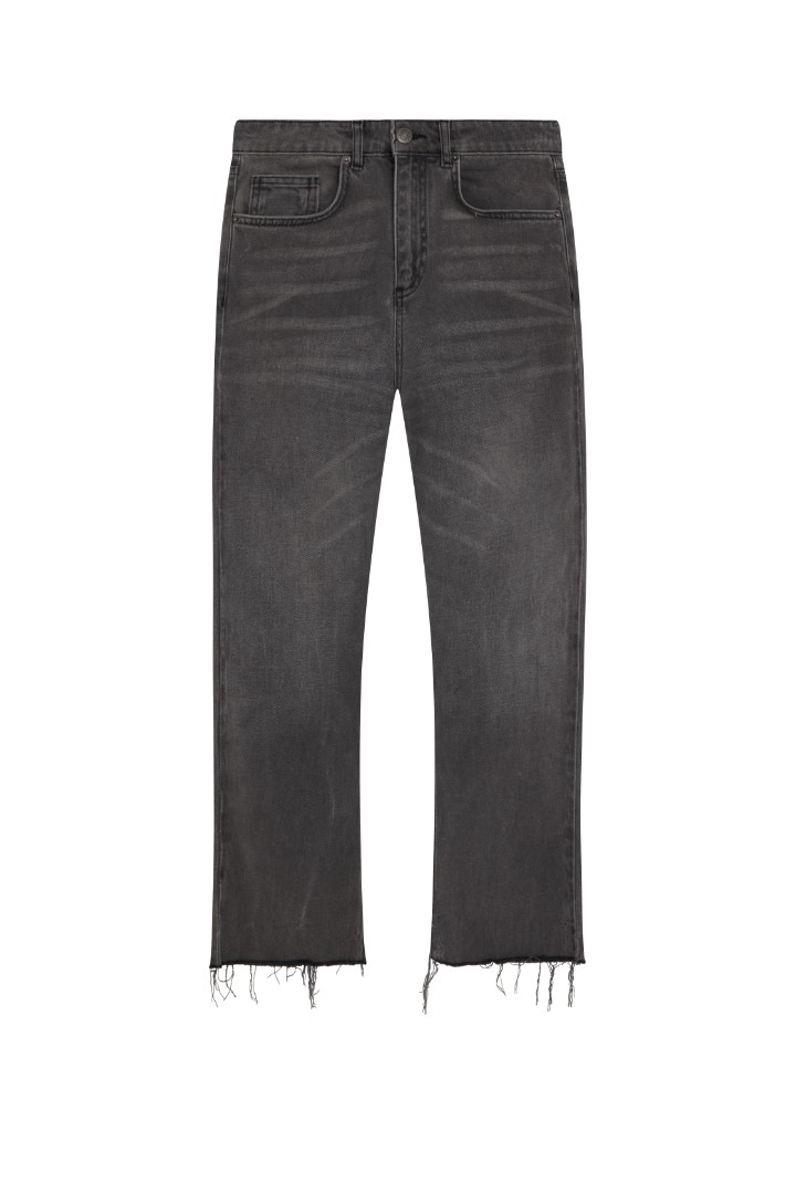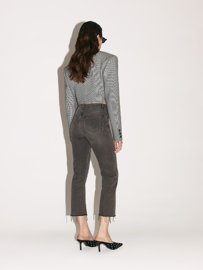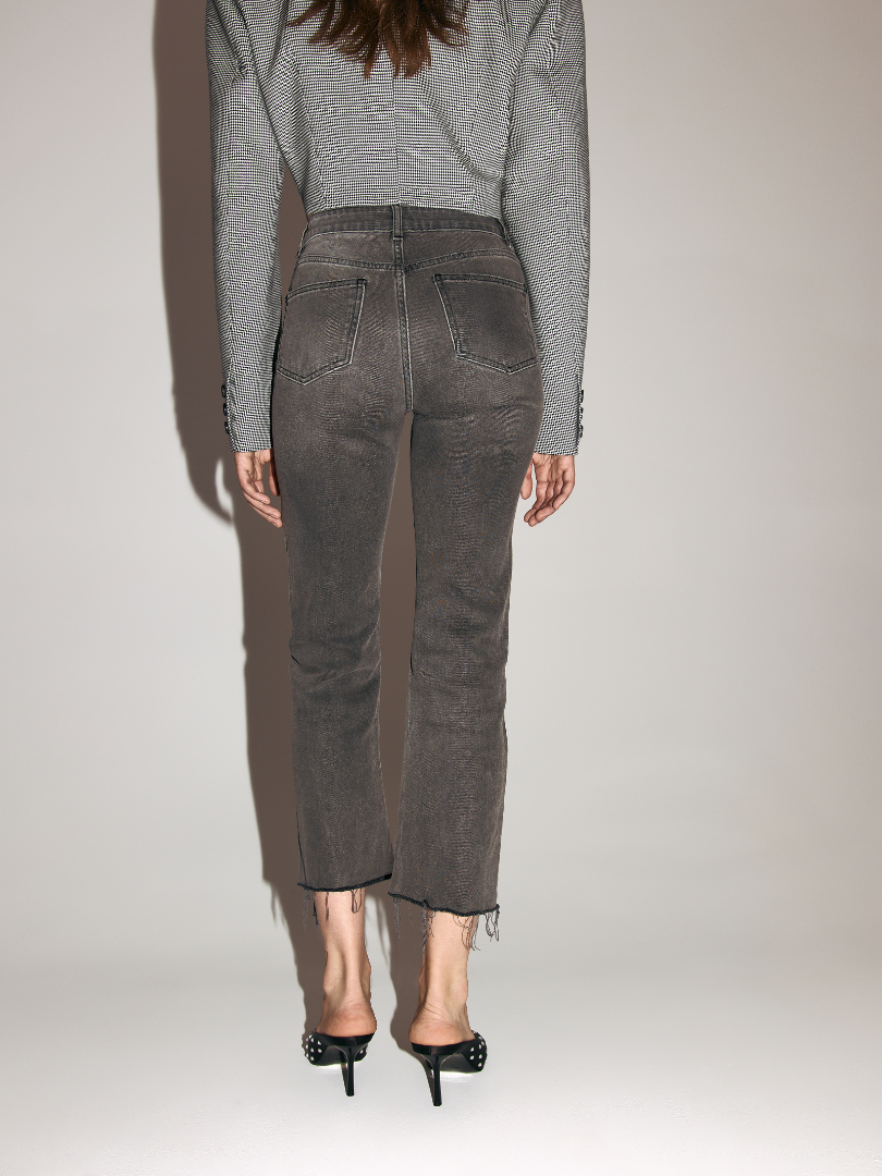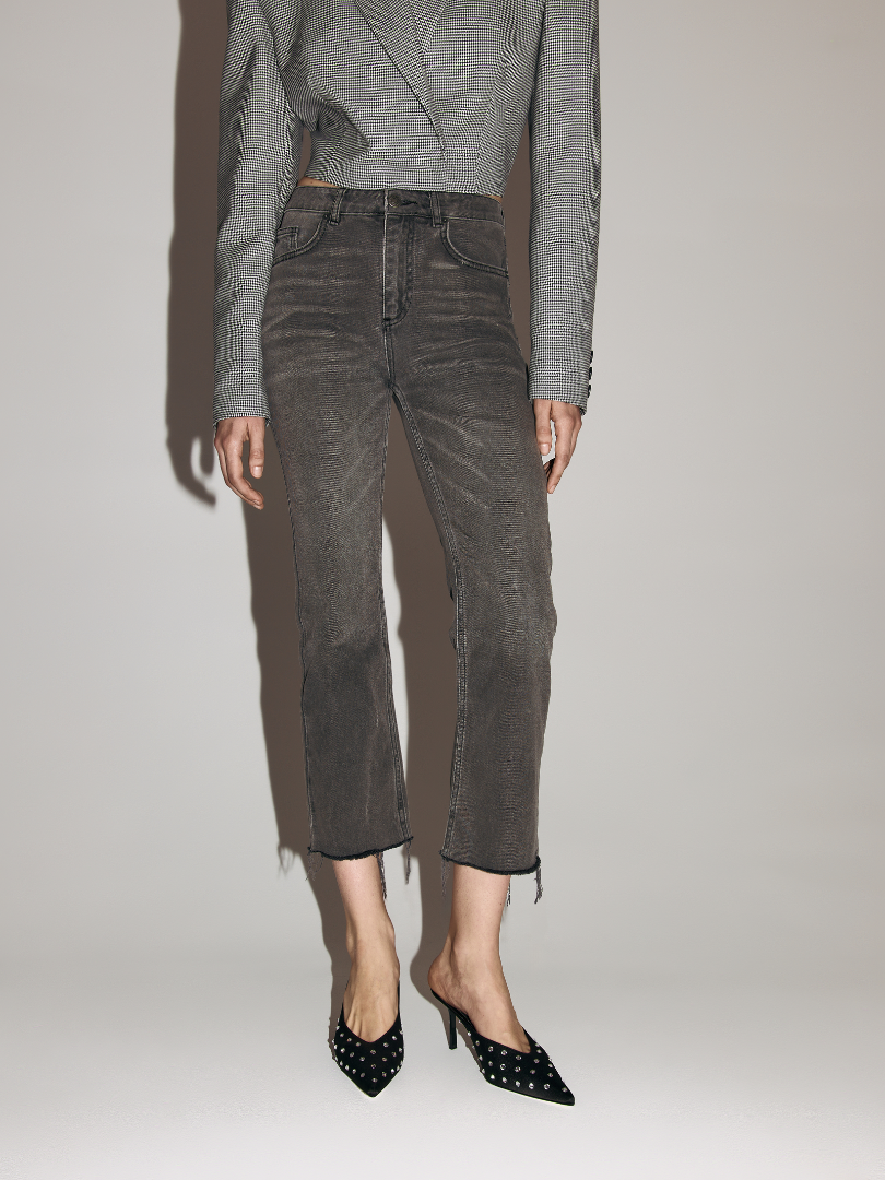Укороченные джинсы slim fit со средней посадкой. Модель с легким эффектом делаве, вискерами и необработанным нижним краем на брючинах.