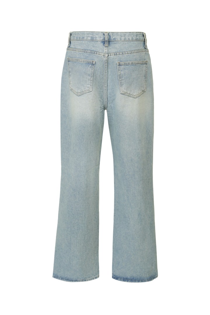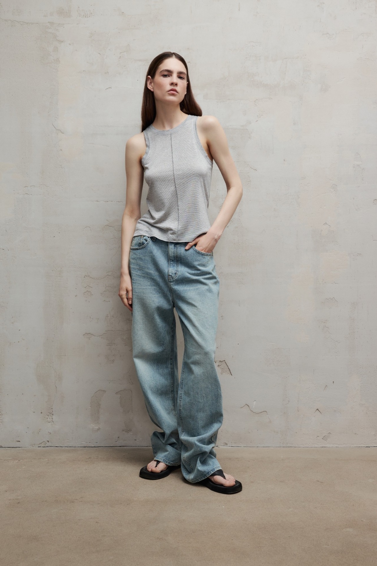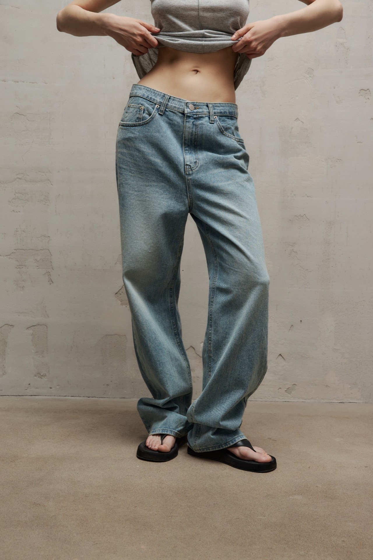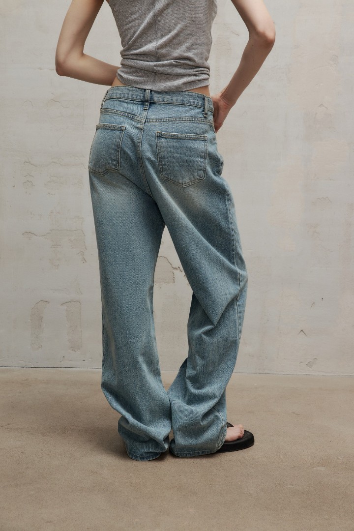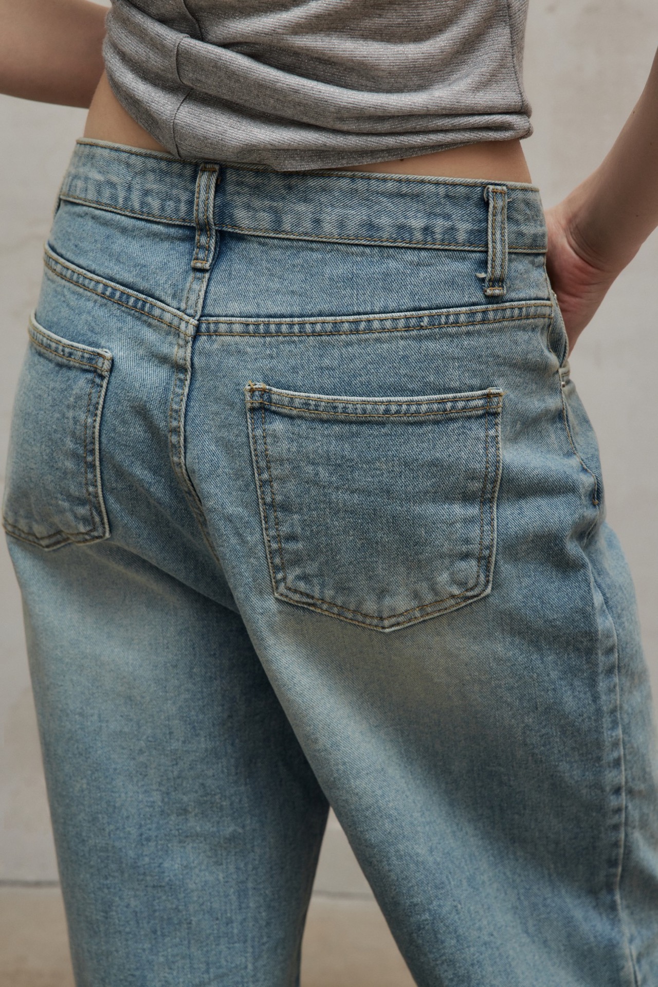 Джинсы силуэта relaxed fit: прямые от бедра штанины, свободная комфортная посадка и чуть заниженная талия. Модель из плотного денима с легким эффектом потертости дополнена удлиненным средним швом.