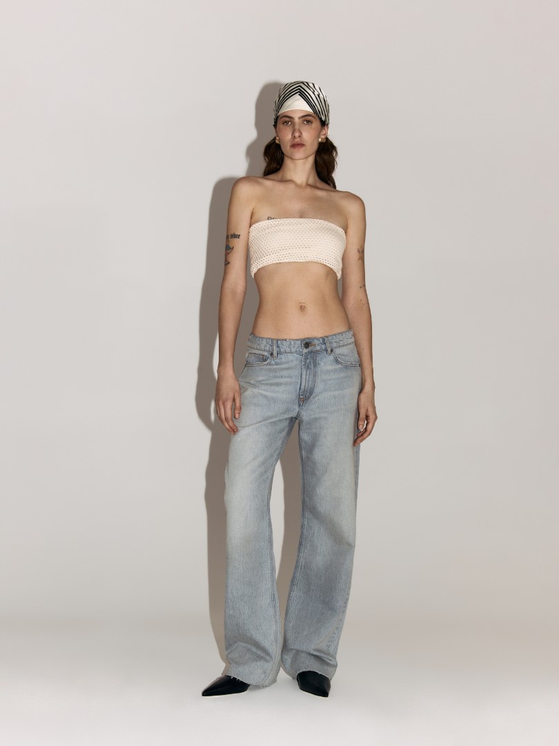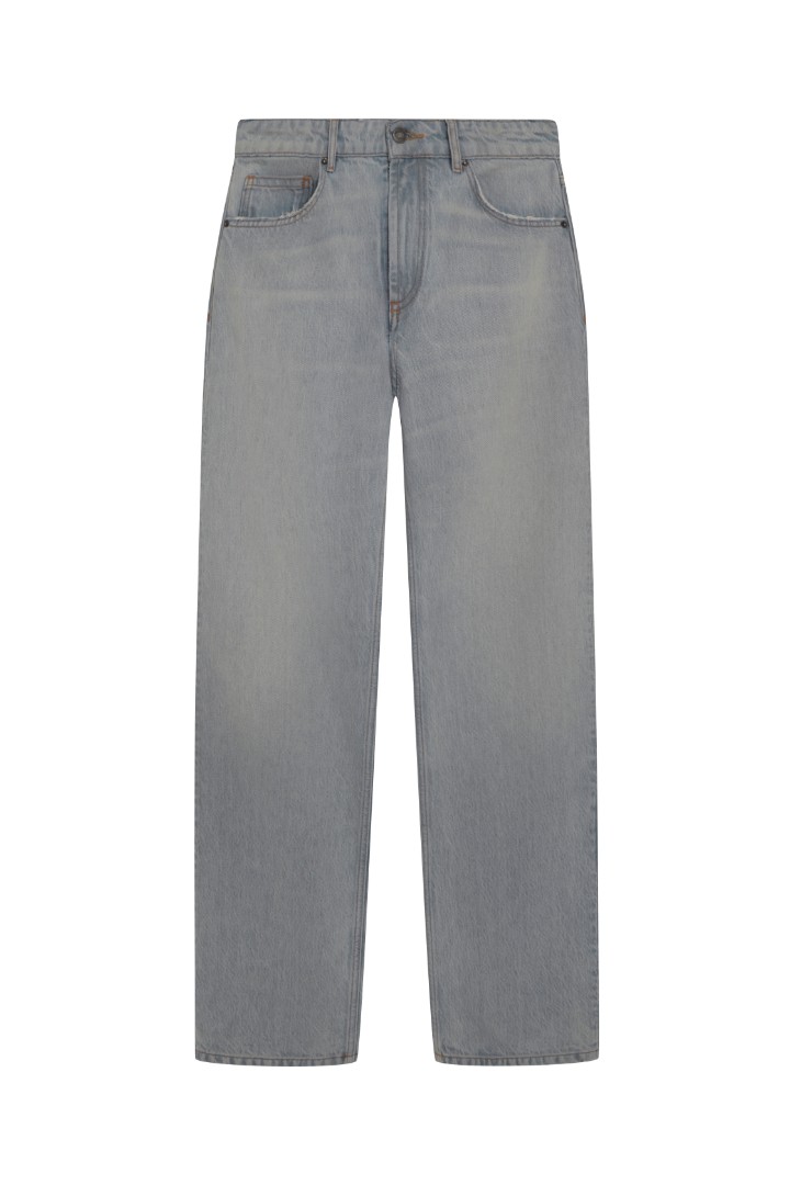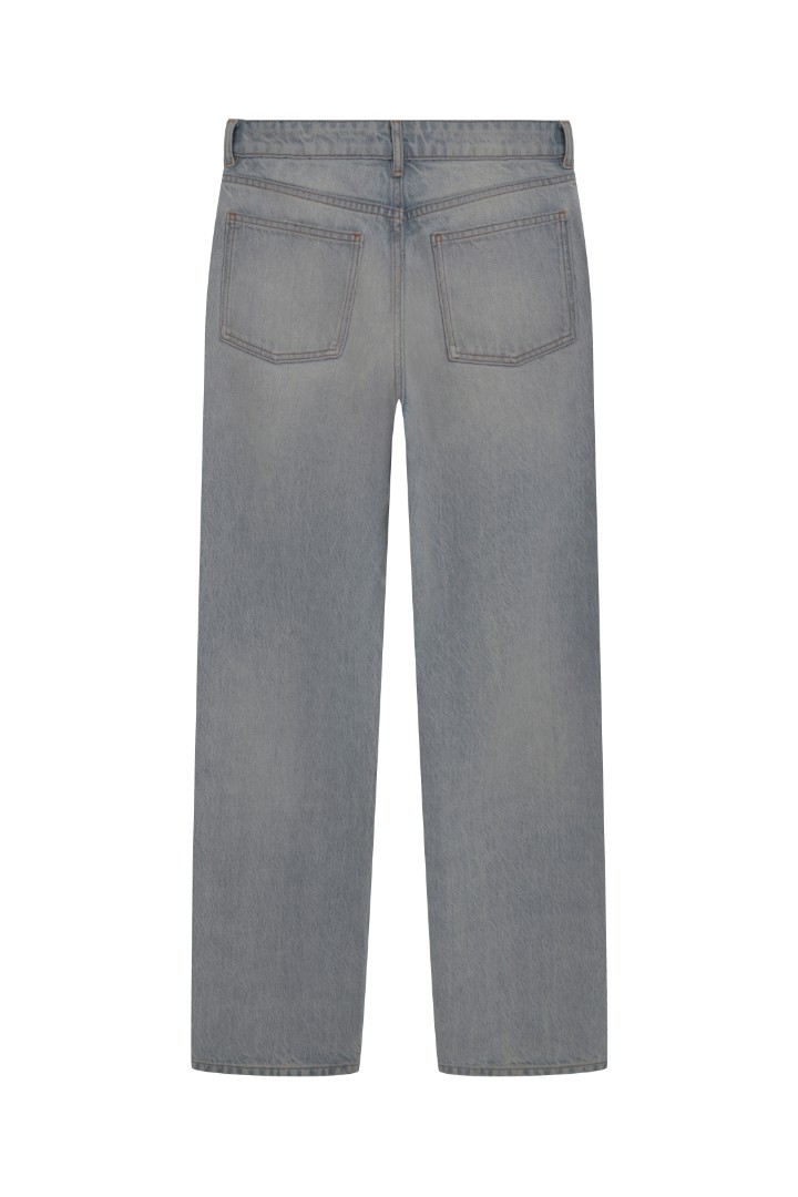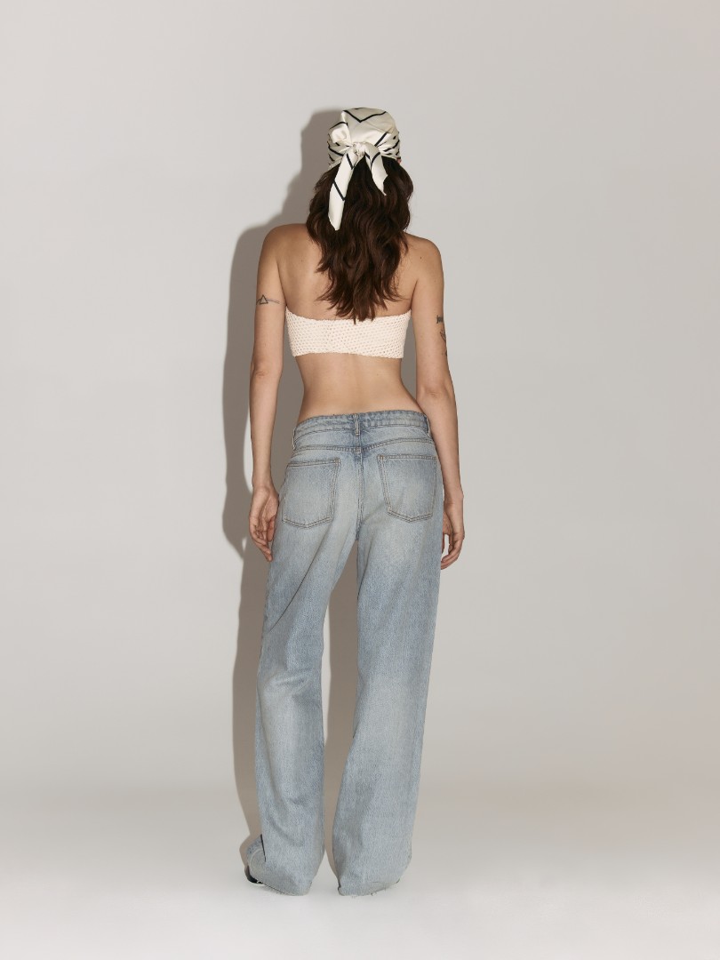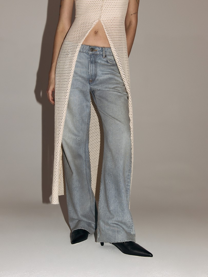 Свободные джинсы со средней посадкой и необработанным нижним краем на брючинах. Приглушенный голубой оттенок с эффектом делаве придает изделию винтажный вид.
