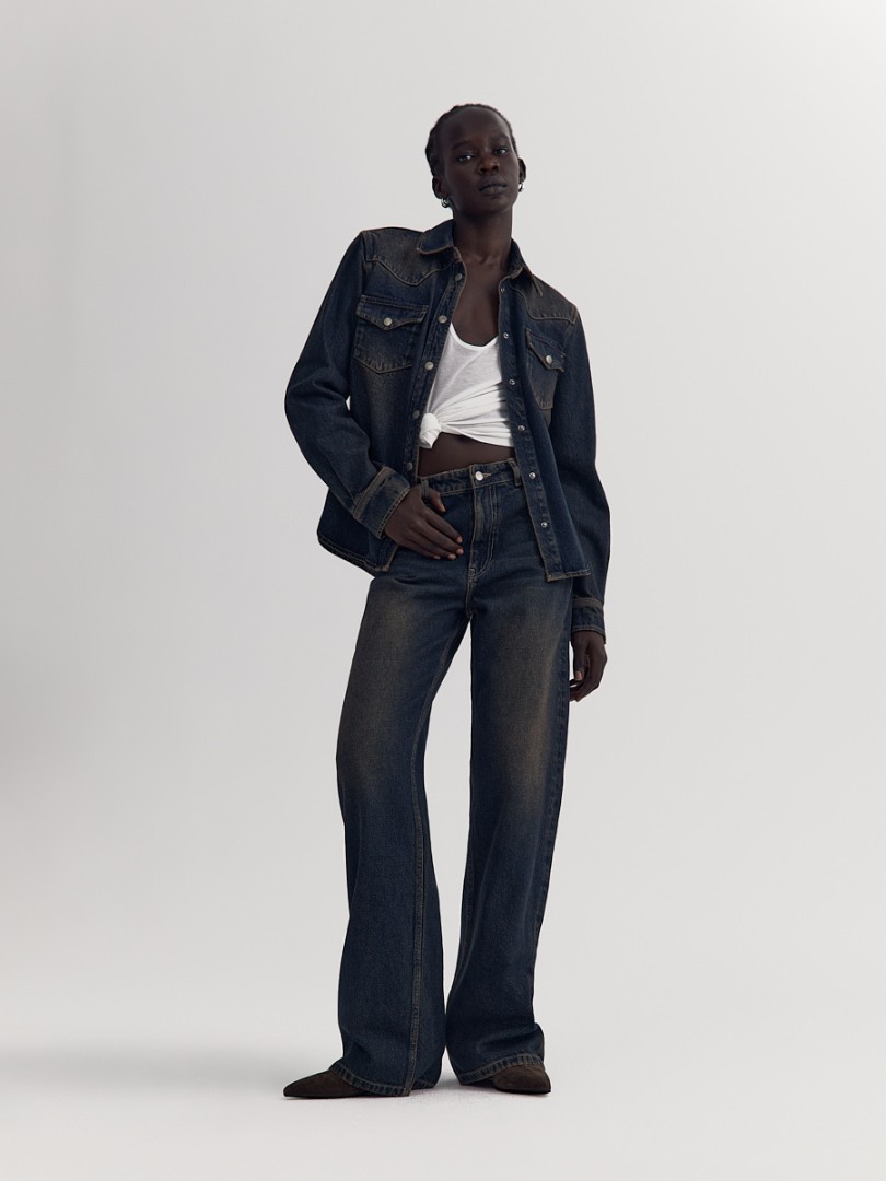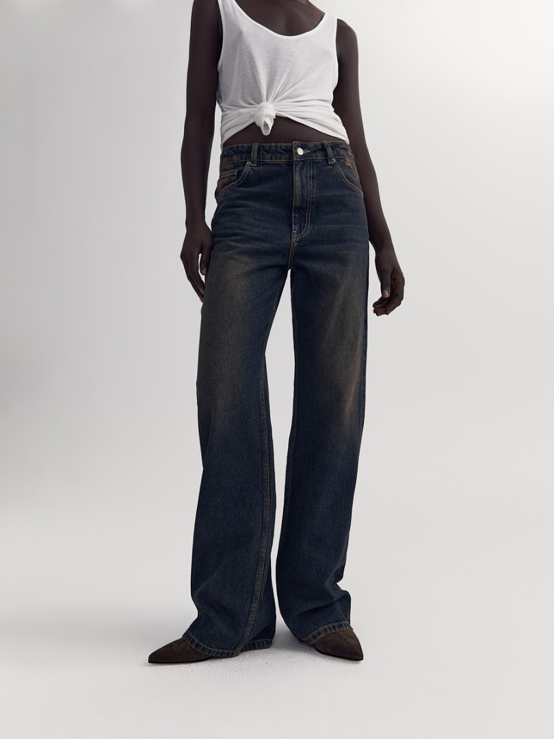 Прямые джинсы со средней посадкой из плотного денима с эффектом делаве. Необработанный нижний край на брючинах. Застежка на молнию и пуговицу спереди.