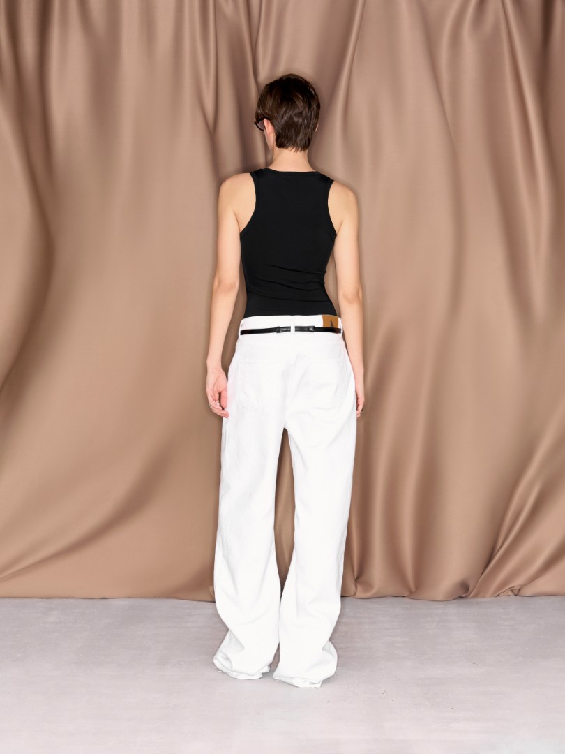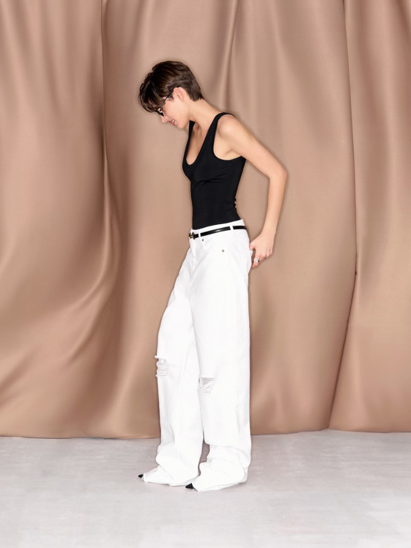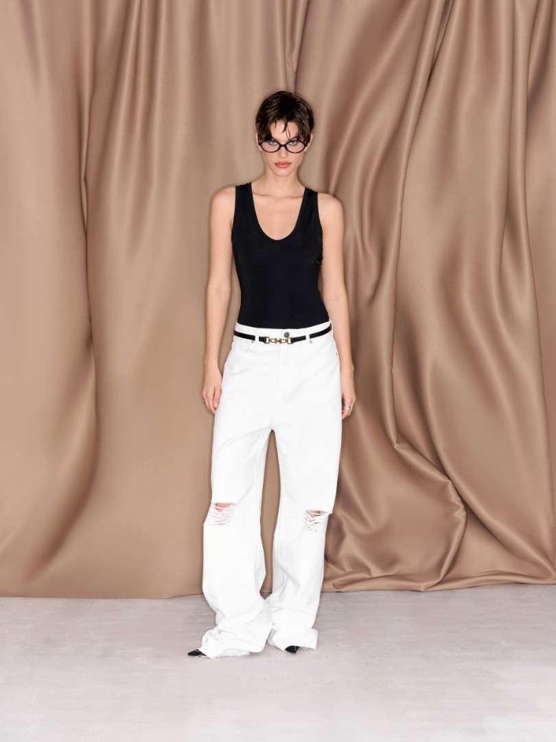 Белые джинсы – идеальный выбор для летнего гардероба. Модель объемного кроя со средней посадкой декорирована разрезами на коленях. Полная длина брючин позволяет сочетать джинсы с разной обувью – от кроссовок до high heels.