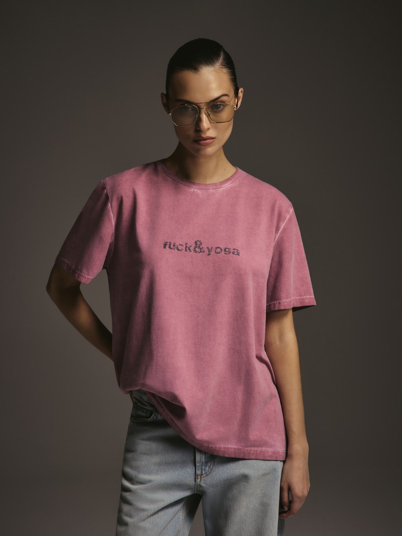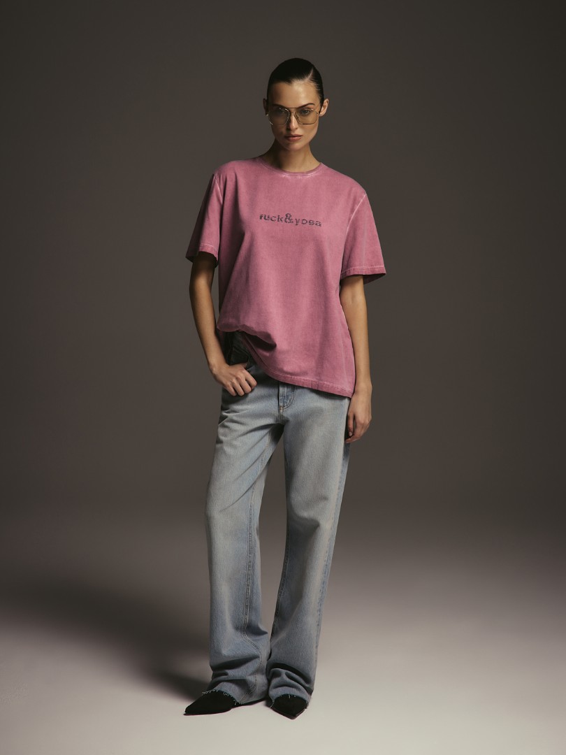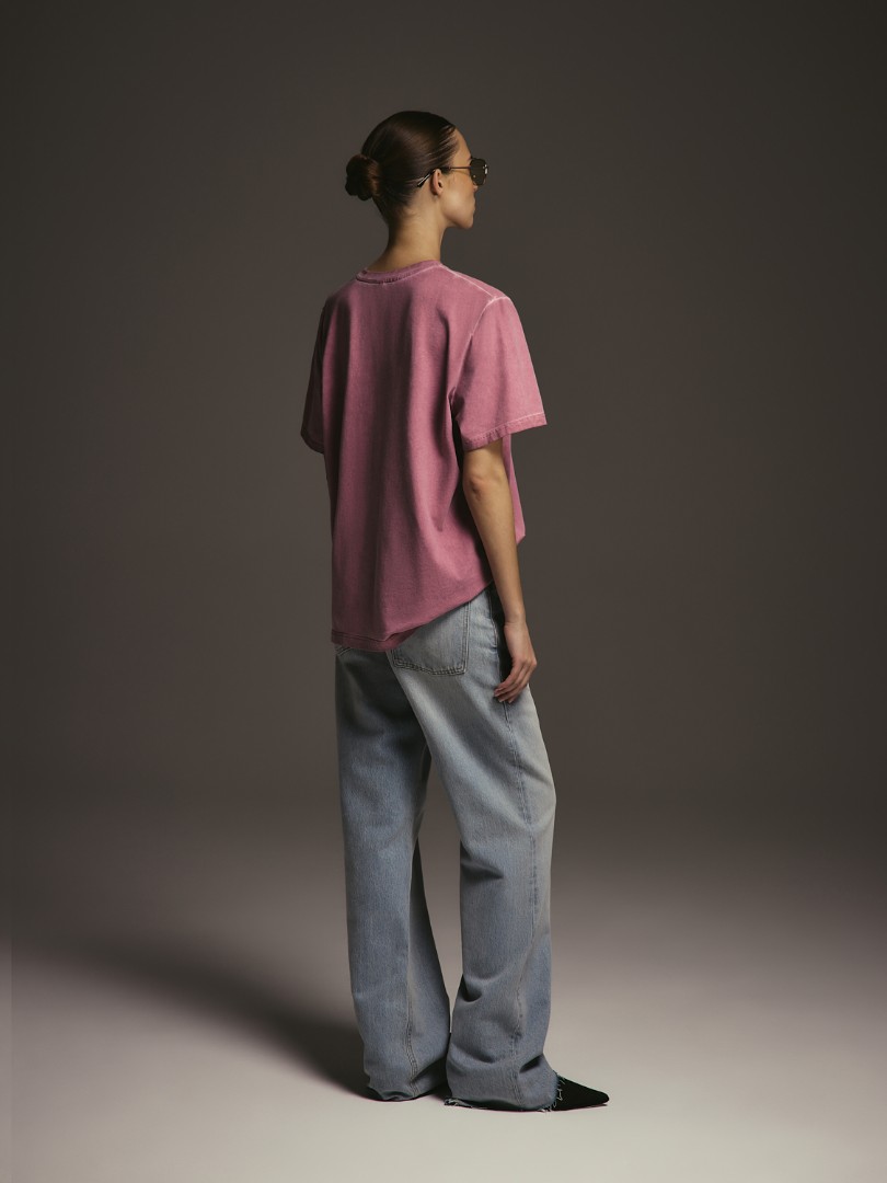 Оверсайз футболка с эффектом washed-out и лаконичным принтом спереди.