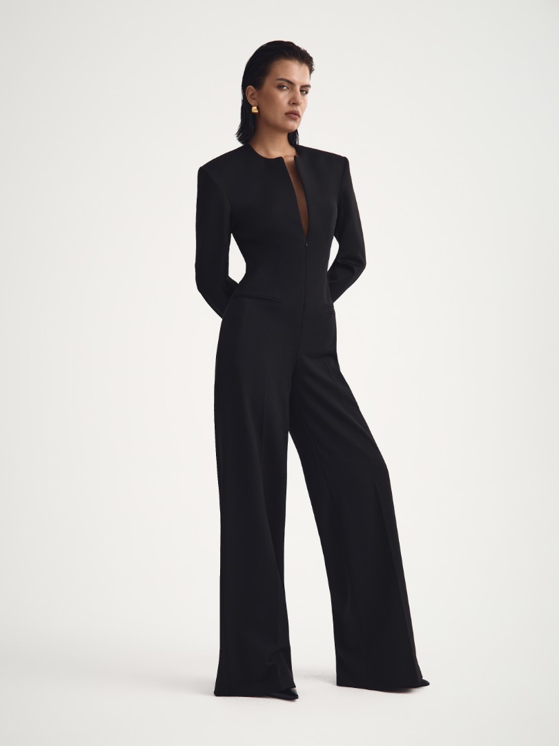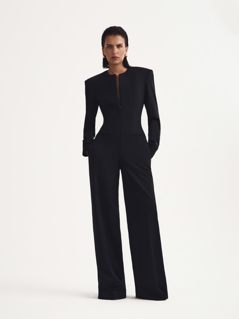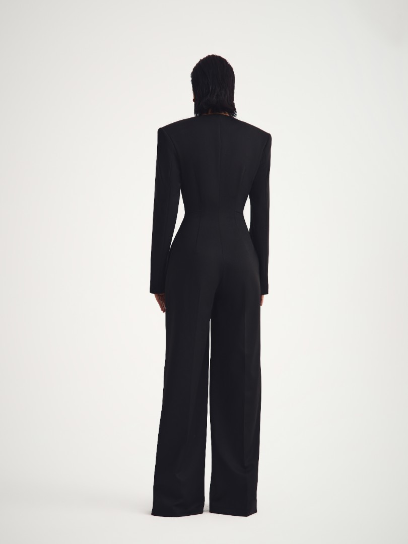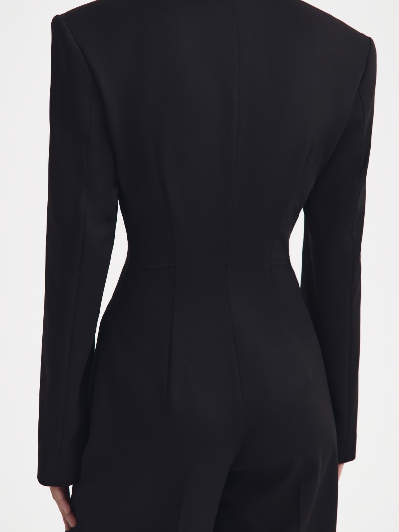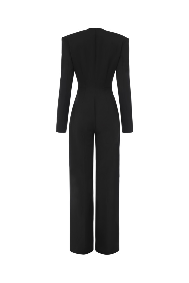 Комбинезон из костюмной ткани с длинными рукавами. Верхняя часть с подплечниками, пуговицами на шлице рукава и декоративными прорезными карманами. Застежка на потайную молнию спереди. Брюки со стрелками по всей длине дополнены карманами в боковых швах.
