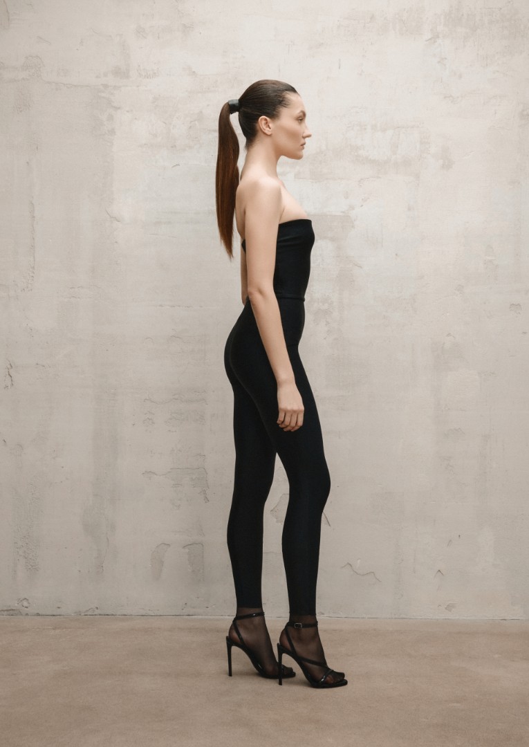 Облегающий комбинезон из плотного эластичного материала с топом-бандо и открытыми плечами. Комбинезон легко интегрировать в гардероб и использовать в качестве базы в многослойных образах или сделать ключевым элементом аутфита.