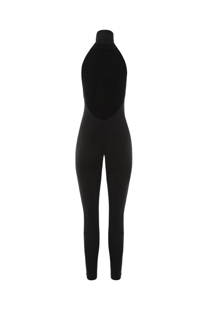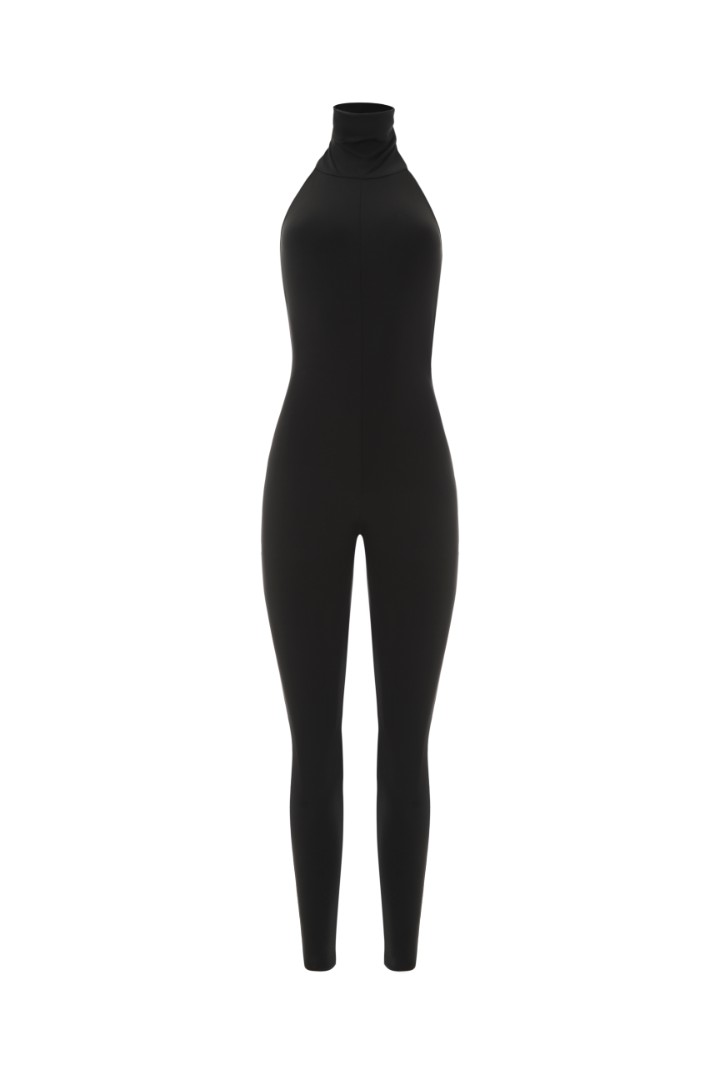 Облегающий комбинезон из эластичного бифлекса. Верхняя часть выполнена в виде топа-халтера с воротником-стойкой и глубоким вырезом на спине. Низ комбинезона – леггинсы с легким моделирующим эффектом.