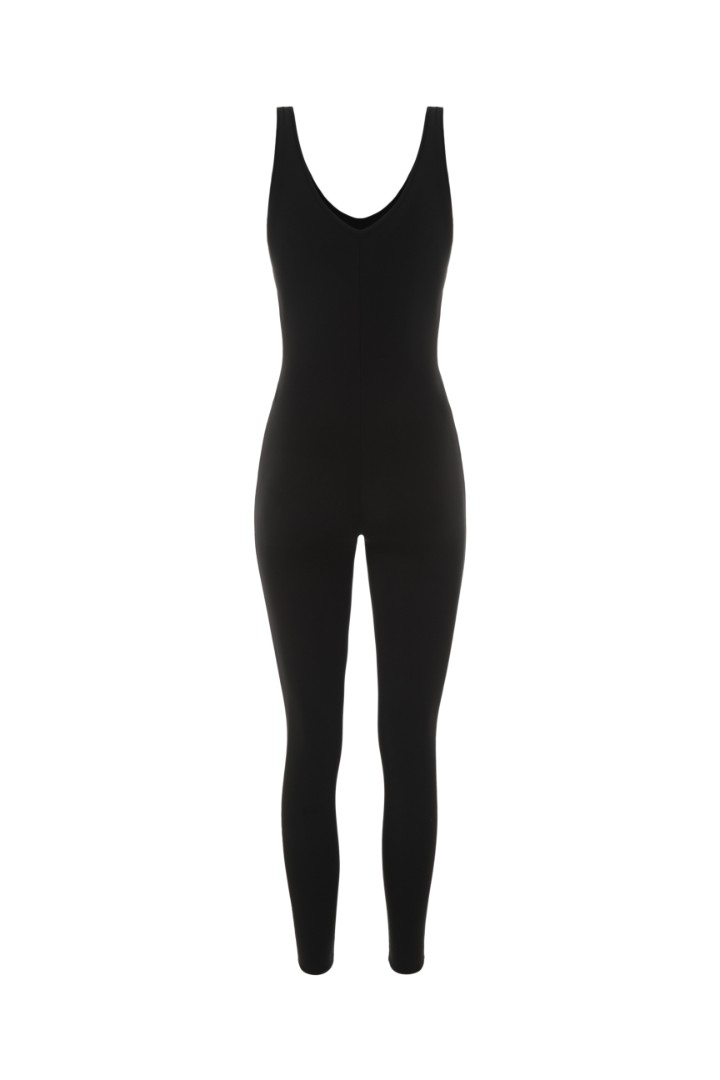 Облегающий комбинезон из эластичного бифлекса. Верхняя часть выполнена в виде топа с глубоким V-образным вырезом на широких бретелях. Низ комбинезона – леггинсы с легким моделирующим эффектом.