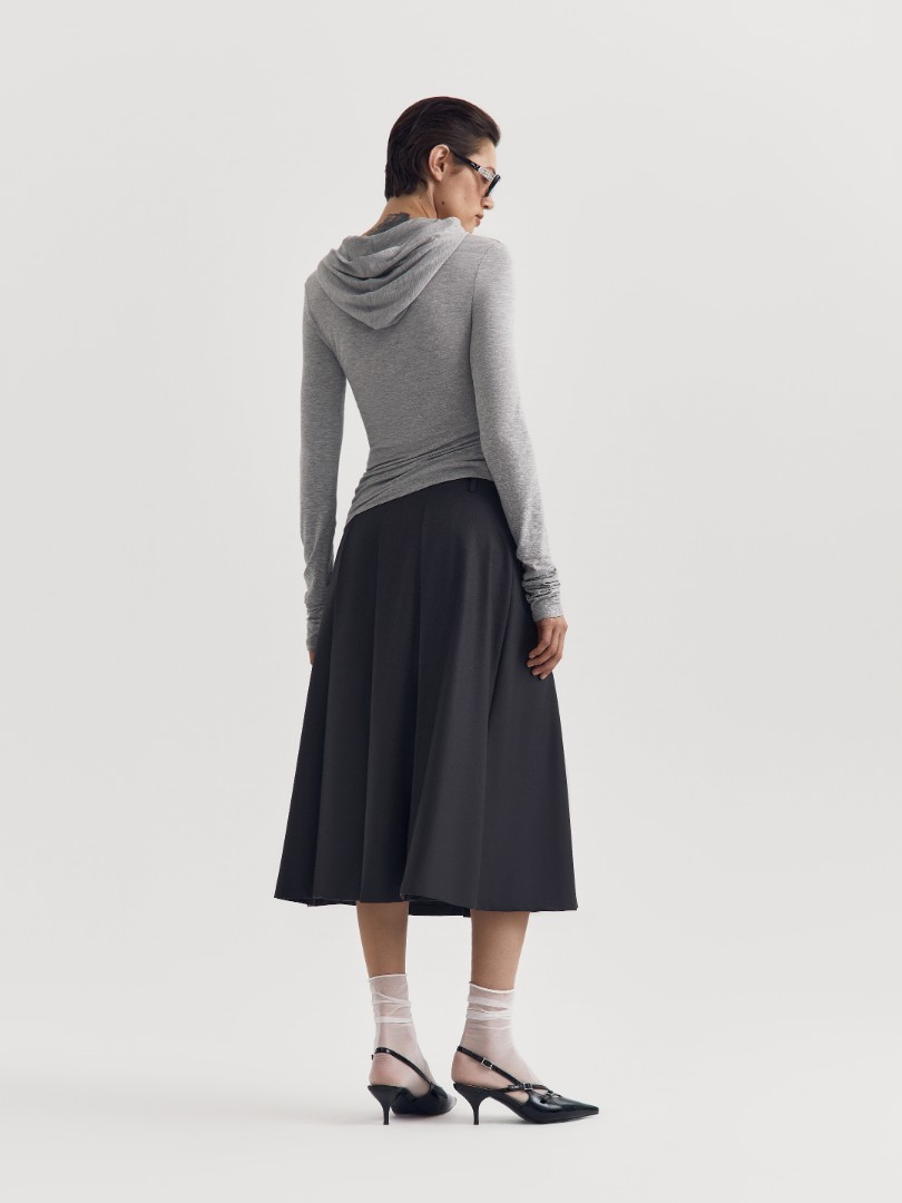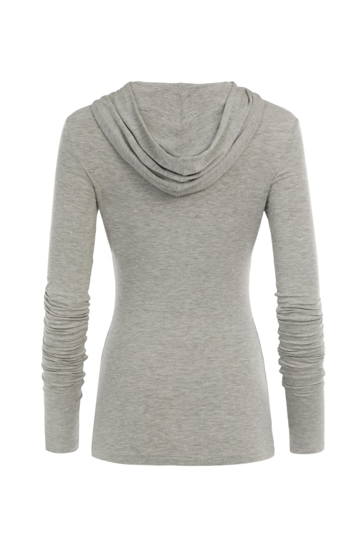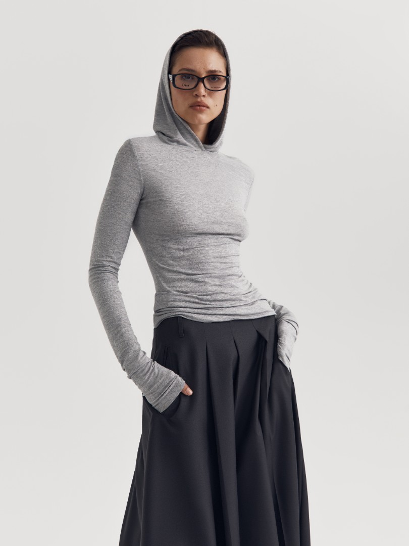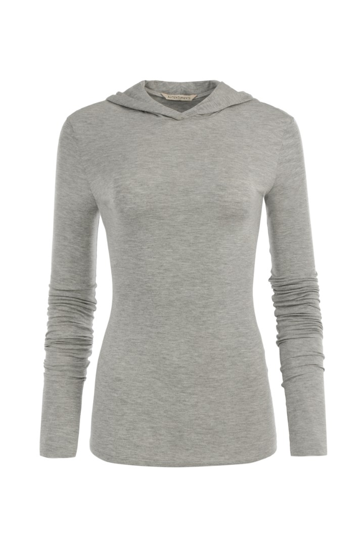 Трикотажный лонгслив облегающего кроя с капюшоном и удлиненными рукавами. Базовую модель в цвете серый меланж легко интегрировать как в повседневные образы с джинсами, так и в более строгие аутфиты.
